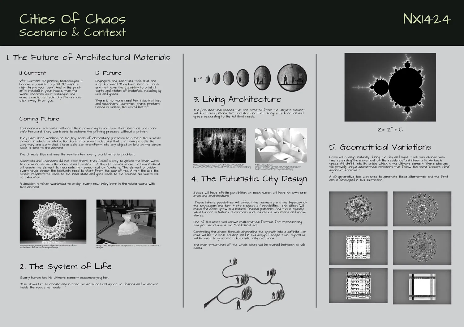 Space will have infinite possibilities as each human will have his own creation and architecture. These infinite possibilities will affect the geometry and the typology of the cityscapes and turn it into a chaos of possibilities. This chaos will make the cities grow in a natural fractal patterns. And this is exactly what happen in Natural phenomena such as clouds, mountains and snowflakes. One of the most well-known mathematical formula for representing this precise chaos is the Mandelbrot set. Controlling the chaos through changeling the growth into a definite formula will be the best solution. And in this design “Escape Time” algorithm will be used to generate a futuristic city of chaos. The main structures of the whole cities will be shared between all habitants.