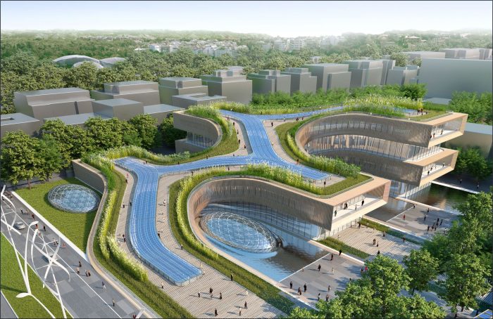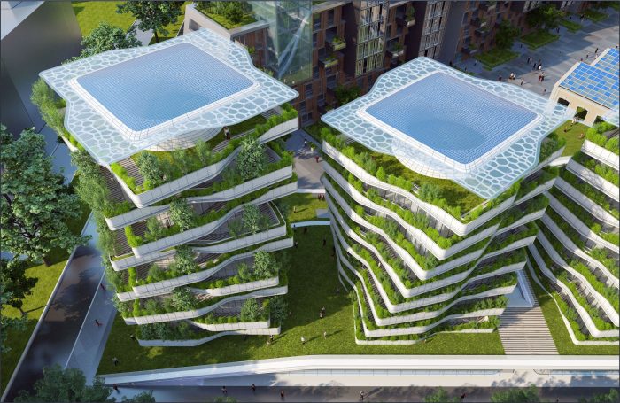 5. Bio-sustainability of urban plants and buildings : The landscape architecture (Land Arch) aims at reaching the following green features : the recovery of rainwater for irrigation of public and private green areas, photovoltaic electricity production, the domestic hot water production by solar tubes, the control of microclimates in public spaces (daylight and shadow), the municipal solid waste recycling on site by biomass, the energy-efficient buildings (treatment of facades with respect to guidance), and finally the lighting appliances with integrated micro-wind turbines.