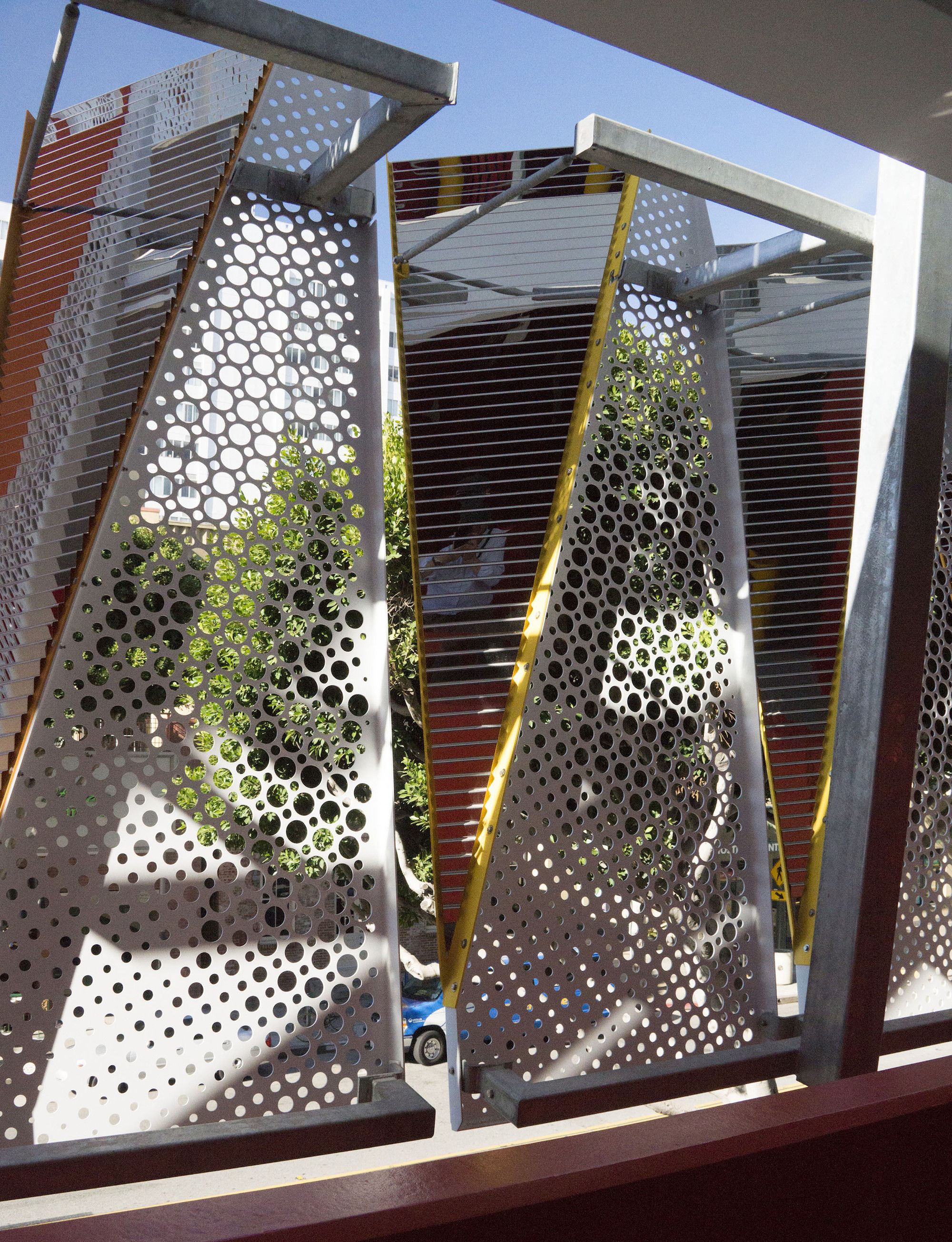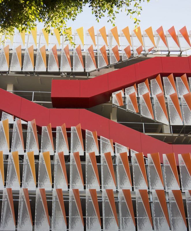 From the street, the highly transparent façade appears busy with the passage of people, and the constant ever-changing backdrop of cars. The façade not only provides a functional lighting aspect for the parking structure, it also creates a strong identity, enlivening the streetscape.