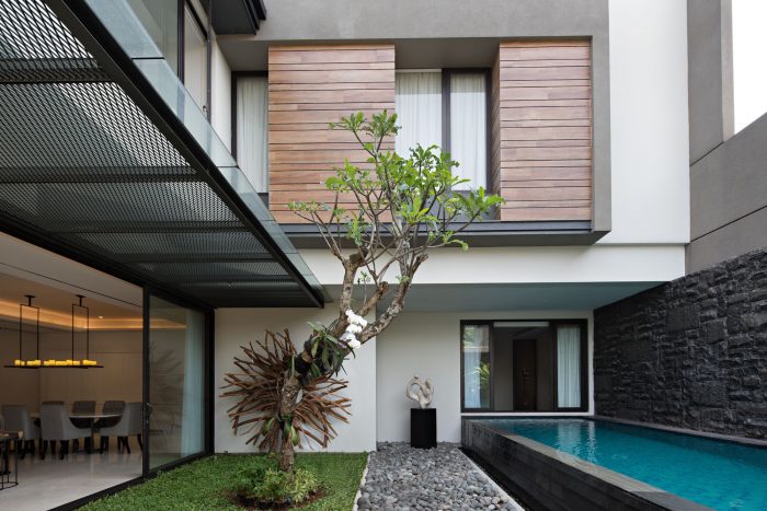 CL house is located in South Jakarta and built on 425 sqm. It is located near a crowded junction and commercial area. Privacy is the main request concern from the client. Pinhole glass concept is applied on the house’s facade. Residence may see the surroundings by the holes of the facade but outsiders may not see through in.