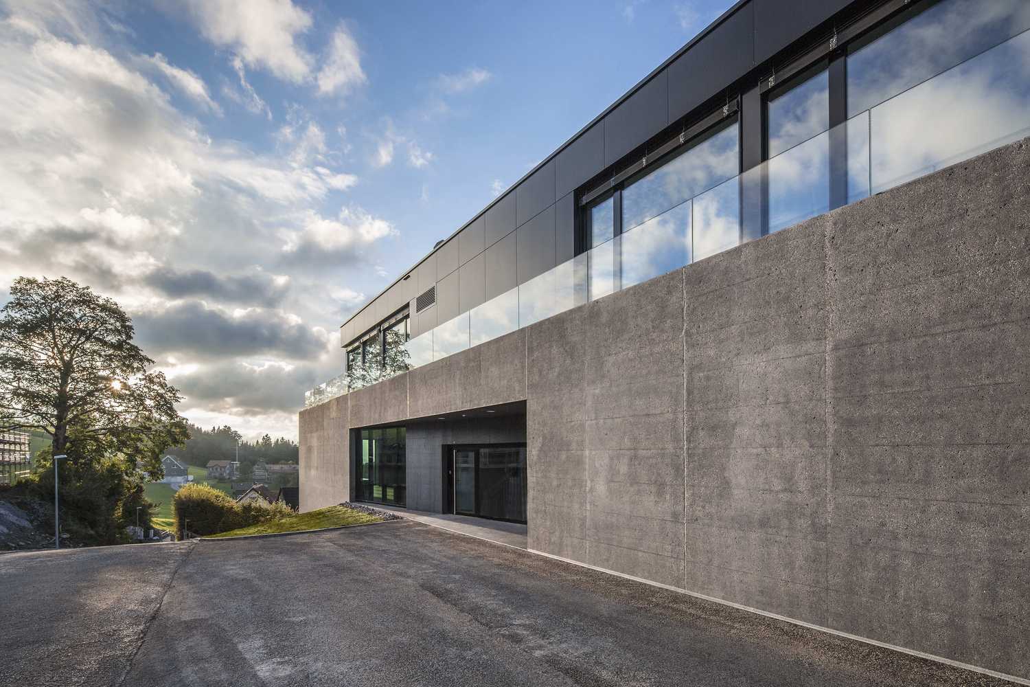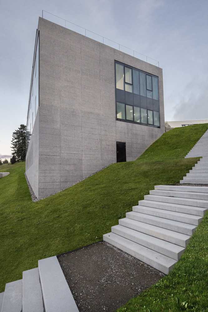 Designed by Carlos Martinez Architekten, The design of the Ophthalmic Clinic was focused around importance of the historic heritage of the site. Wherein the battle of Vögelinsegg in 1403, the people from Appenzell, Switzerland attained their independence. Out of this significance, a rock-like volume was developed that reminds of the steadiness of earlier times.