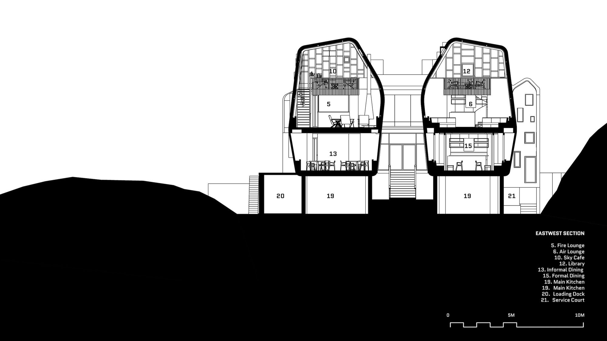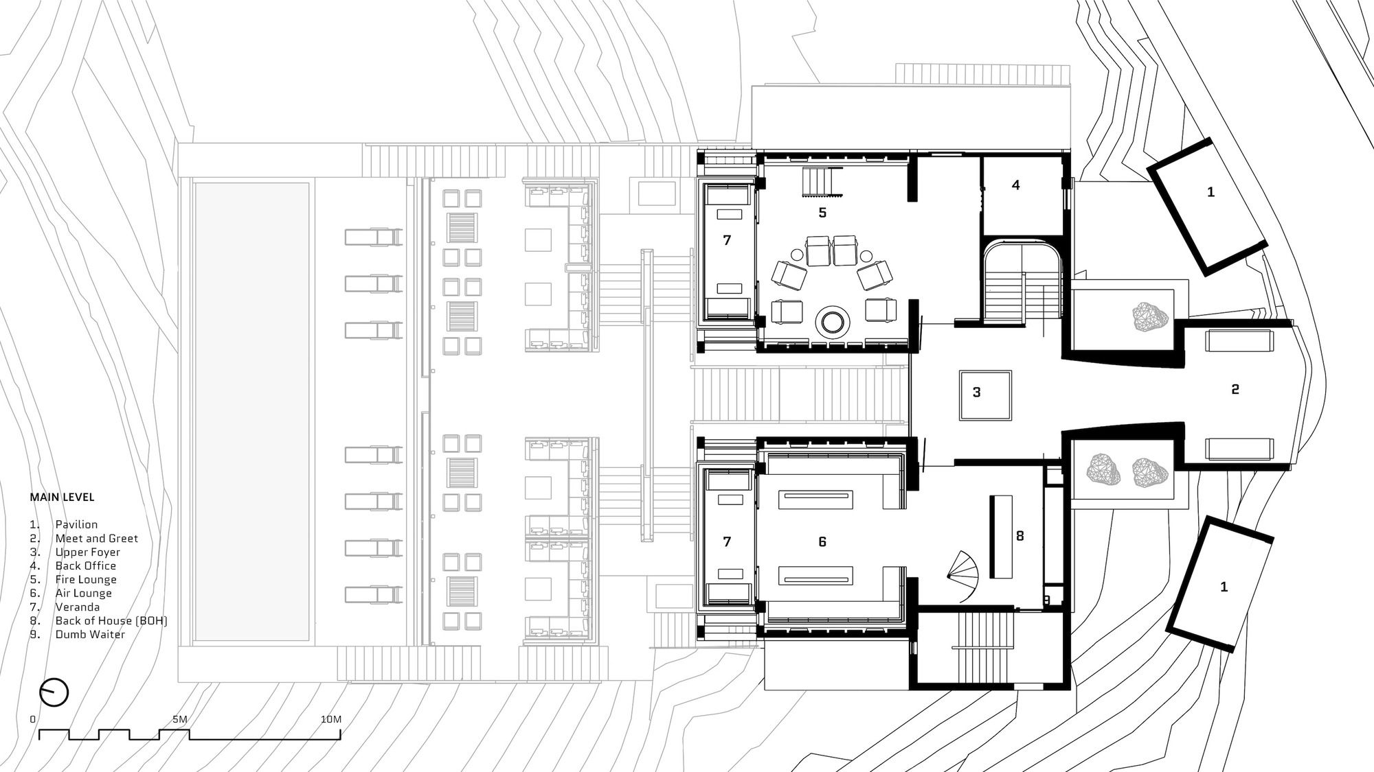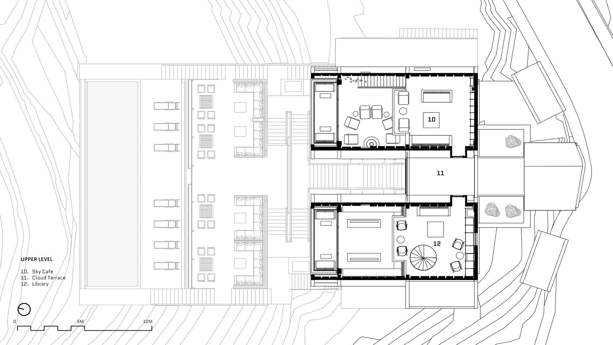 The Cloud Catcher building choice enables the natural surroundings to punctuate and complement the architectural elements while providing unobstructed views and natural ventilation within the interior spaces. The primary level of the Cloud Catcher building is dedicated to welcoming areas and includes adjacent attic-style spaces, serving as a cloud café and library. The lower levels house dining rooms are positioned directly above the central kitchen. From this vantage point, a series of cascading steps leads to the open-air area and, subsequently, the pool terrace.