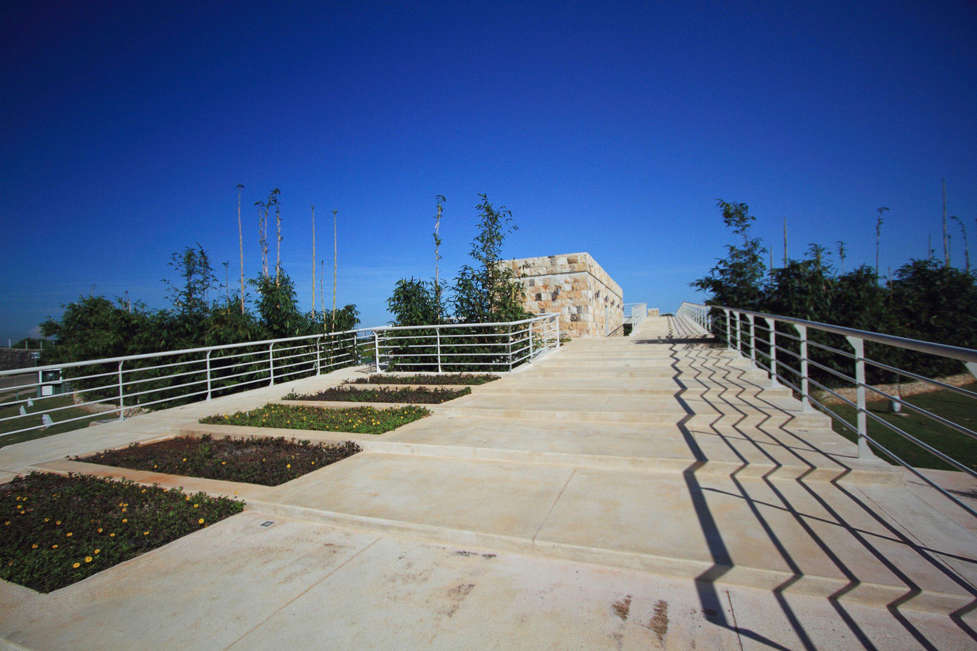 The slopes of the ascendant plaza and their ramps allow wheelchair access to the whole complex.