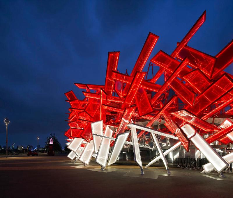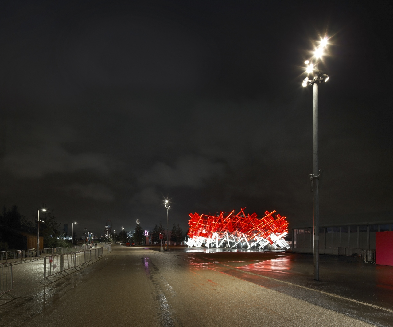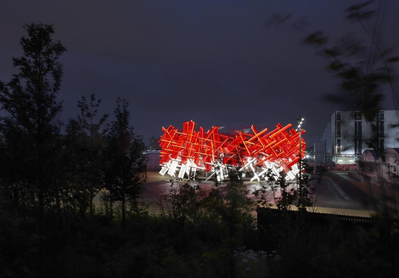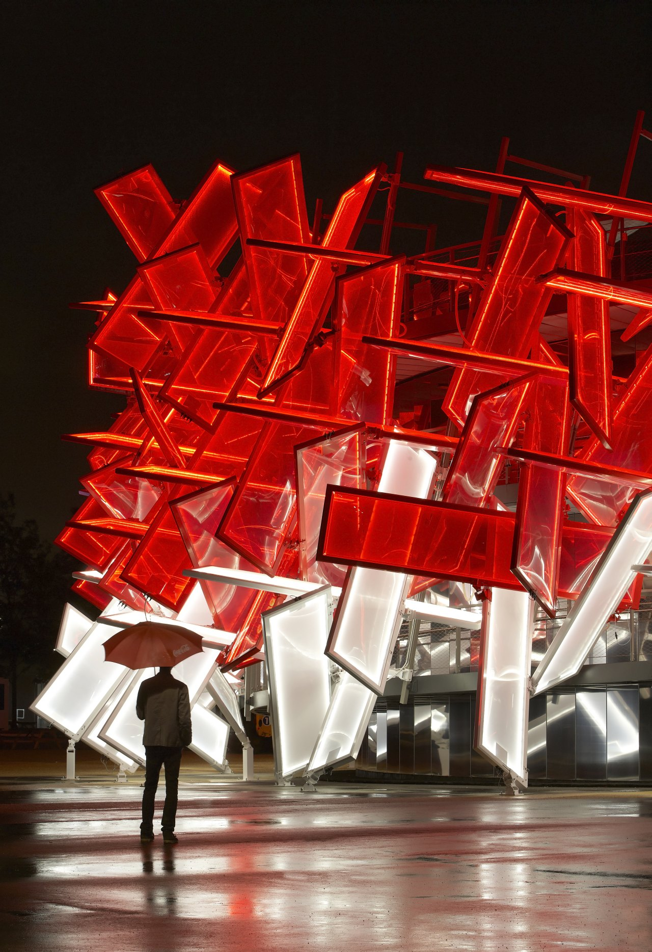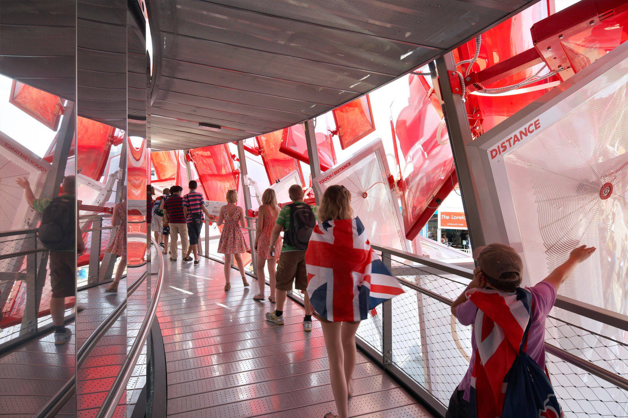 The fragmented and chaotic façade of the Coca-Cola Beatbox illustrate motion and energy, honoring the rebellious independent lives of today’s youth. Designers Pernilla and Asif wanted to create a piece of architecture that was more than a shelter, being also a musical instrument that can be played, allowing human interaction while providing music throughout the entire Olympic park. Ideally when people approach and touch the interior cushioned walls of the pavilion a series of different pre-recorded sounds will be produced so the users can use their creativity and remix their own tunes.