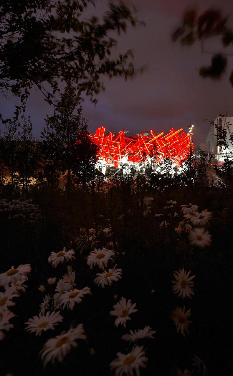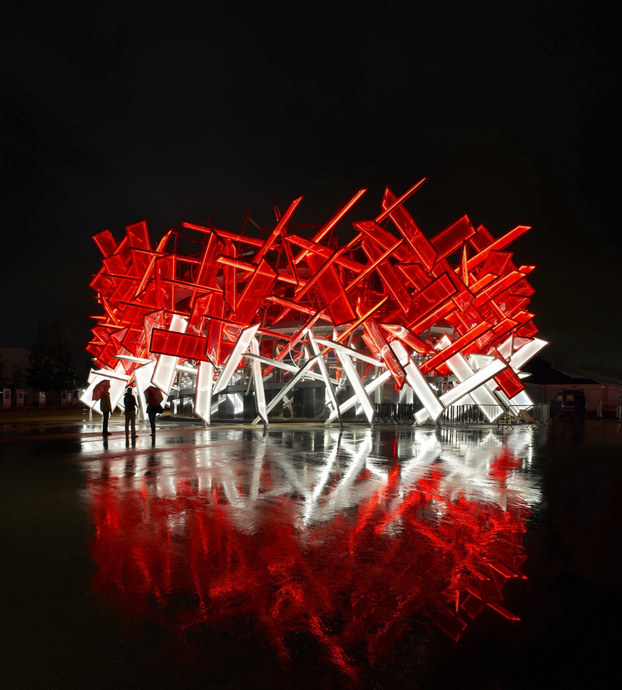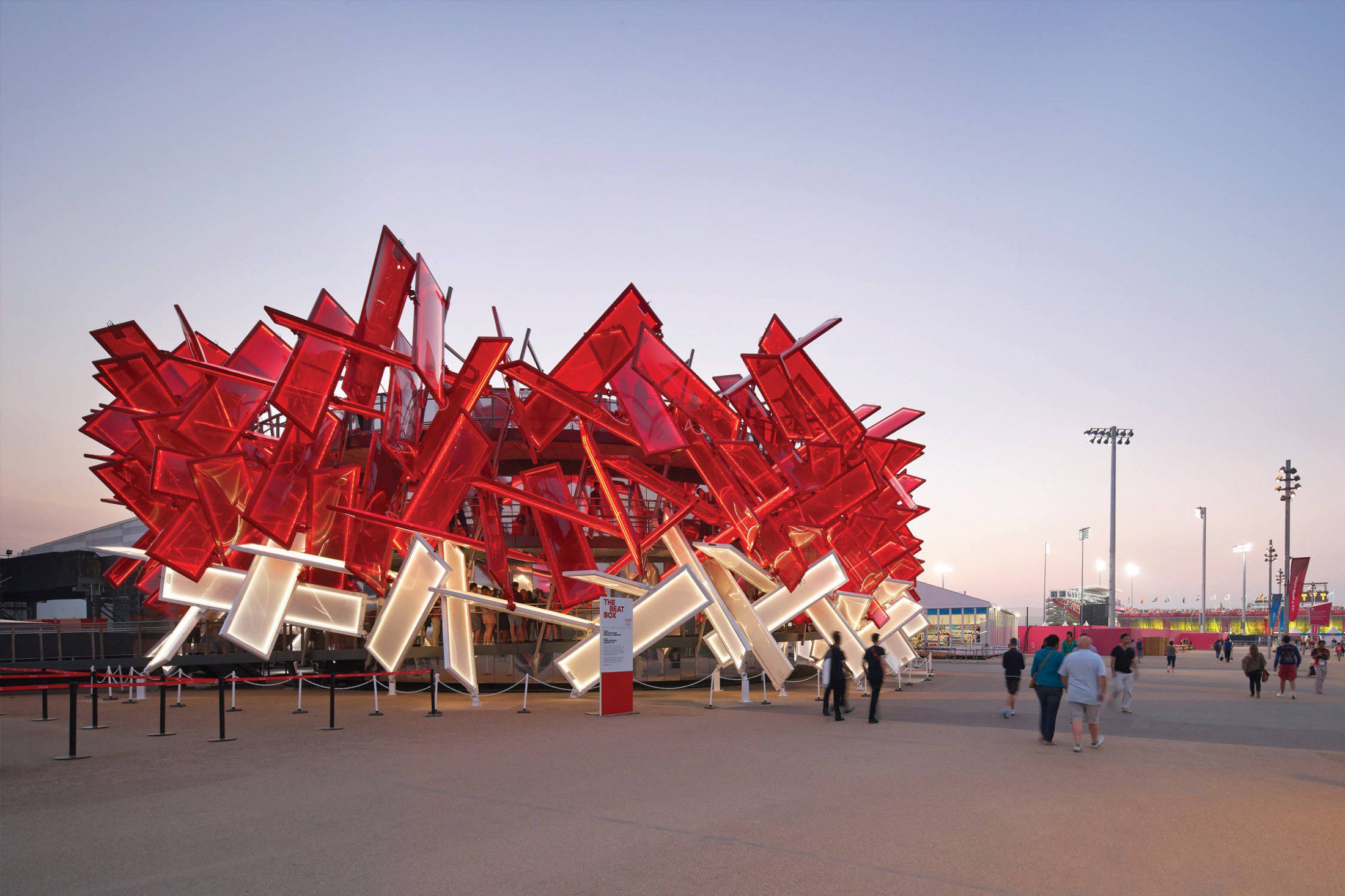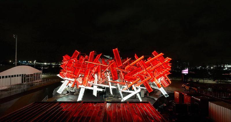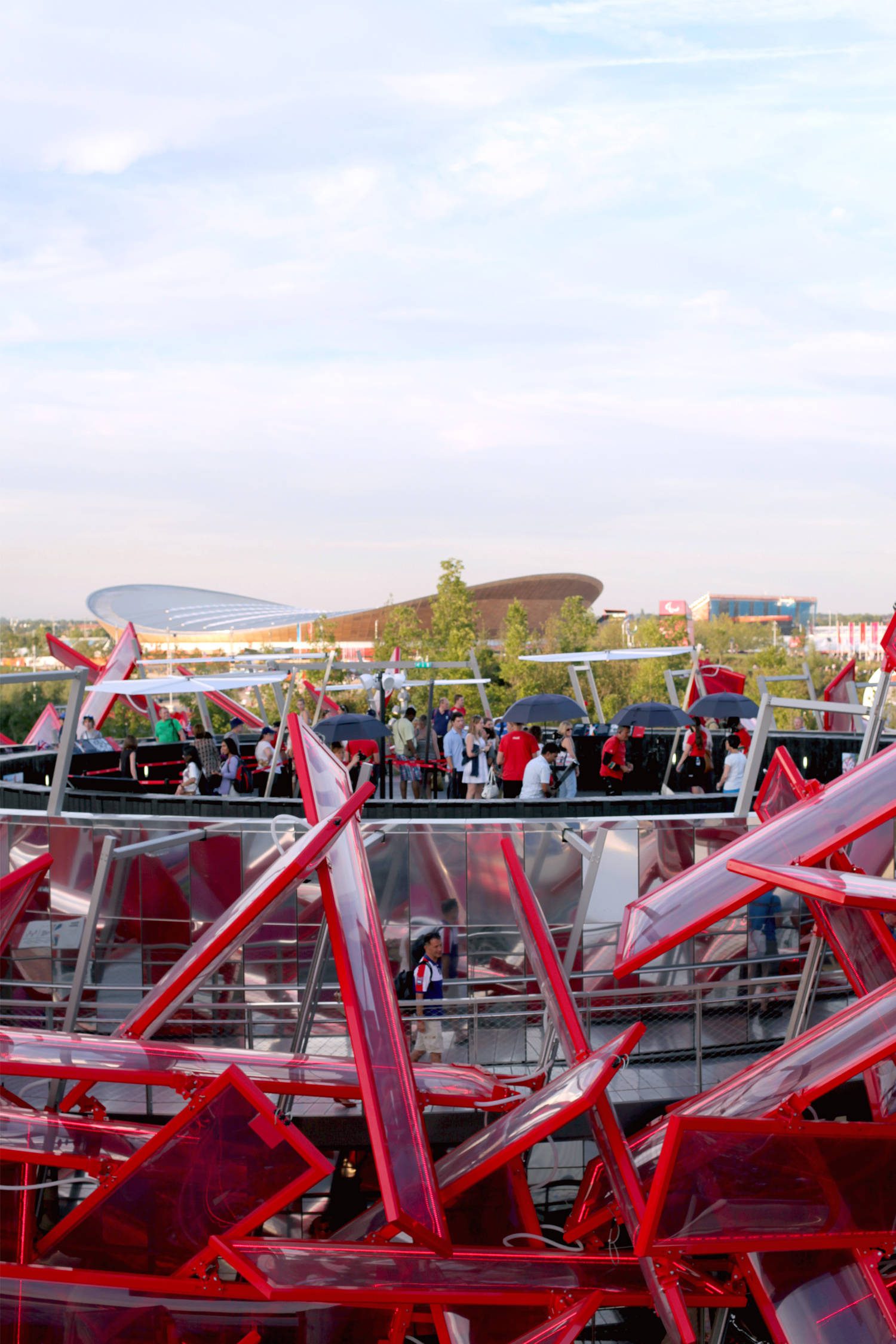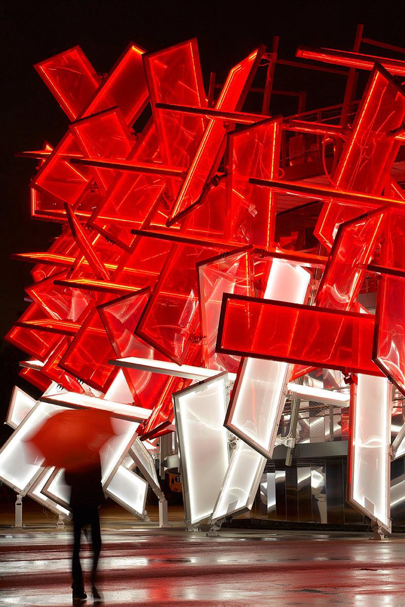 The fragmented and chaotic façade of the Coca-Cola Beatbox illustrate motion and energy, honoring the rebellious independent lives of today’s youth. Designers Pernilla and Asif wanted to create a piece of architecture that was more than a shelter, being also a musical instrument that can be played, allowing human interaction while providing music throughout the entire Olympic park. Ideally when people approach and touch the interior cushioned walls of the pavilion a series of different pre-recorded sounds will be produced so the users can use their creativity and remix their own tunes.