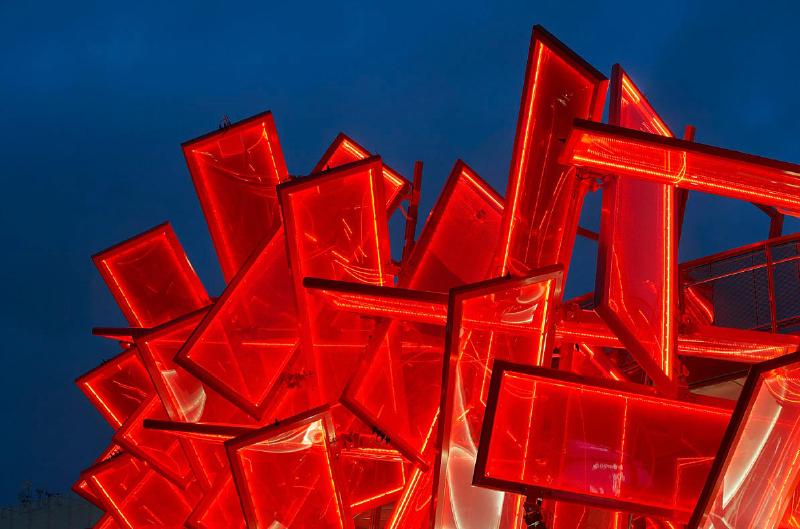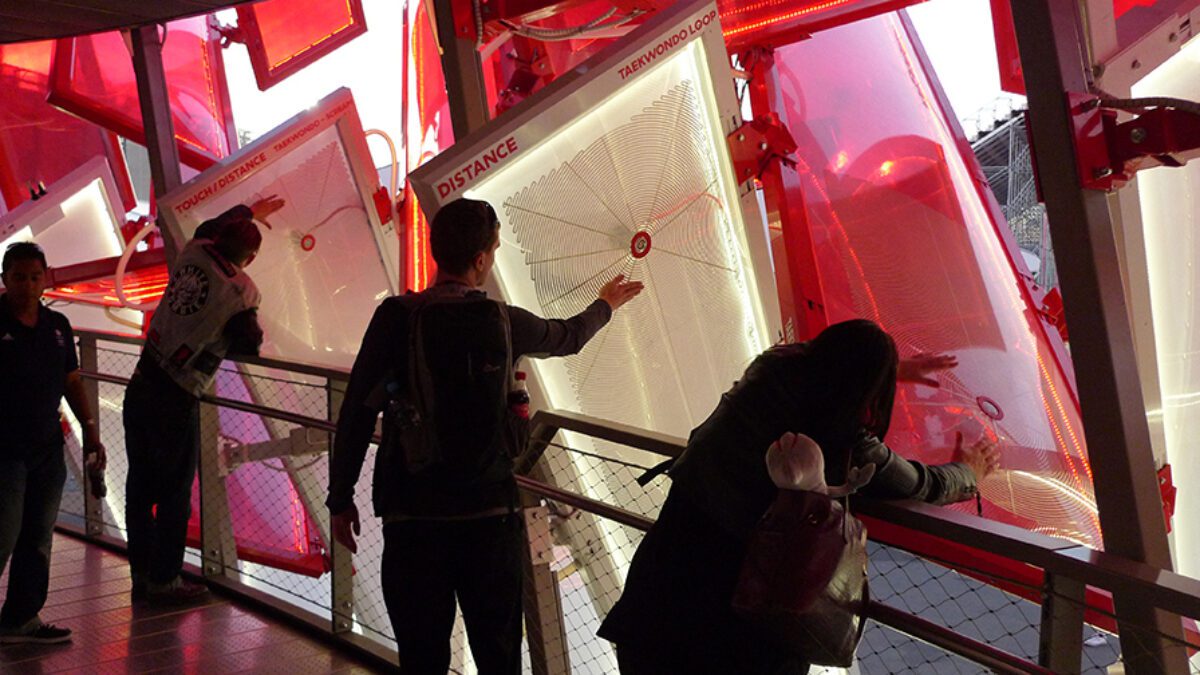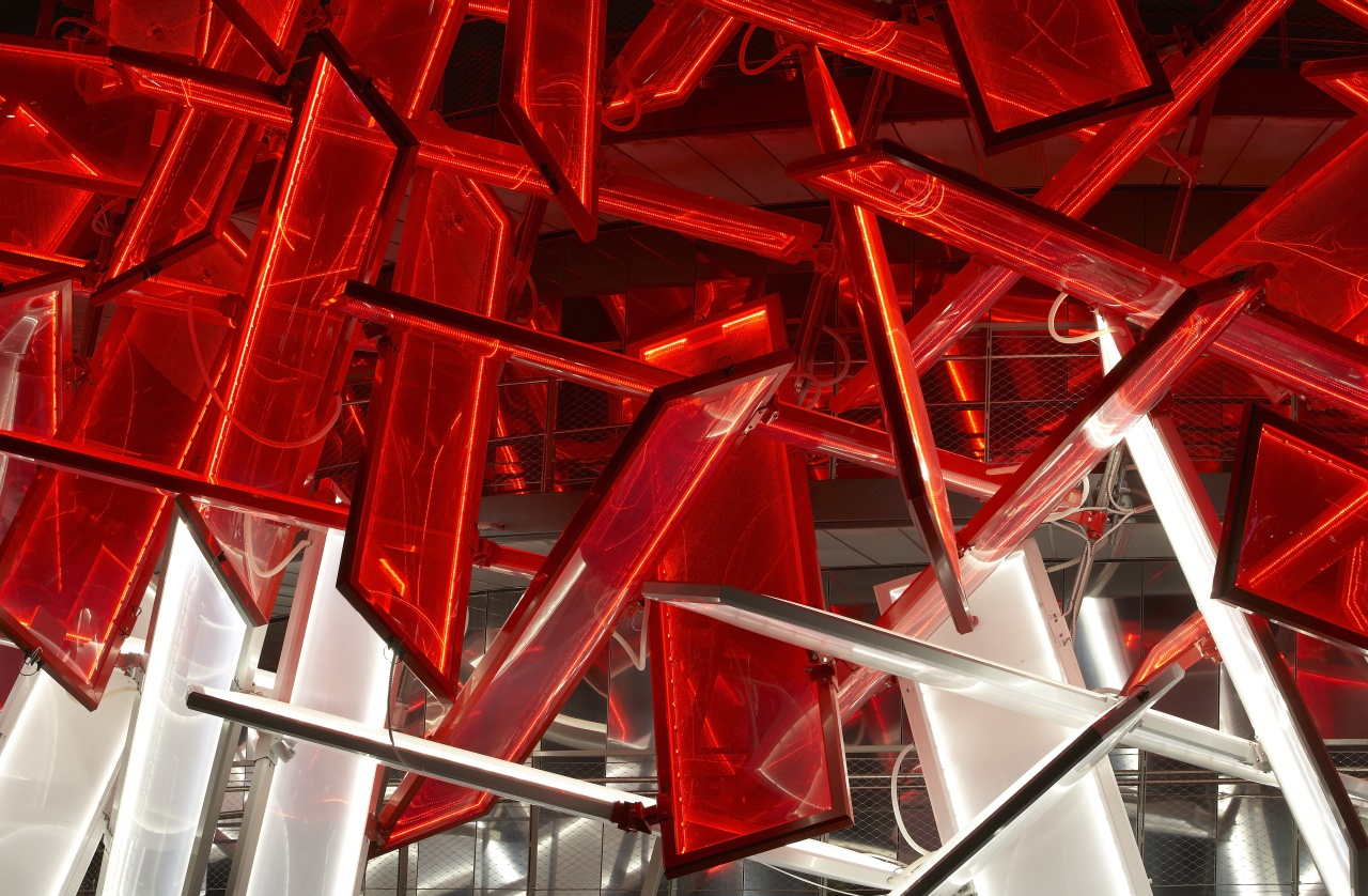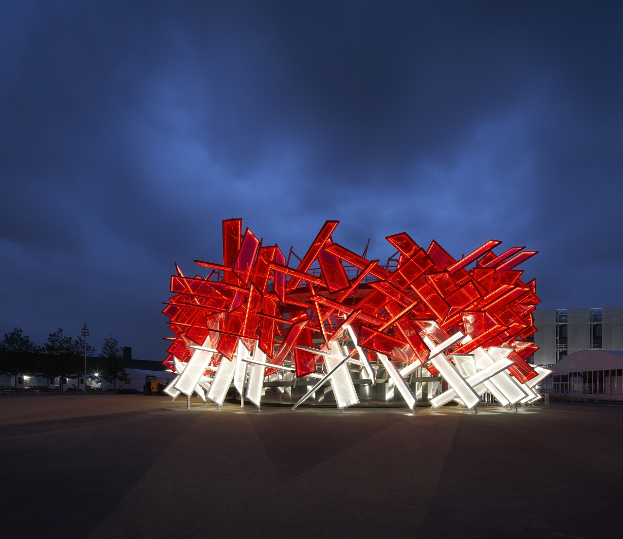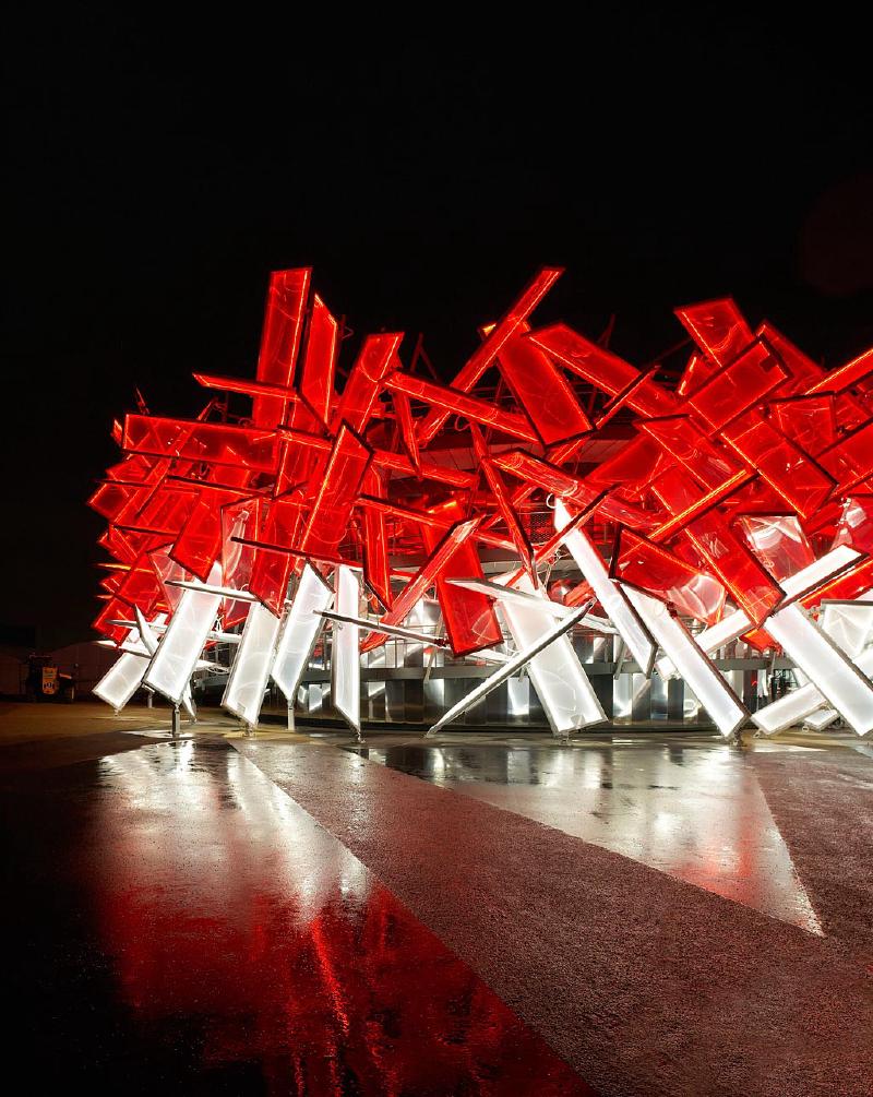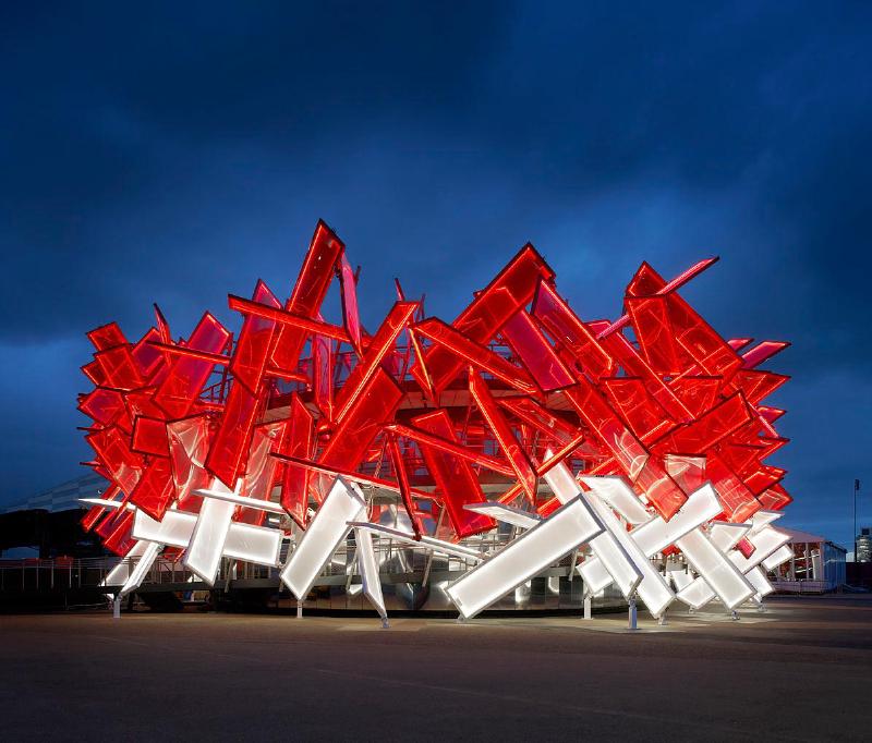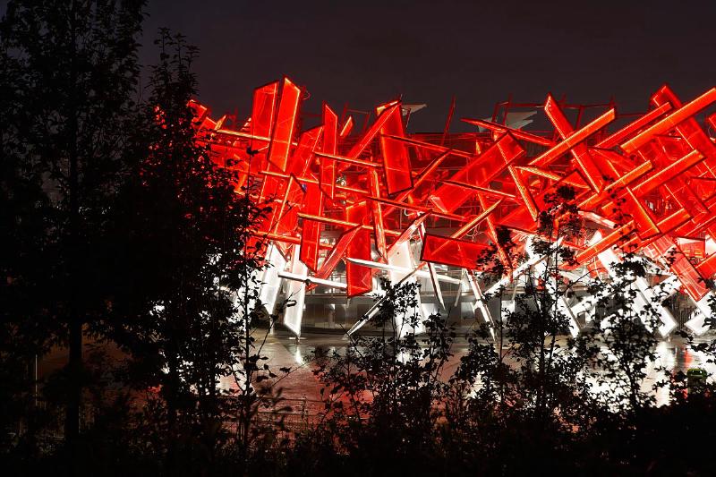 The fragmented and chaotic façade of the Coca-Cola Beatbox illustrate motion and energy, honoring the rebellious independent lives of today’s youth. Designers Pernilla and Asif wanted to create a piece of architecture that was more than a shelter, being also a musical instrument that can be played, allowing human interaction while providing music throughout the entire Olympic park. Ideally when people approach and touch the interior cushioned walls of the pavilion a series of different pre-recorded sounds will be produced so the users can use their creativity and remix their own tunes.