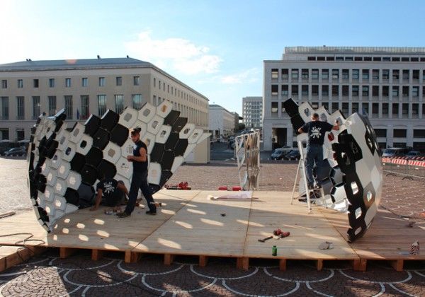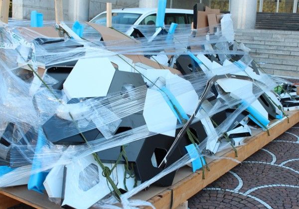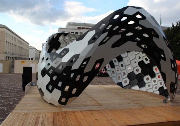 Its ring-shaped form utilizes Etalbond panels to not only give it structure, but also to attain the installation’s seamless aesthetic quality. The faceted surface is emphasized with the black and white coloring which also manages to highlight the individual panels that make it up.