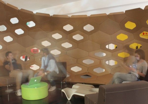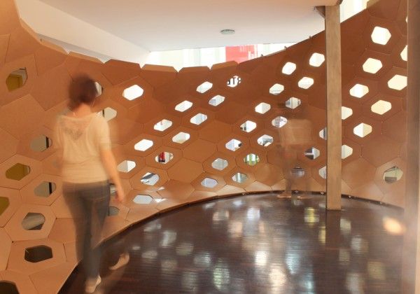 The system provides the fins, for each side of the hexagon, that can then be folded onto each other at a perfect 45 degree angle thanks to the cutter. Cocoon has been designed as a continuation of the opposite bookshop and formalized as an organism that wants to prevail on the room that receives it, and want to show through the glass walls that surround it.The participants to the workshop, once defined the area in Rhinoceros, have learned how to divide in hexagons in a complex surface and planarize the panels obtained, in order to make them printable, in straight line, by a cutter. Once optimized planar components of the surface, has been studied the generation of the pattern to be applied to the ring, with the intent to lighten the structure and create a permeability between interior and exterior space.