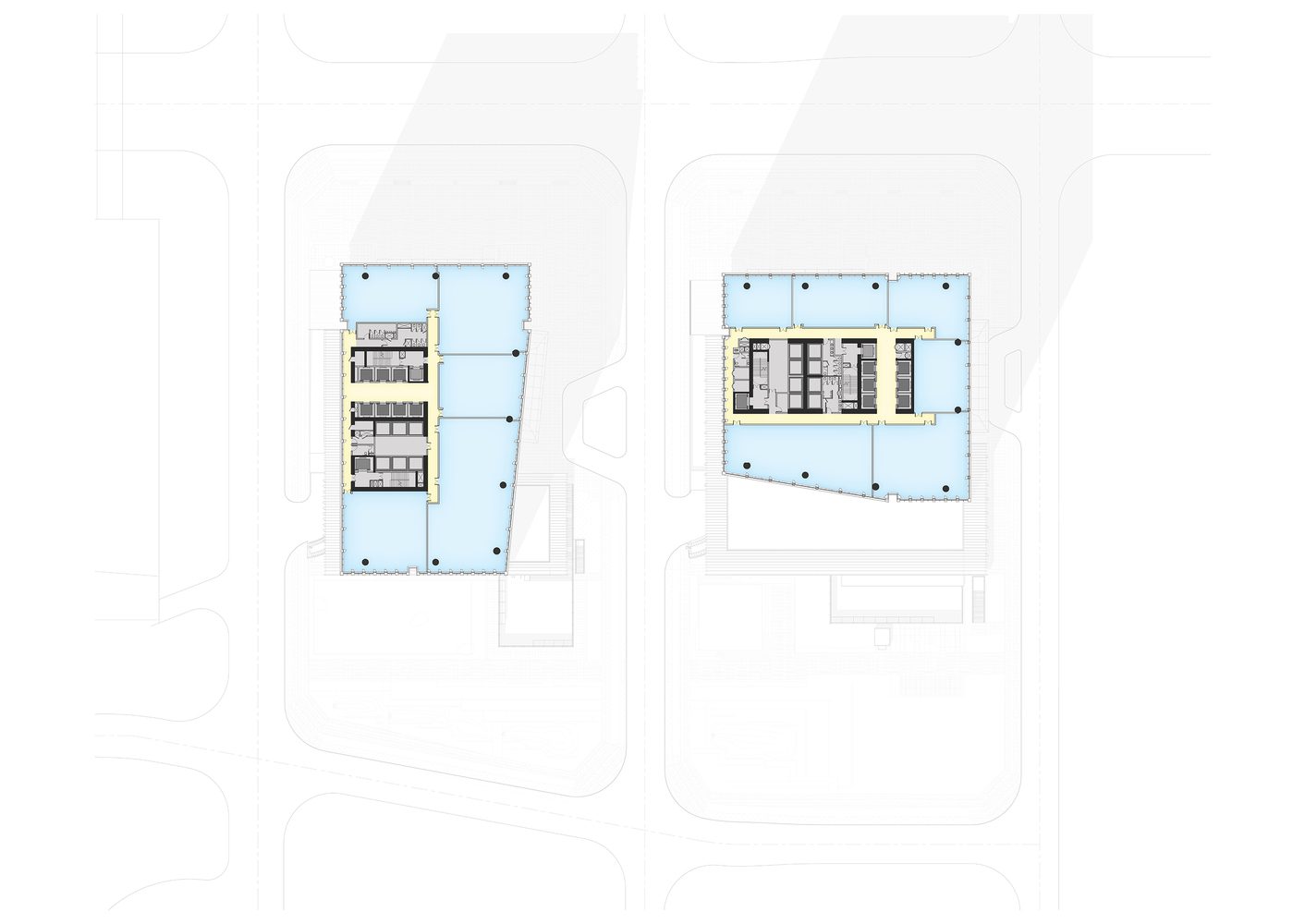 The COFCO Qianhai Innovation Center is a state-of-the-art headquarters and multi-tenant office complex located in Shenzhen, China. This 190,000-square-meter development is defined by two nearly identical towers, each crowned with a large, glass-enclosed atrium. These atria provide unique identities in the skyline for the headquarters of two related companies: COFCO Group and Aviva-COFCO Life Insurance. The respective 200- and 180-meter towers are composed of three slender masses where the upper levels are carved back and exposed to reveal the open atrium and separate outdoor sky terrace that connect to the surrounding cityscape. Sited next to an urban green belt and local park, the towers are oriented to address this context and integrate closely with the natural environment. The buildings are rectangular in plan, with one side tapered to expand views toward Qianhai Bay.