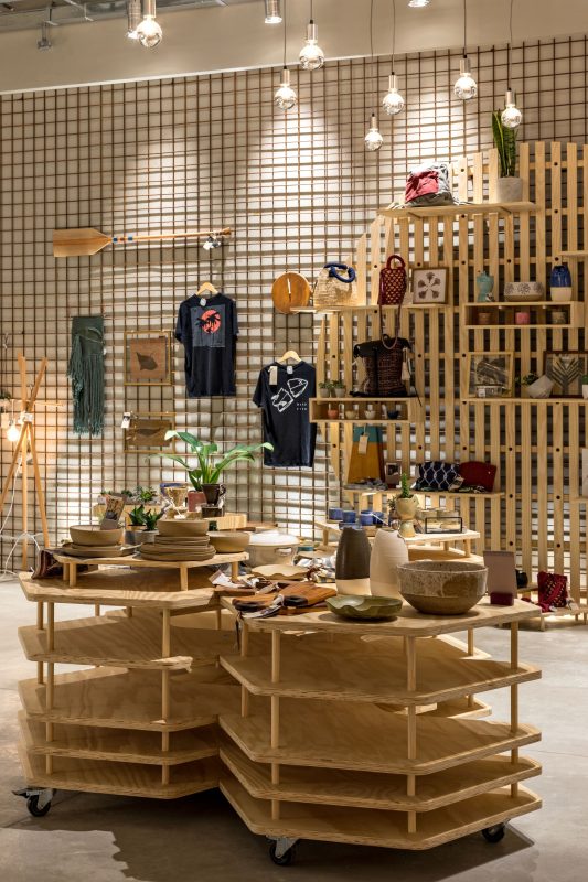 At this spiral shelf and dream catcher setting, craft products are available, from a selection curated by the Casa Manual team – from clothing to utilities, household items, toys, cosmetics, and much more. Surrounding this scenario, there are multiple-function areas, articulated between them and called “ocas do Fazer”[creative huts], which aim to emotionally connect the visitor to references in the outside.