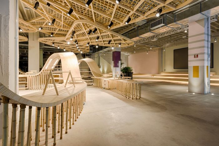 “Experience-environments are the future for architecture and design,” says designer Fabio Galeazzo, creative director of the Galeazzo Design studio, who, called architect André Nucci and surface designer Dani Gautio, to act as co-creators to Espaço Colletivo – Casa Manual,. Together, they created a space of approximately 1800 m2 at the ground floor of Morumbi Shopping, with apparent structures showing imperfections on the walls, as well as the hydraulic, electric, and air-conditioning infrastructure. Furniture and structure mainly used wood, plywood, bamboo, and iron bars. Old walls were replaced by glass, bringing the movement and day-and-night lights into the site, and vice-versa. Retaining walls, with an irregular surface and showing the marks of bricks and blocks, pastel-colors were used in contrast with hot colors. Little by little, these walls were filled with murals created by artists, which surprise mall clients, on a weekly basis. The idea is to have an ever-changing space.