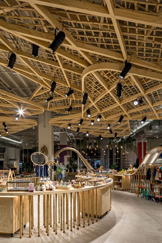 After investigating primitive spiraled movements, the Galeazzo Design team was inspired by typical indigenous dances in Brazilian culture where, at the central square, the natives dance towards the center, creating a spiraled line. Huts (in Portuguese “ocas”, typical indigenous homes) were distributed around this center. Thus, like typical indigenous architecture, space was though and created from the center outwards, where the large spiral shelf, built in plywood and held by over 700 bamboos, is floating, getting attention from all the enter the area and inviting each person to create its own story following interaction with space.