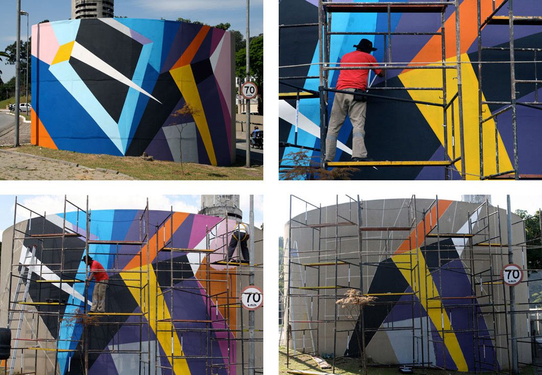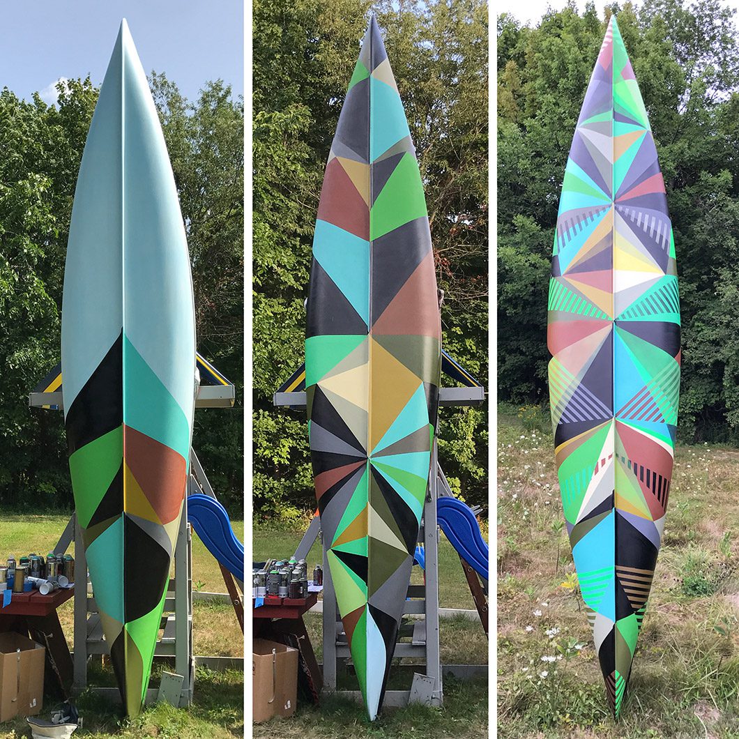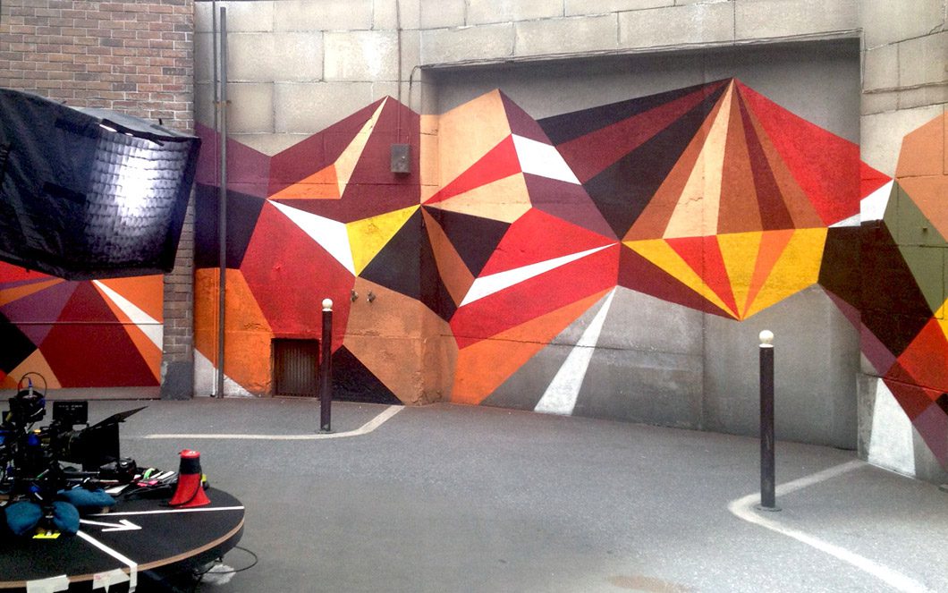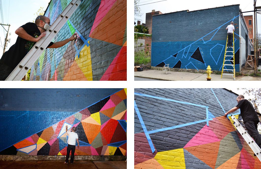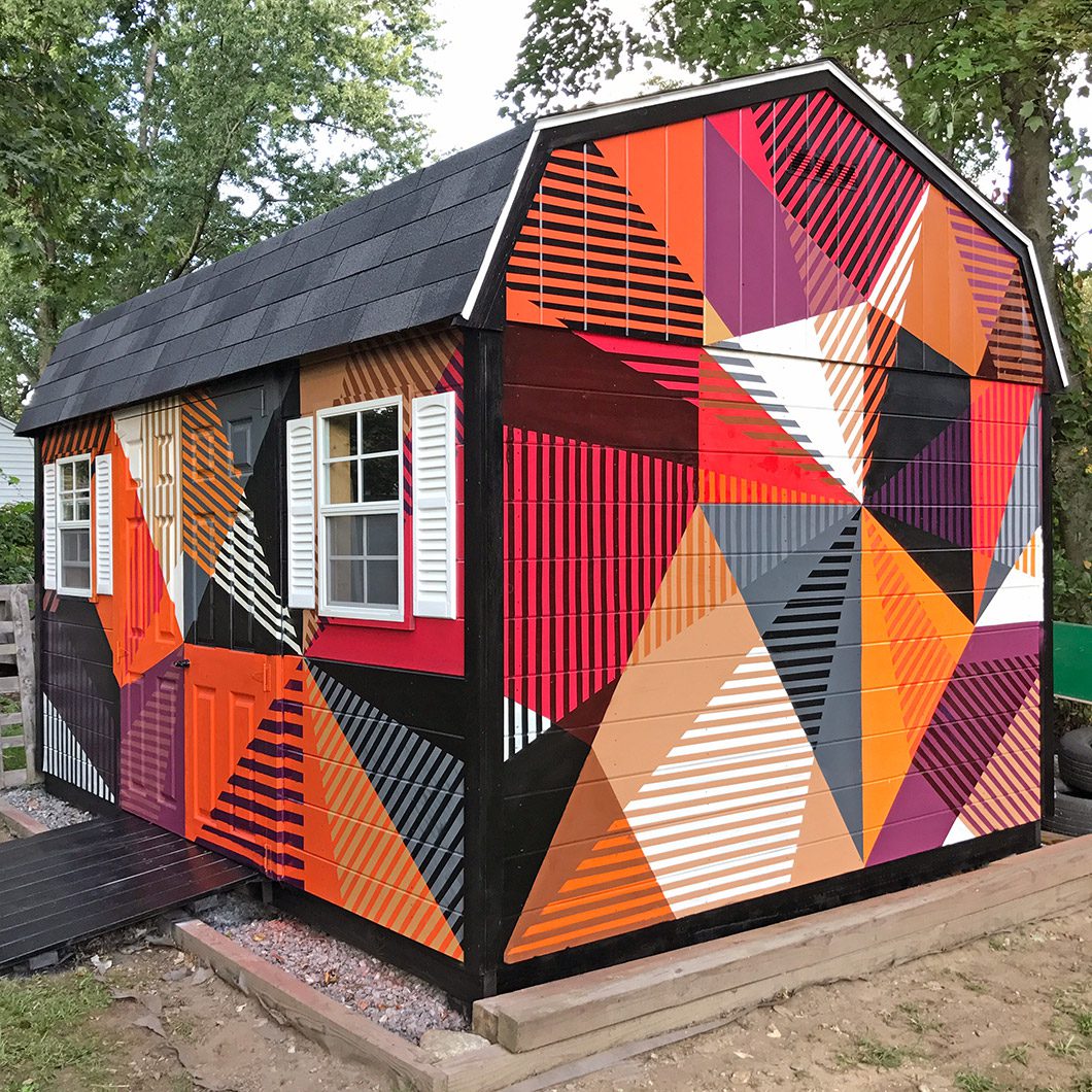 To realize work at this scale and to have it coherent, I would imagine that Matt W. Moore has to see the big picture before painting. Beyond that, it requires exceptional skills to keep that bigger picture in mind while realizing the painting.His work can be identified by bright colors and geometric patterns to produce an optical-illusion-type artwork. The paintings bring movement and liveliness to a place. Sitting here and looking at photographs of his work, I can stare at an otherwise 2D static object and have my eyes moving back and forth across the painting, seeing more and noticing more as time goes by. I can only imagine that seeing his work in person would be far more captivating.