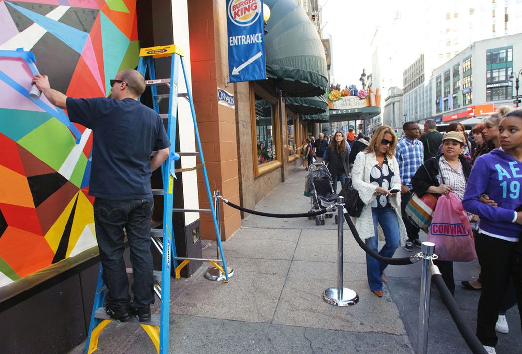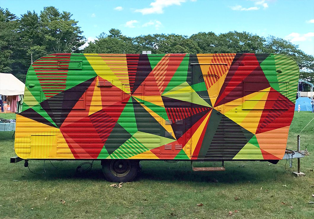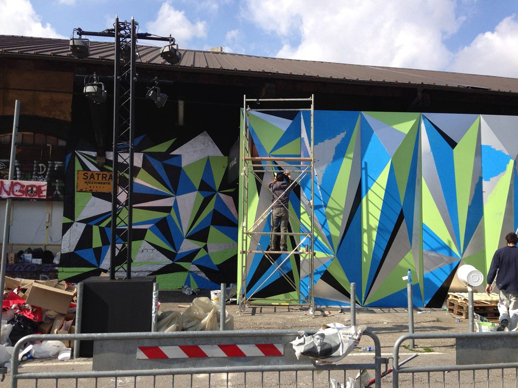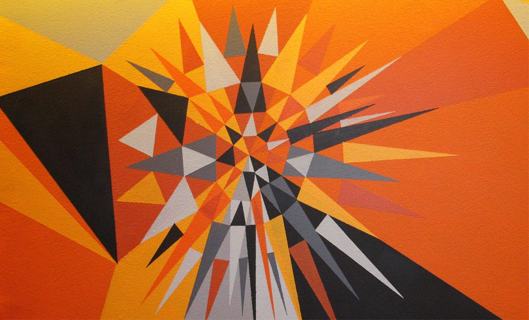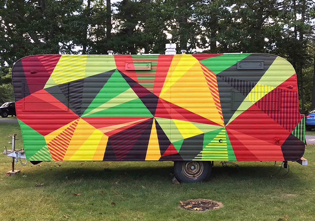 To realize work at this scale and to have it coherent, I would imagine that Matt W. Moore has to see the big picture before painting. Beyond that, it requires exceptional skills to keep that bigger picture in mind while realizing the painting.His work can be identified by bright colors and geometric patterns to produce an optical-illusion-type artwork. The paintings bring movement and liveliness to a place. Sitting here and looking at photographs of his work, I can stare at an otherwise 2D static object and have my eyes moving back and forth across the painting, seeing more and noticing more as time goes by. I can only imagine that seeing his work in person would be far more captivating.