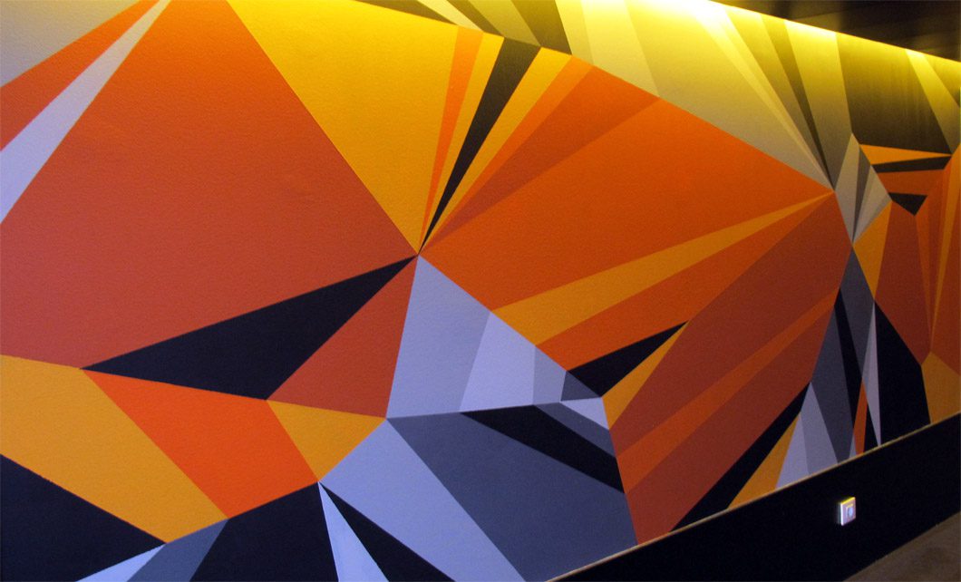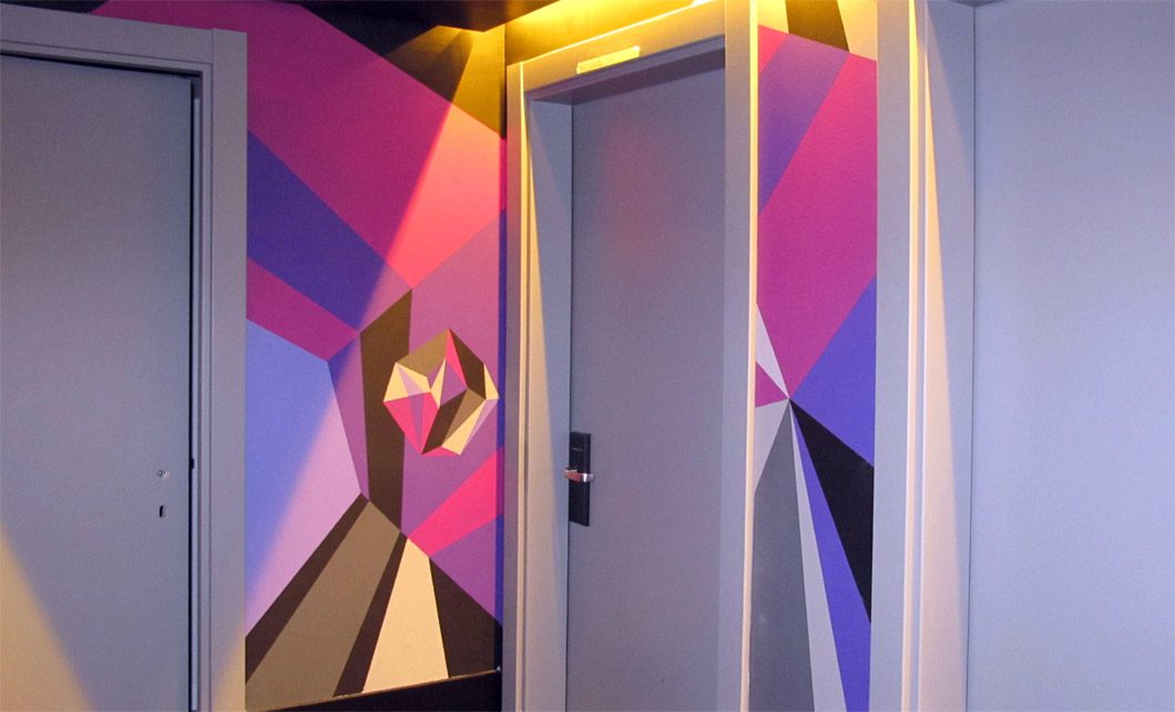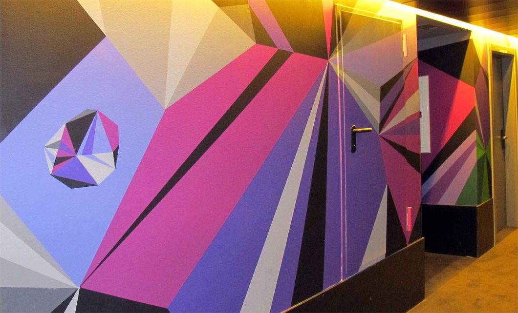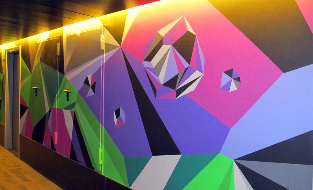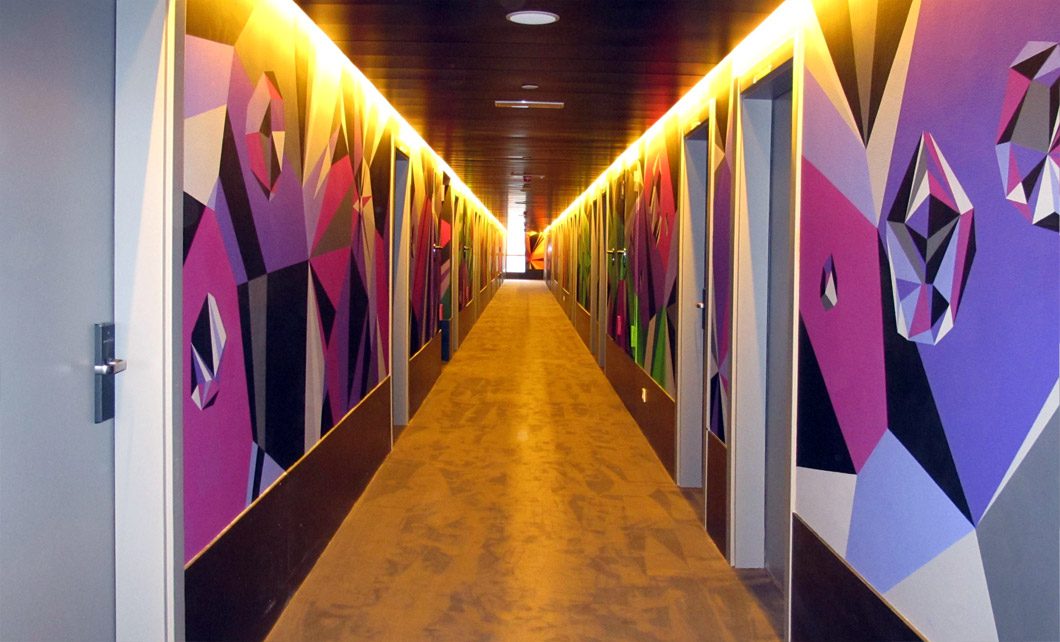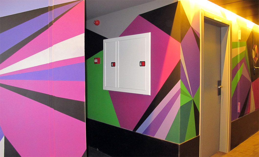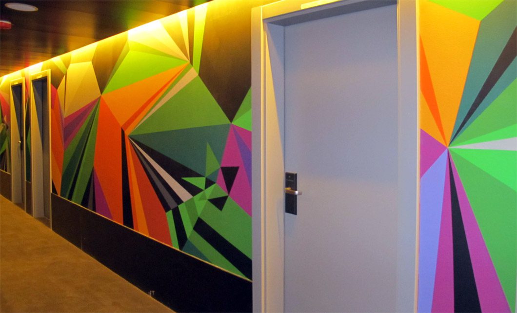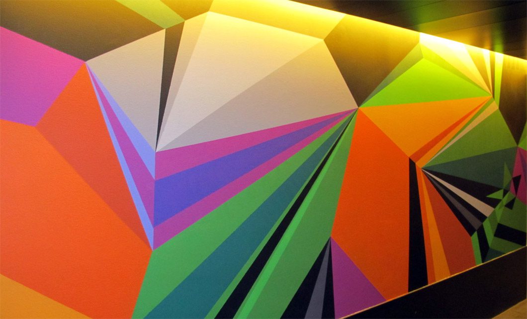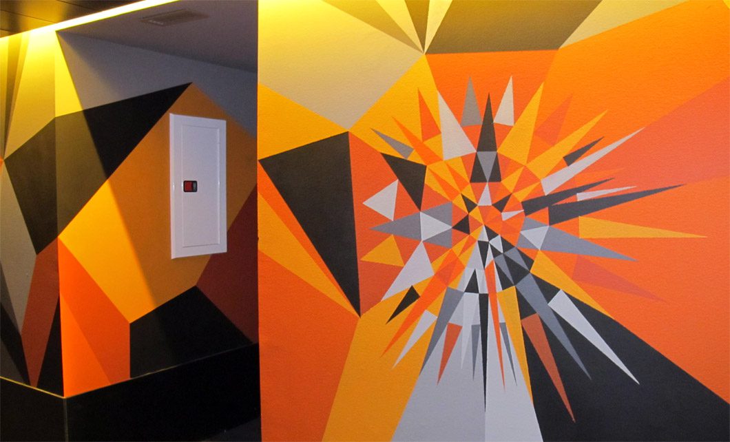 Colorful Geometry Murals, I’ve recently come across Matt W. Moore’s work, in particular the work he did for the Vincci Bit Hotel, where he painted the hotel’s fourth floor hallways. I am usually opposed to painting a wall because of the process of applying an artificial finish to a material. Despite that, I think Moore did it successfully because it is more of a mural, and the wall becomes a canvas to a piece of art. I can’t help but appreciate adorning otherwise nondescript walls and surfaces with vibrant and dynamic paintings.