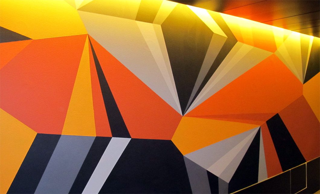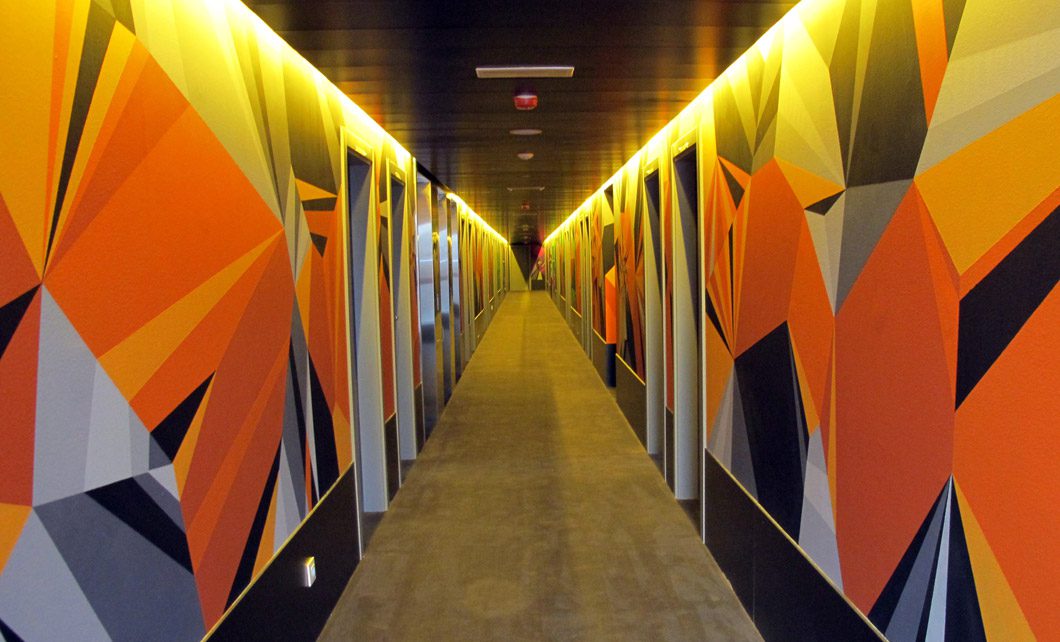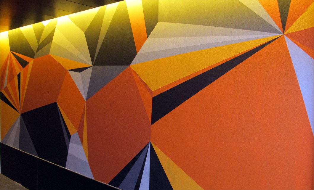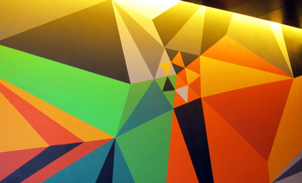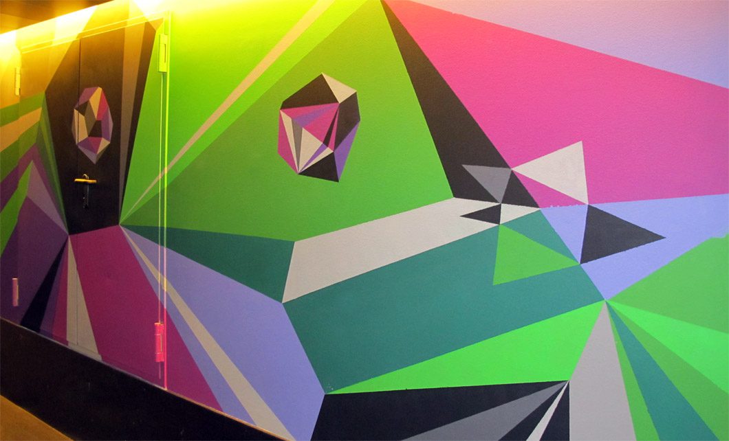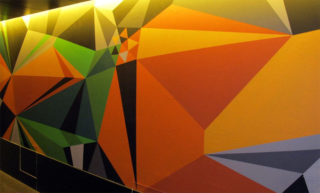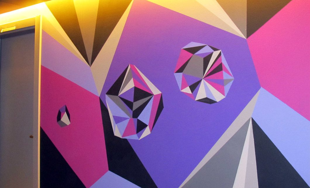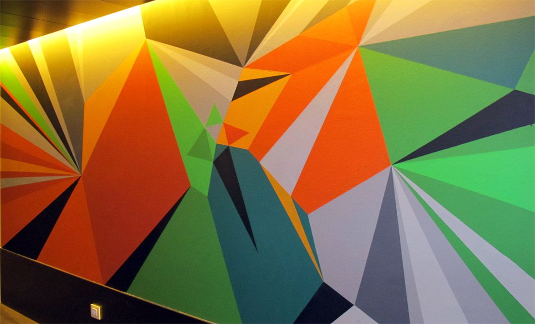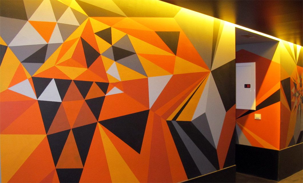 Colorful Geometry Murals, I’ve recently come across Matt W. Moore’s work, in particular the work he did for the Vincci Bit Hotel, where he painted the hotel’s fourth floor hallways. I am usually opposed to painting a wall because of the process of applying an artificial finish to a material. Despite that, I think Moore did it successfully because it is more of a mural, and the wall becomes a canvas to a piece of art. I can’t help but appreciate adorning otherwise nondescript walls and surfaces with vibrant and dynamic paintings.