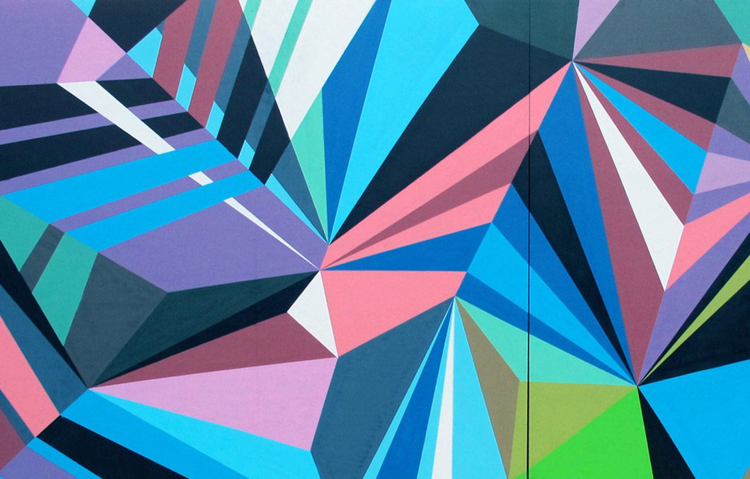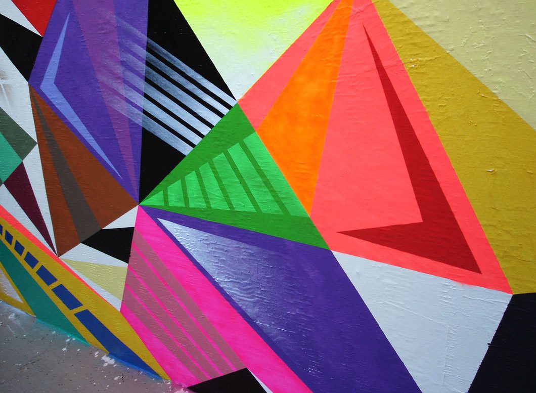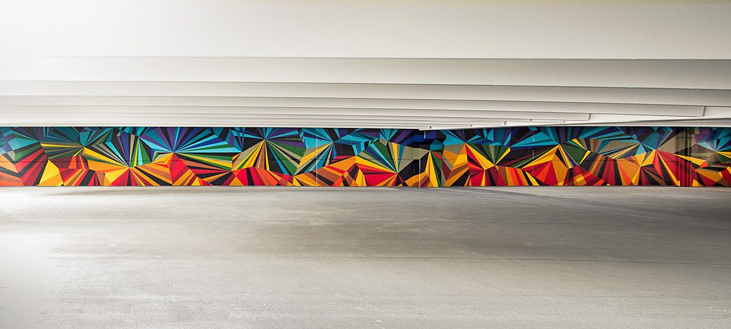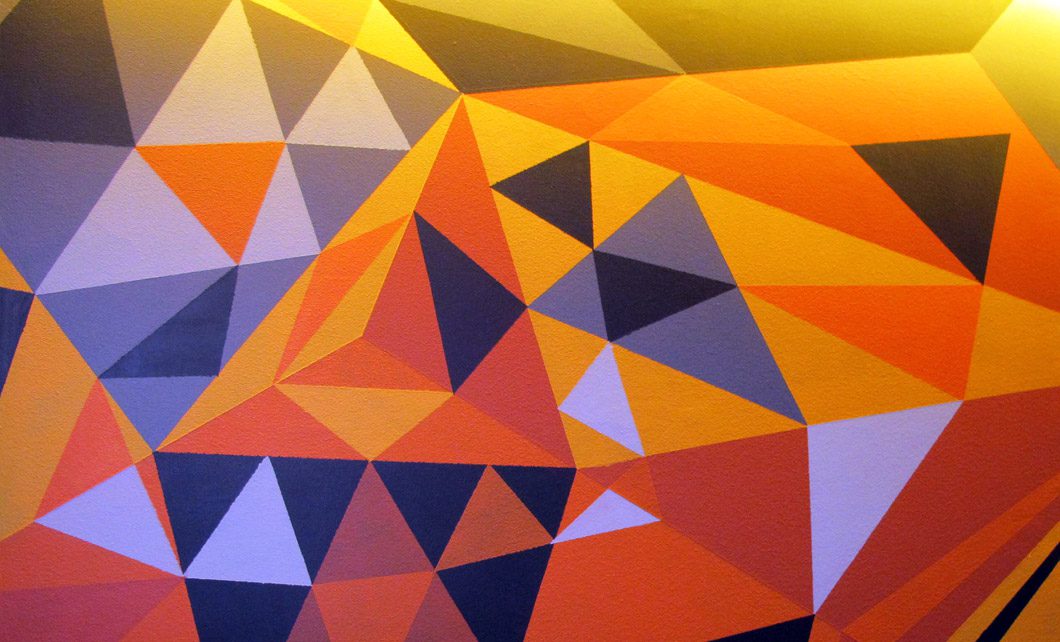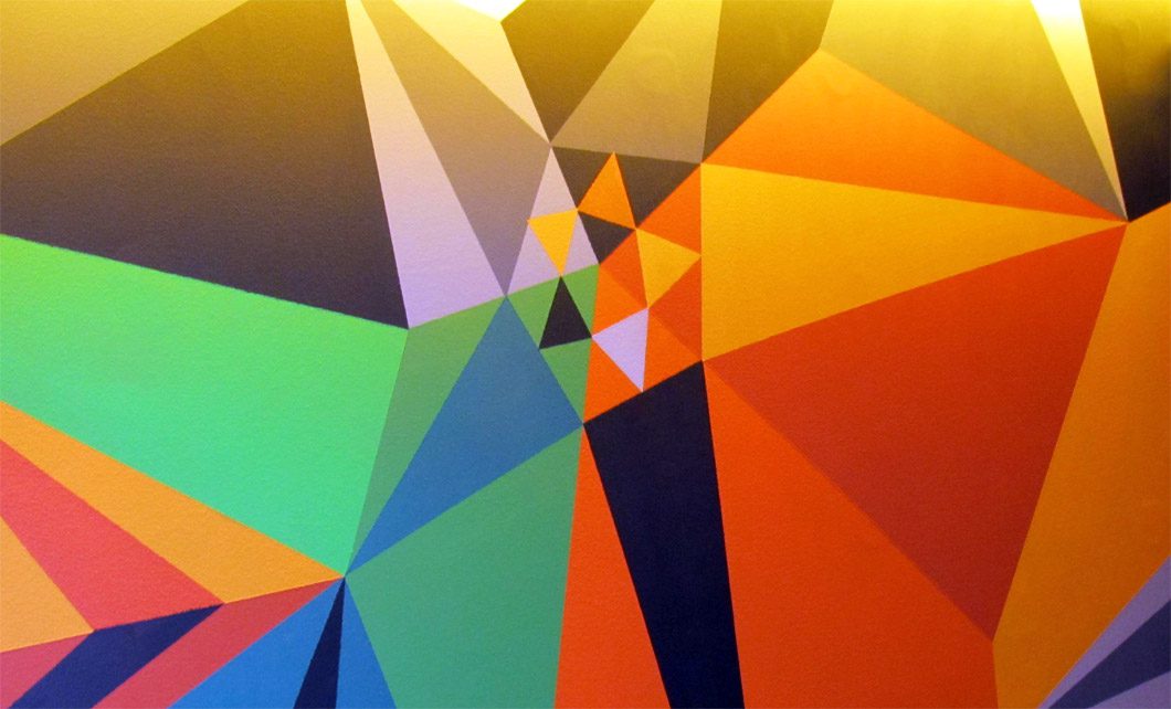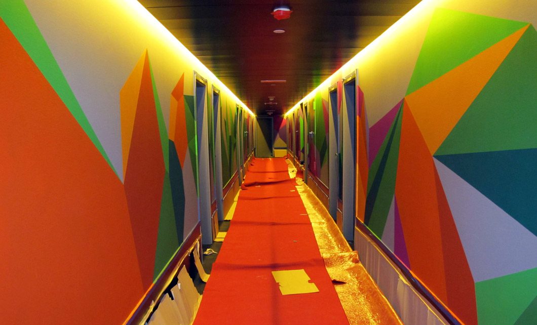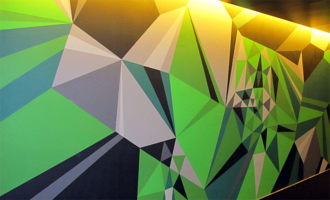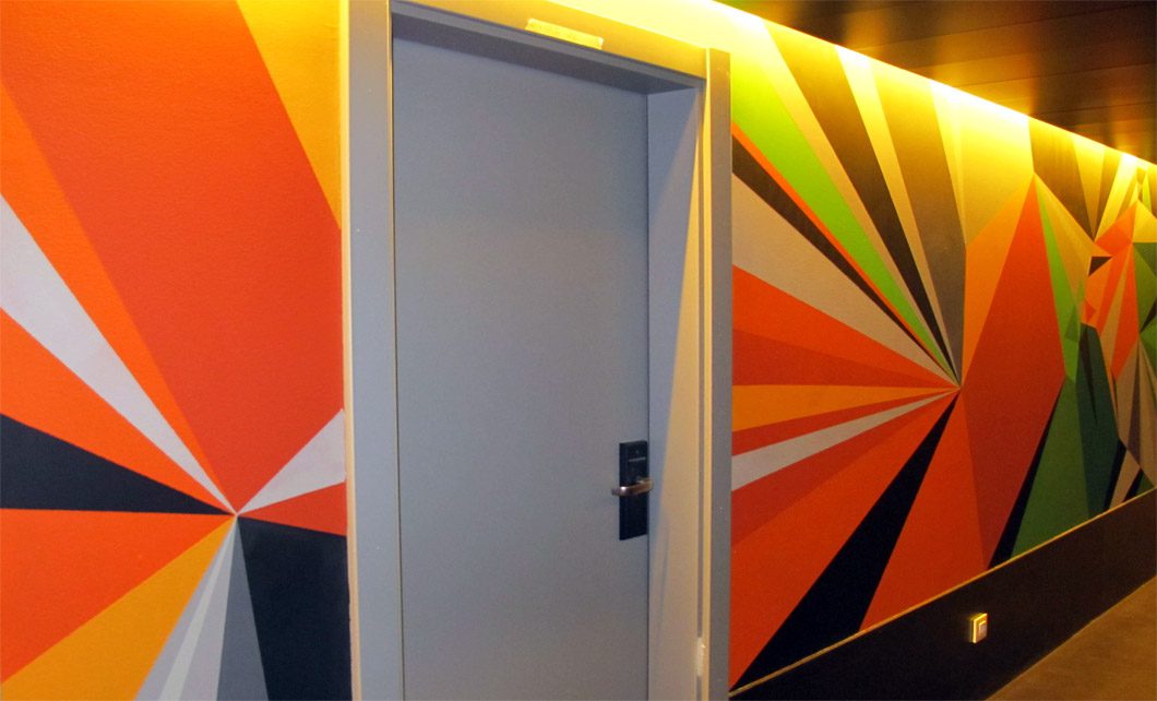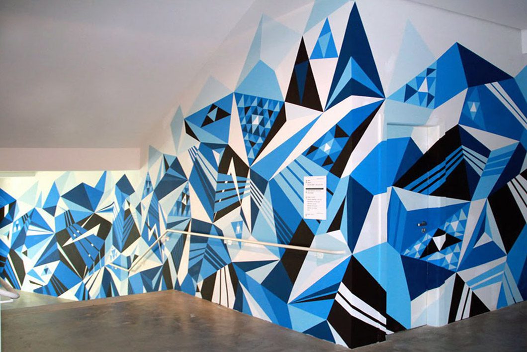 Colorful Geometry Murals, I’ve recently come across Matt W. Moore’s work, in particular the work he did for the Vincci Bit Hotel, where he painted the hotel’s fourth floor hallways. I am usually opposed to painting a wall because of the process of applying an artificial finish to a material. Despite that, I think Moore did it successfully because it is more of a mural, and the wall becomes a canvas to a piece of art. I can’t help but appreciate adorning otherwise nondescript walls and surfaces with vibrant and dynamic paintings.