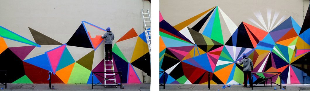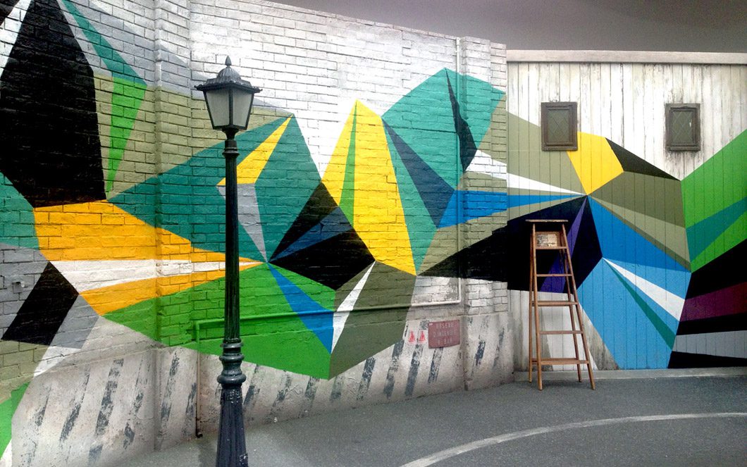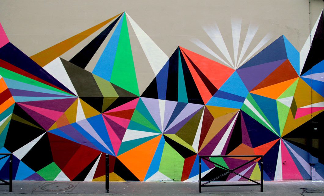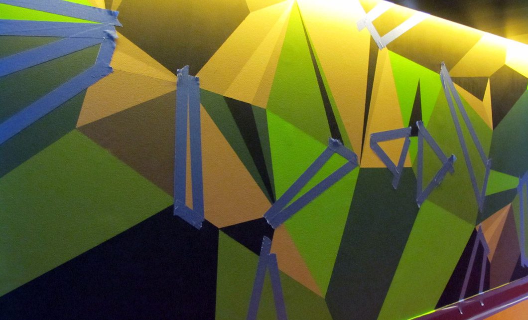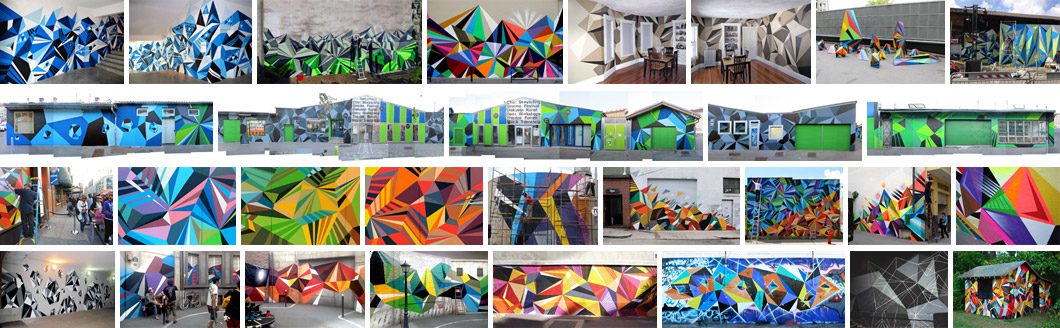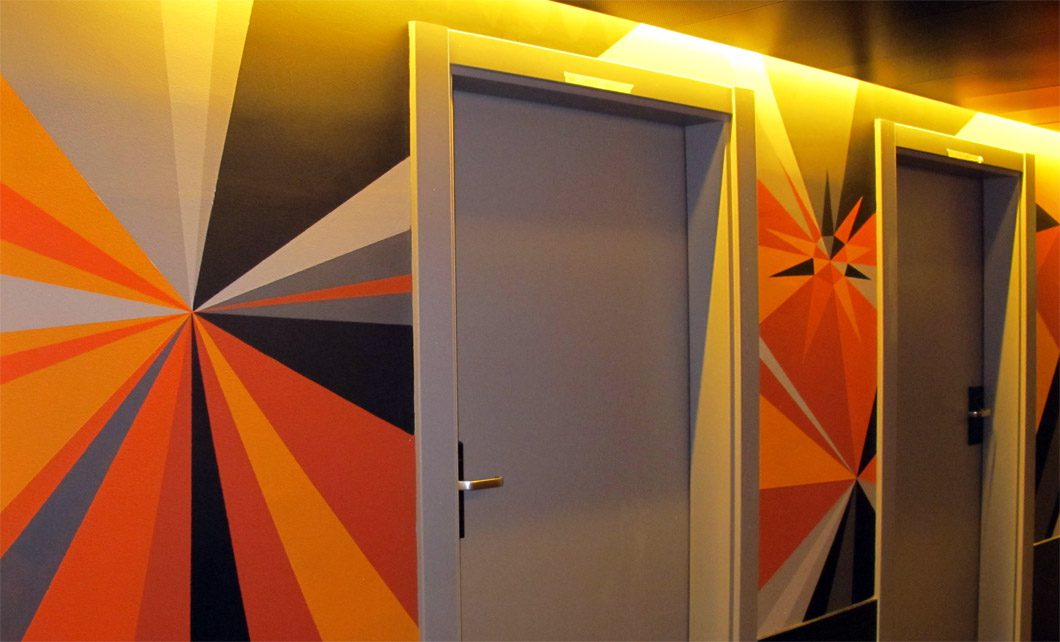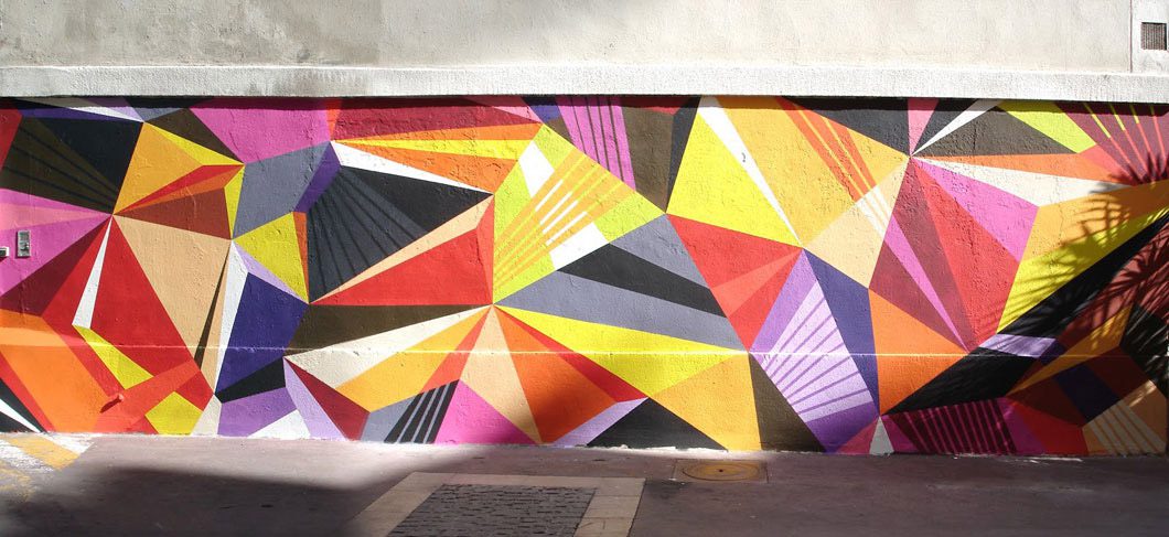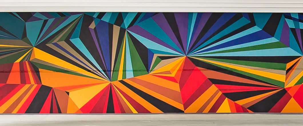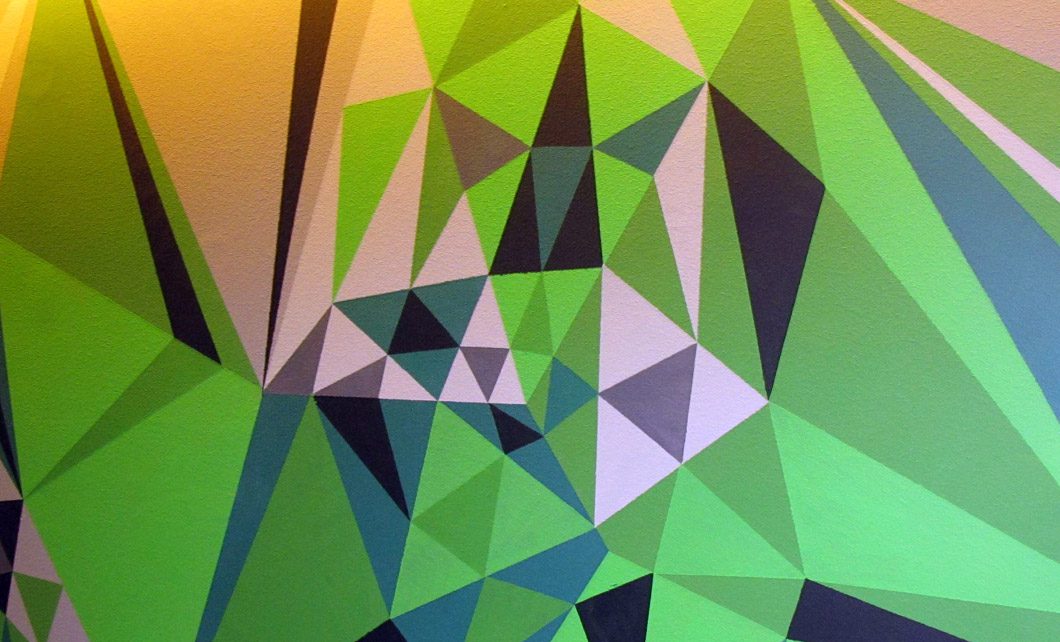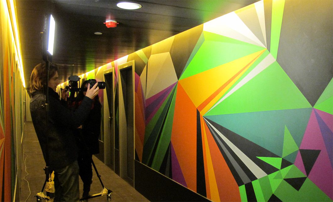 Colorful Geometry Murals, I’ve recently come across Matt W. Moore’s work, in particular the work he did for the Vincci Bit Hotel, where he painted the hotel’s fourth floor hallways. I am usually opposed to painting a wall because of the process of applying an artificial finish to a material. Despite that, I think Moore did it successfully because it is more of a mural, and the wall becomes a canvas to a piece of art. I can’t help but appreciate adorning otherwise nondescript walls and surfaces with vibrant and dynamic paintings.