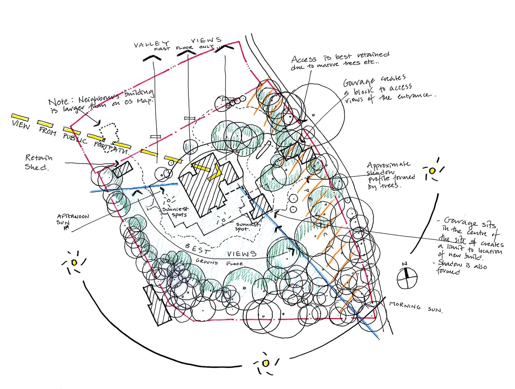 Designing the house floor plans without the consideration of different site aspects is a waste of money and land value. Site analysis comes before design. Recognize where the pleasant winds come from and how the sun moves around your plot, then place the bedrooms, living spaces, and services accordingly. If the site is adjacent to a noise source, then a buffering space and a mass of trees could help