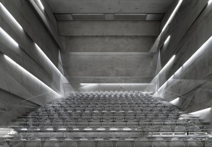 The inclination of the building – based on the increase of the slope – carry the gallery. The seemingly transparent seats, which are fixed on iron swords, appear to float above the light slits. The stage of the concert hall, which is only designed for its actual function not as a multifunctional room, is equipped with modern LED-stage technology.