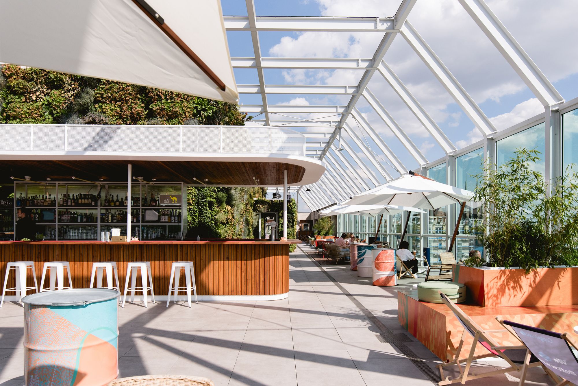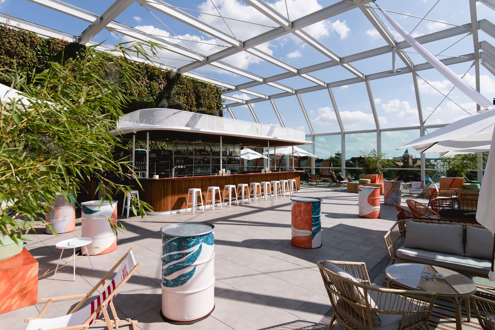 Open terrace on the top floor of the Concordia Design is the great extension of the gastronomic concept down below. It’s focal points – enormous bar, in shape mirroring the one in the Void and big seatings imitating stadium-like tribunes, made from plywood with overprinted bits of Alicia Biała’s mural. Designers loosely referenced seaside resorts both material wise for the bar and in catalogue’s furniture character.