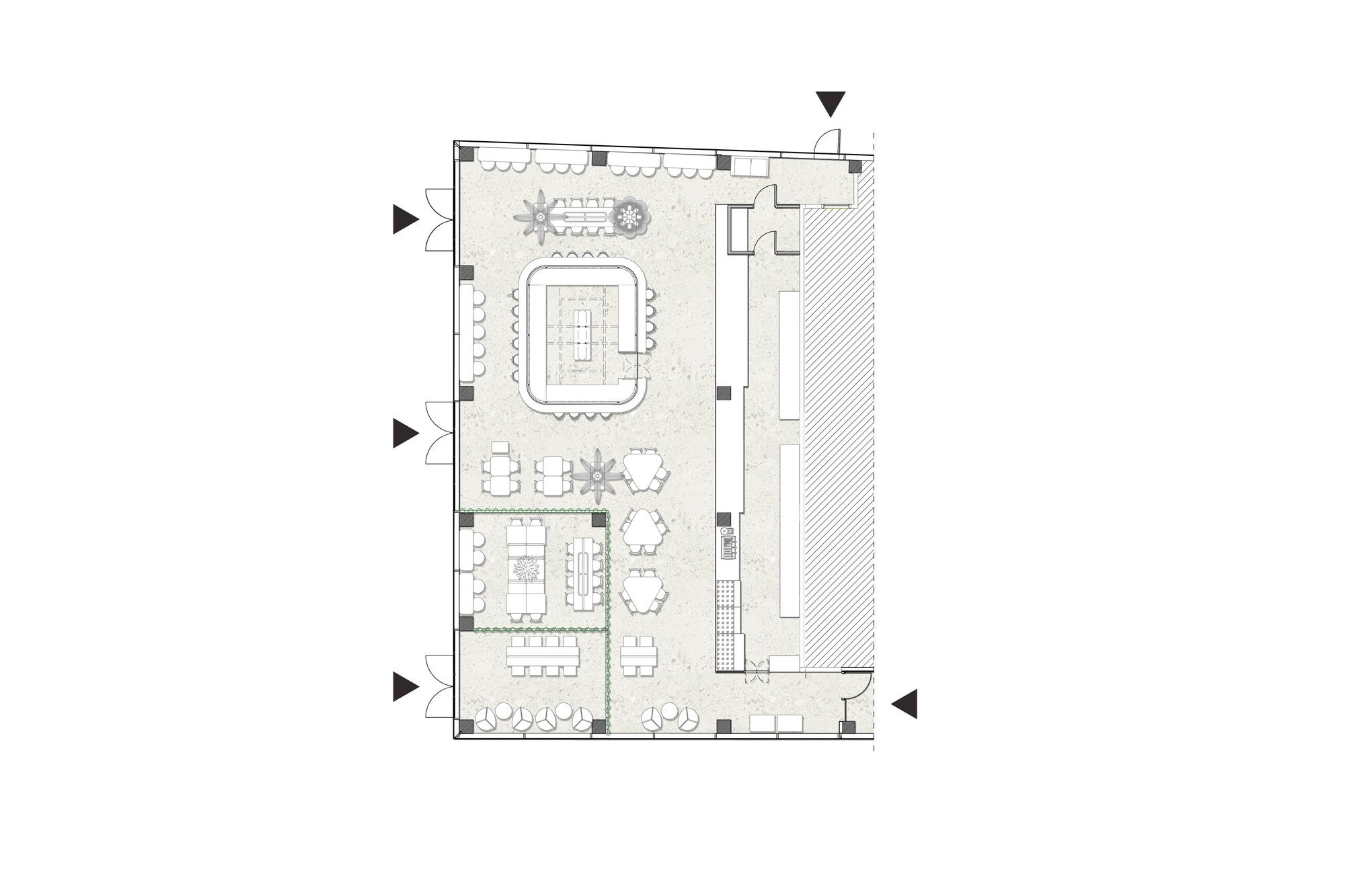 Open space of the building’s big restaurant was divided into smaller cubicles using tall plants and individually designed furniture. “Void” was filled with high legged tables with an integrated lightning system, smaller tables with specific construction and freely flowing curtains from the metal hangers, all making space more intimate and cosy. What’s even more important is that it’s easily moveable, allowing for reorganising space in the spirit of any scheduled event.