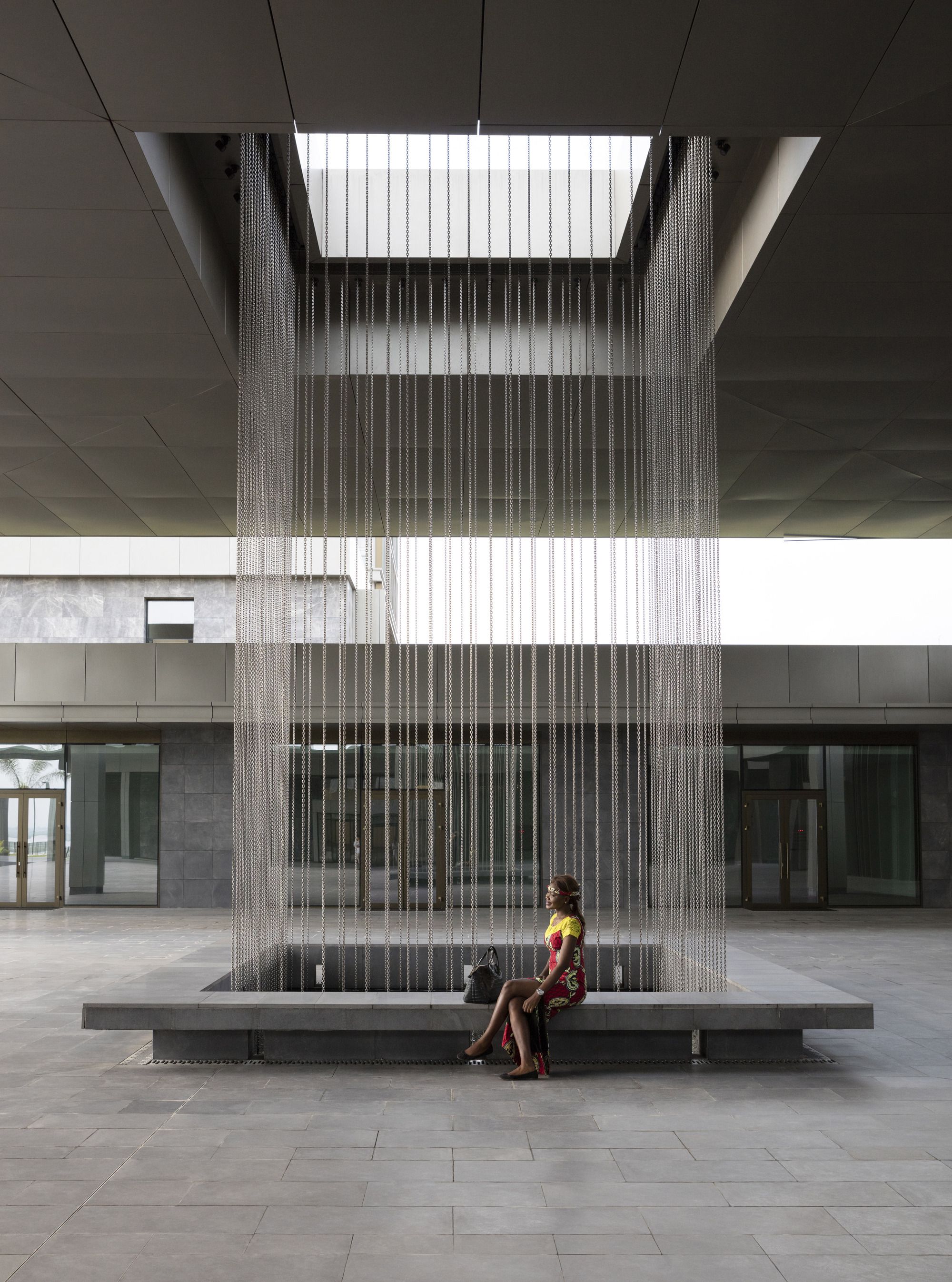 The larger elements are signified by a series of perforated cladding elements which are laser cut in geometric Congolese patterns derived from the traditions of the larger region, connecting the buildings to their place. At times these patterns find themselves recalled in interior elements such as floor patterns and screens which divide interior spaces, and at times on external wall elements creating shading or privacy between inside and outside. Vertical shading elements are a lighter coloured bronz/brass finish, set against a background of larger darker coloured panels and of course glass. The overall colour palatte of the project is infact derived from a series of lighter and darker shades of bronz and brass.