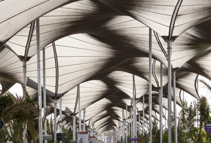 Respecting the traditional Marrakesh construction techniques and also focusing on sustainability which is the main aim of the COP22 climate conference; temporary installations were constructed in Morocco. The spaces/pavilions were designed by Oualalou + Choi in order to produce the whole project’s Design. The building which is called ‘Ark22′ (the gateway), measured 12 meters high and 50 meters long. As it is constructed of wood extracted from local forests to overcome the Moroccan heat and sun, it was given the identity of a ‘pointillist composition’. The primary elevation of the pavilion has a dramatically cut out arch. As a result of this construction, the visitor can have different perceptions of the building depending on where they are standing. The design is by Oualalou + Choi and it will be deconstructed after the conference to be installed in another place within the city. The ‘Agora22′ is another light construction with a rooftop providing viewpoints of the landscape, which is meant to provide two restaurants following the country’s local style. The building offers different spaces with various qualities; lounges, terrace, courtyards, enclosed halls, and skylights. Following the conference’s main aim (Sustainability), the two buildings are made from sustainable building materials and Flexible materials (OSB) to make it easy to disassemble and reassemble after the conference ends.