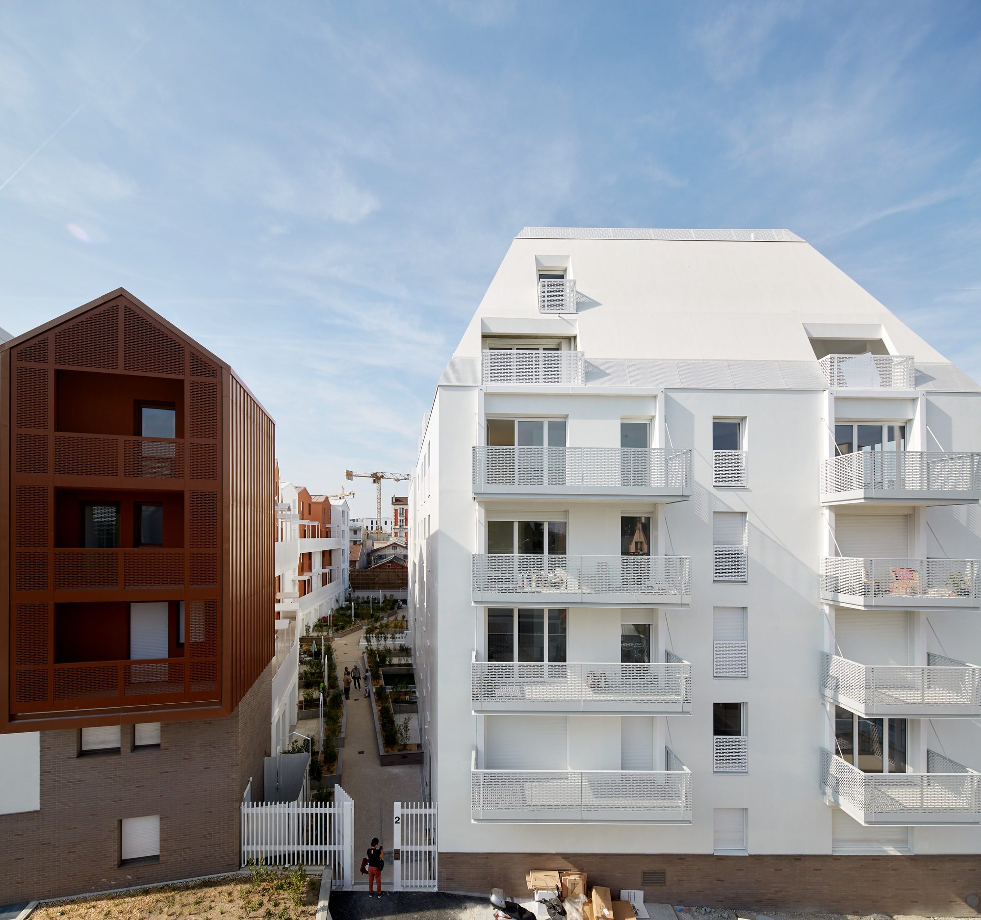 On the other hand, the second part of the project is composed of smaller and vertical volumes with different heights and colors, looking at the inner part of the plot and covered with double-slope rooftops that outline the building silhouette. The buildings, including balconies, are covered with a delicate metallic net protecting the residents’ privacy without depriving them of natural light.