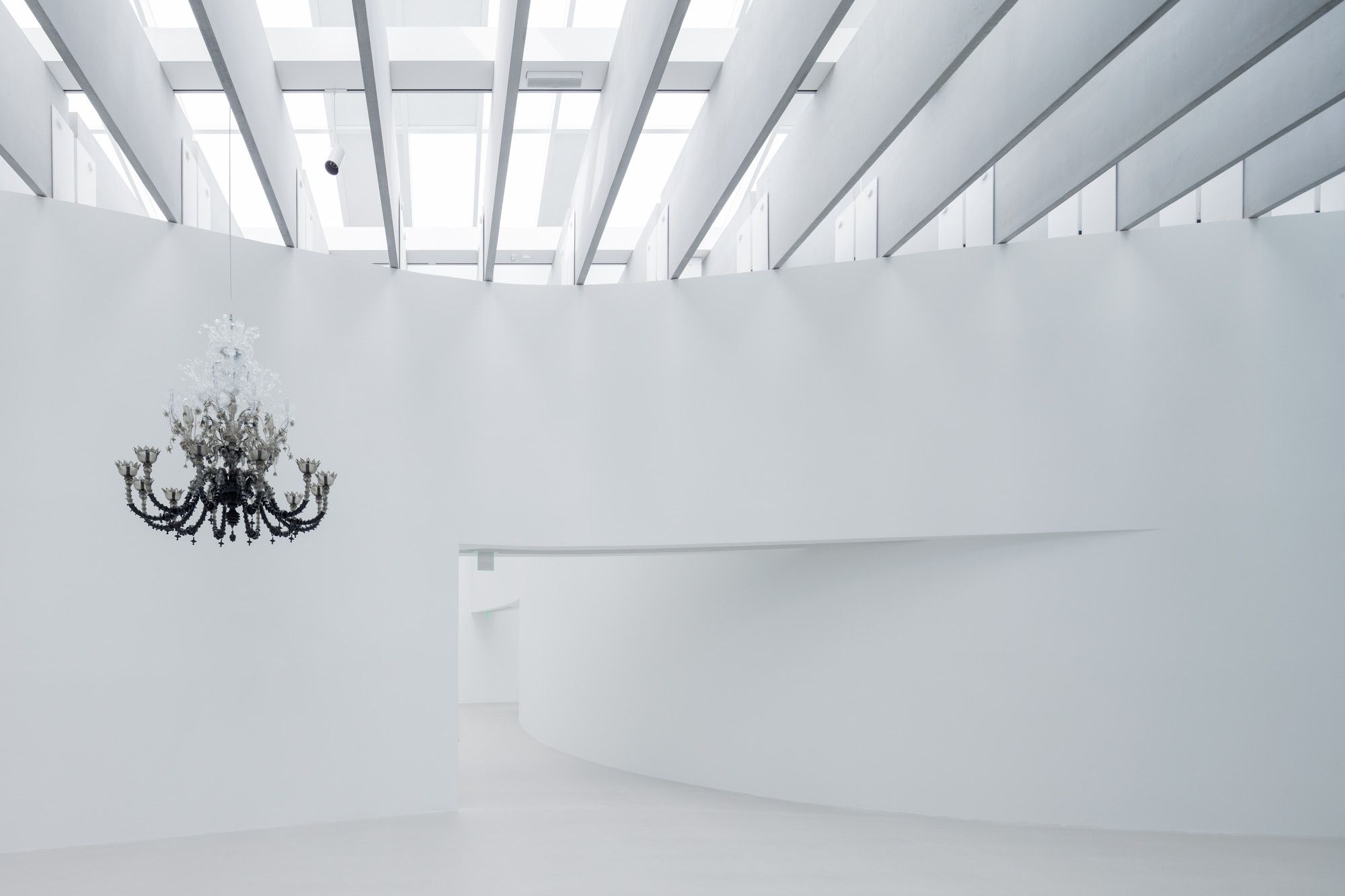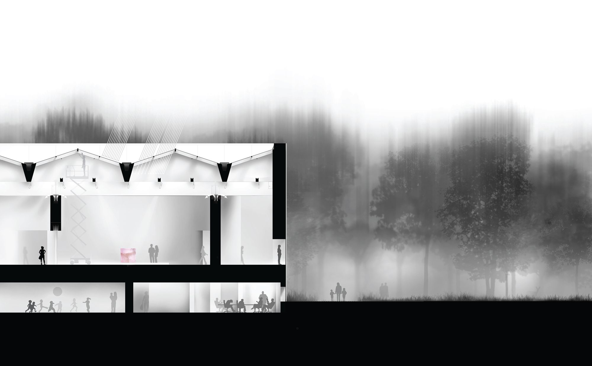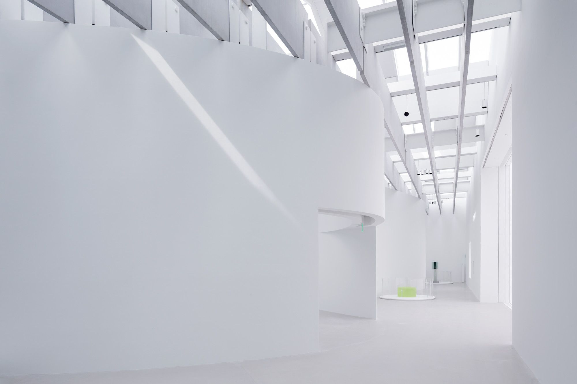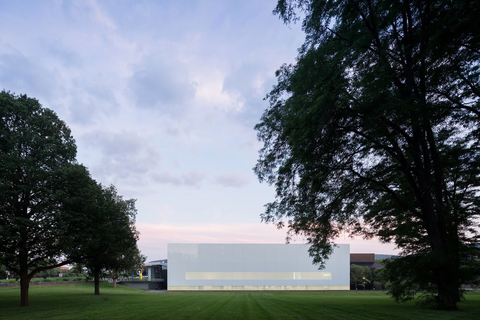 The clean white glass façade of the new contemporary gallery building is juxtaposed with the black exterior of the restored ventilator building. The project features outdoor gathering areas for the public, including a one-acre campus green that will provide views into the luminous new gallery and glassmaking spaces. The new campus green is bordered by the 1951 Harrison & Abramowitz Corning Office building, the 2001 Smith-Miller Hawkinson façade, and new North Wing Expansion.