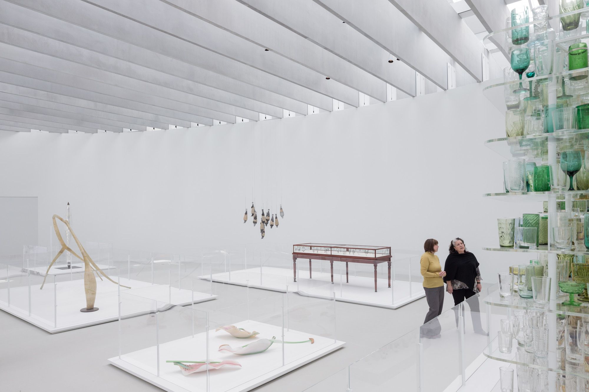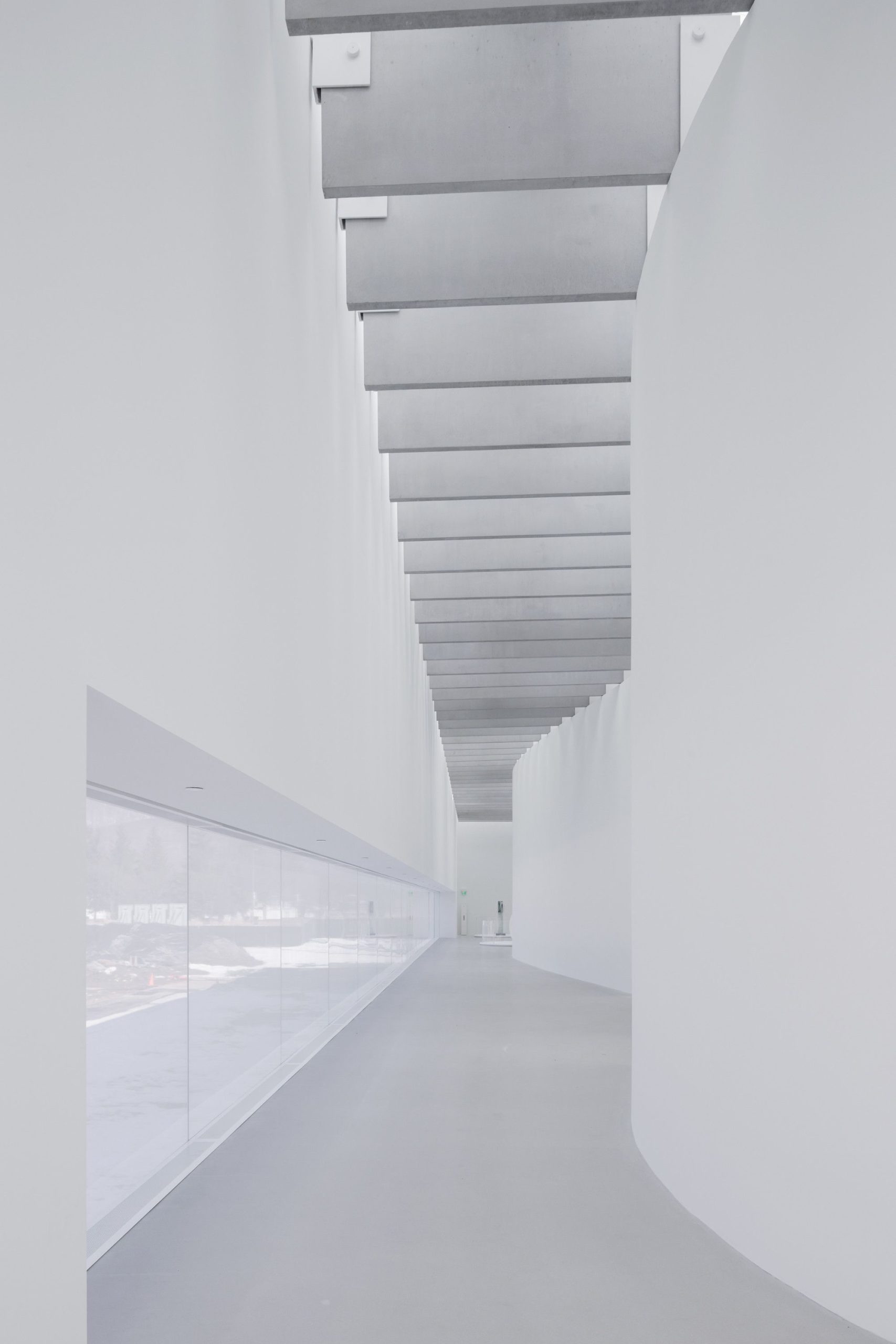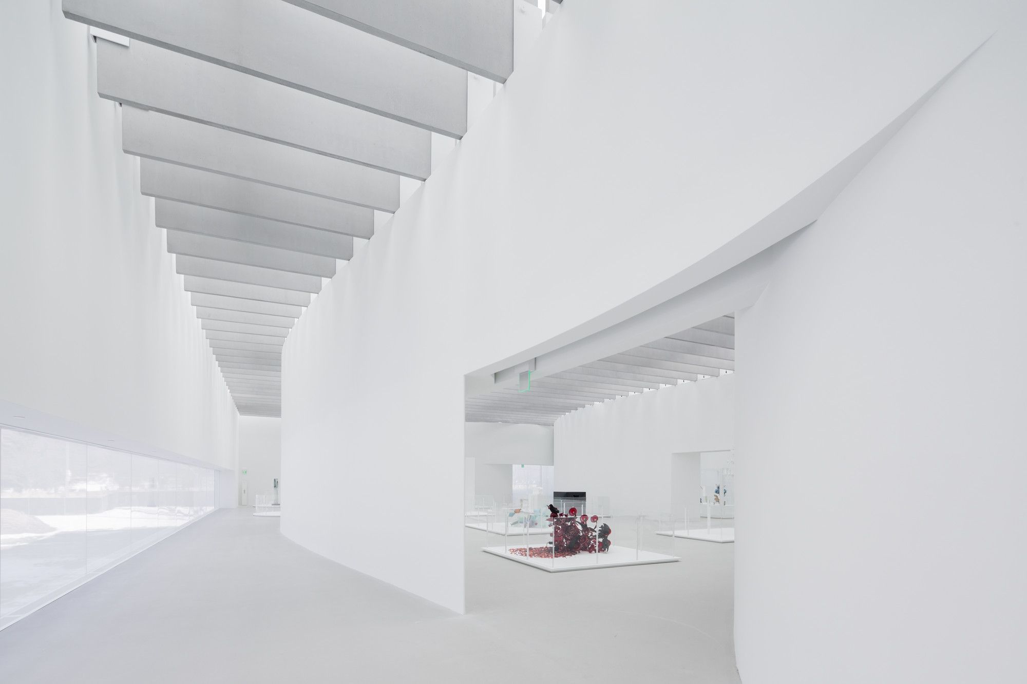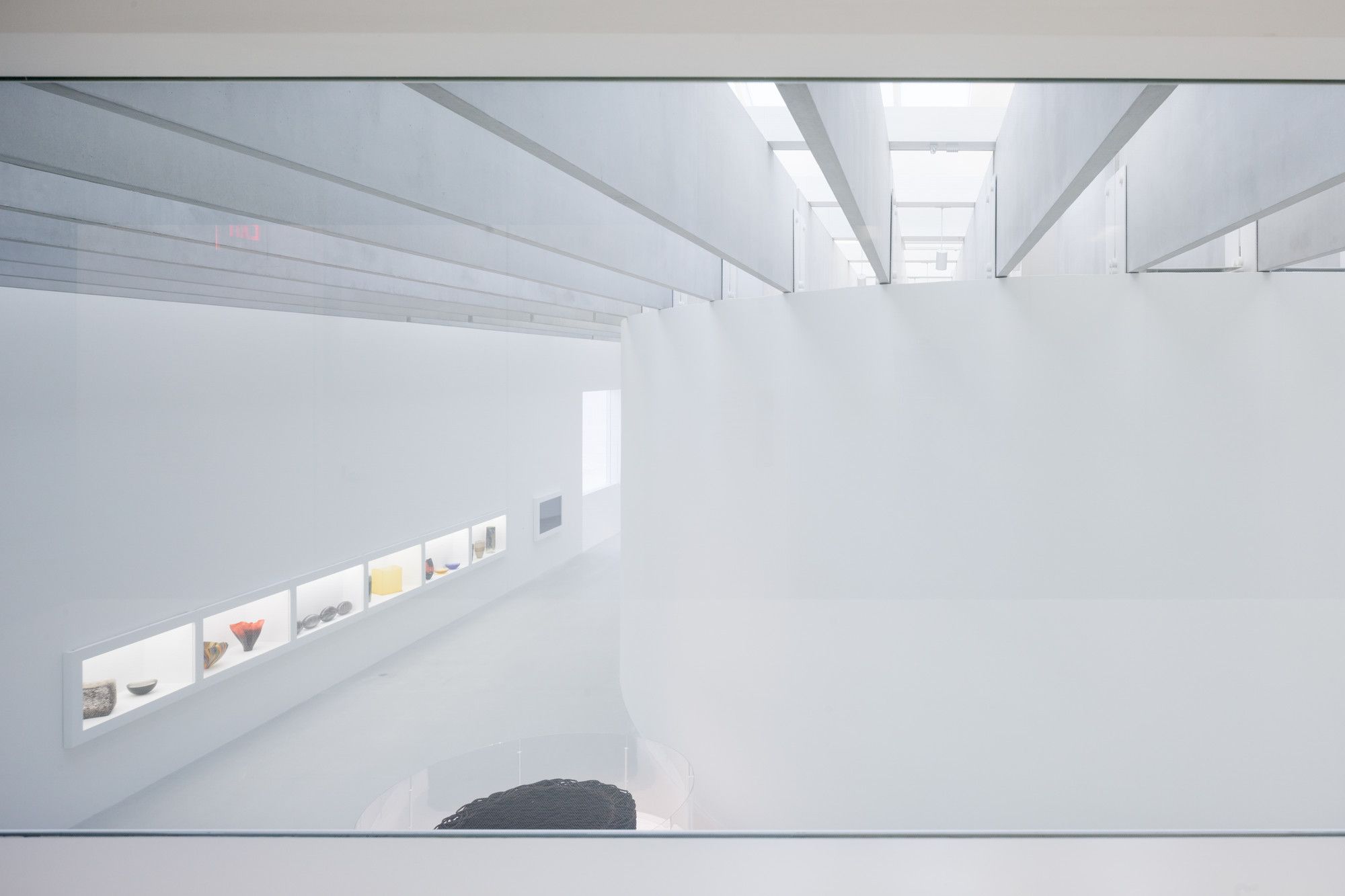 The new gallery building—which will be the largest space anywhere dedicated to the presentation of contemporary art in glass—features skylighting with a sophisticated light-filtering system that is integrated with the structural roof beams. Inside, the works of art will be displayed largely independent of the curvilinear plaster walls, encouraging circulation and allowing contemplation of larger works in glass. The gallery experience is punctuated by a 150 foot long window that provides views to the campus green and reorients the visitor to the larger landscape.