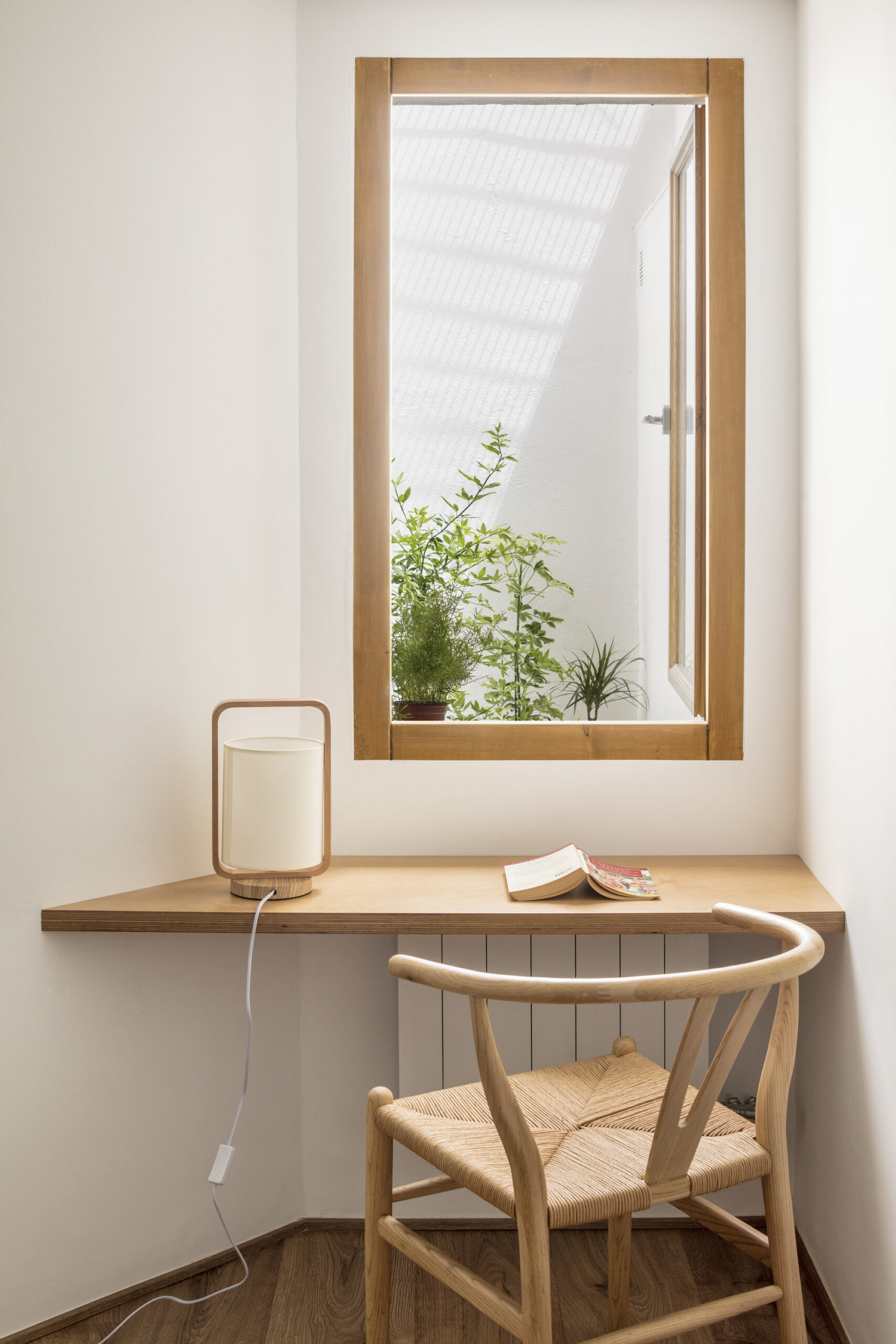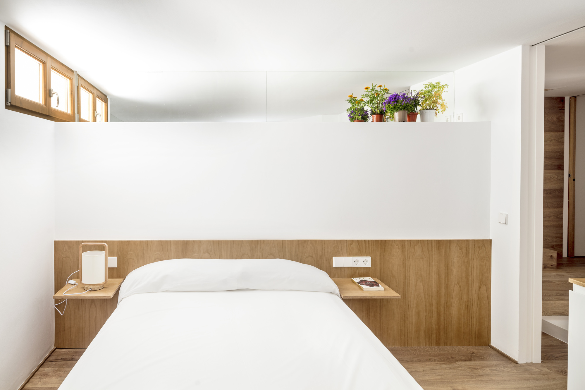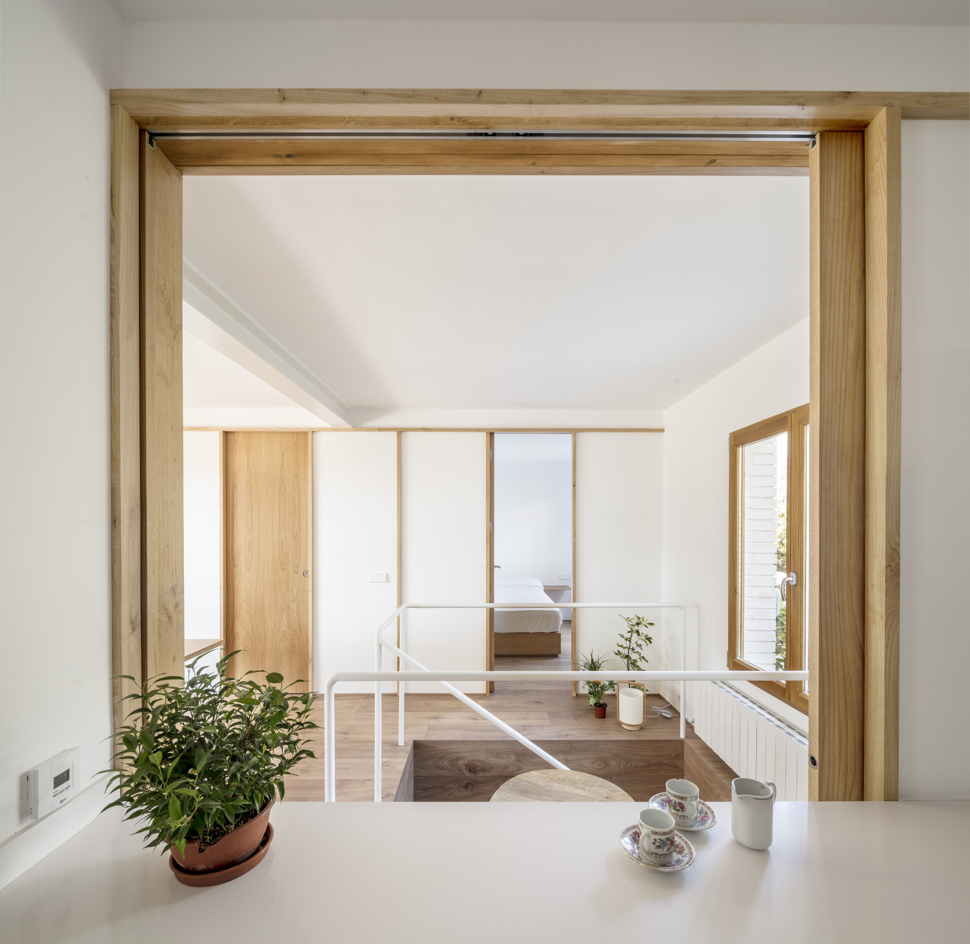 The original one-story house was completely excavated to achieve an underground floor that doubles its interior area, responding to the family needs of the owners. The three inner courtyards enabled to easily extract the soil while generating new inhabited abstract rooms, that provide light and ventilation to the basement bedrooms. The existent foundations, together with the load-bearing walls and perimeter re-taining walls, define the new underground floor layout. New partitions were built to establish a circulation area that crosses the space from the south-facing courtyards to the staircase, which captures the northern light and extends the oak pavement to the up-per floor. This central space with a changeable use of living room promotes cross ventilation and the incidence of natural light, while enhancing the visual depth of the dwelling. In addition to this, the energy efficiency improves with the use of soil thermal inertia, which regulates the indoor temperature in both summer and winter.