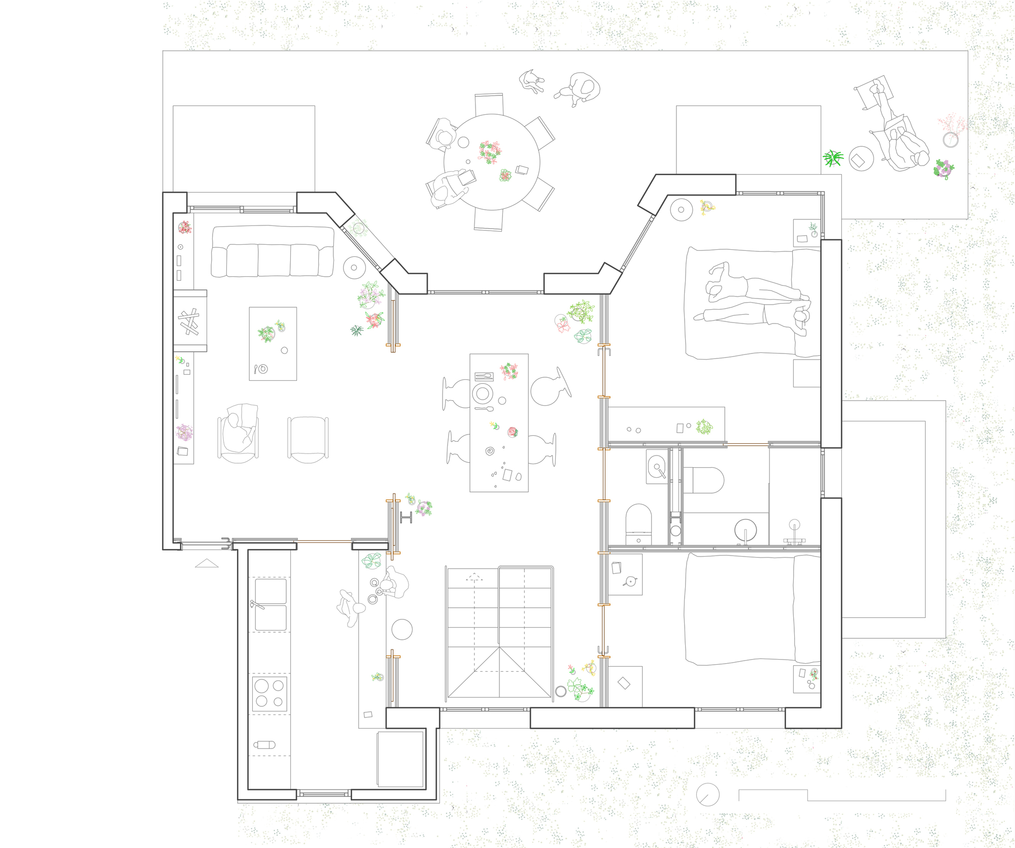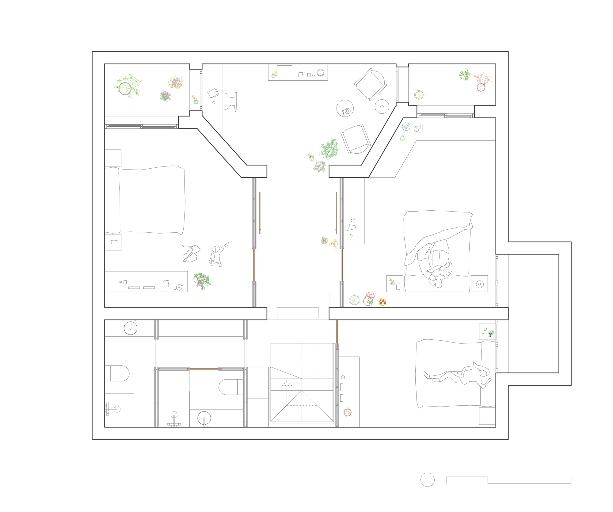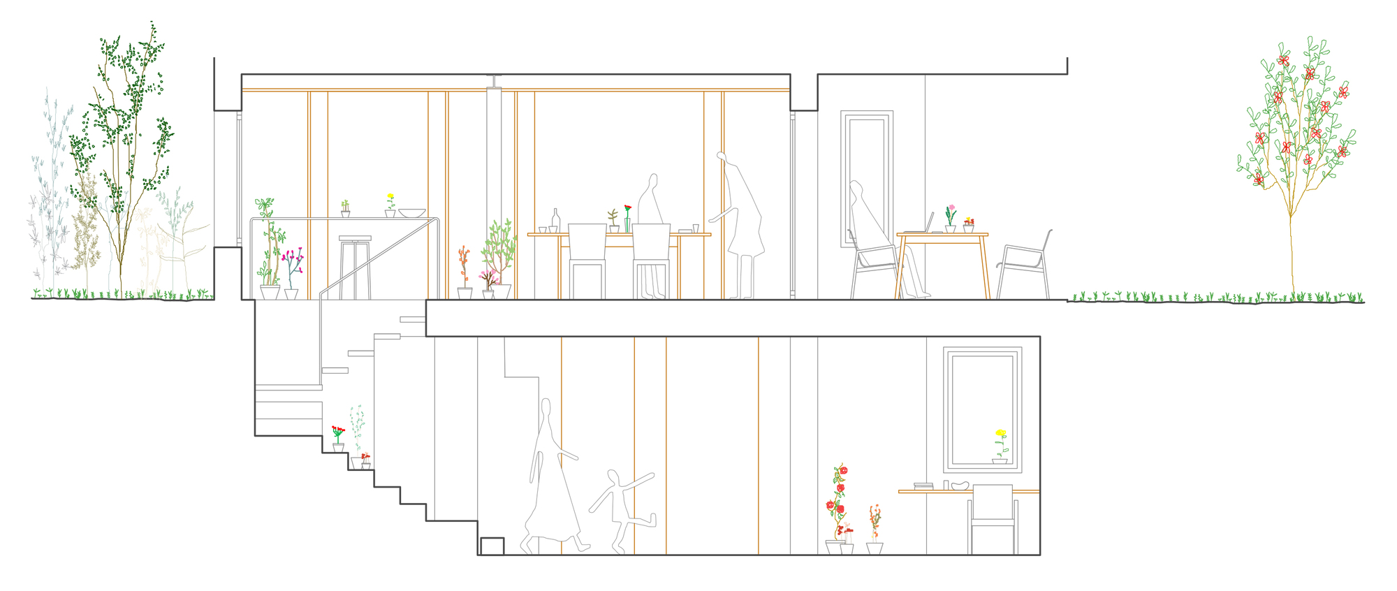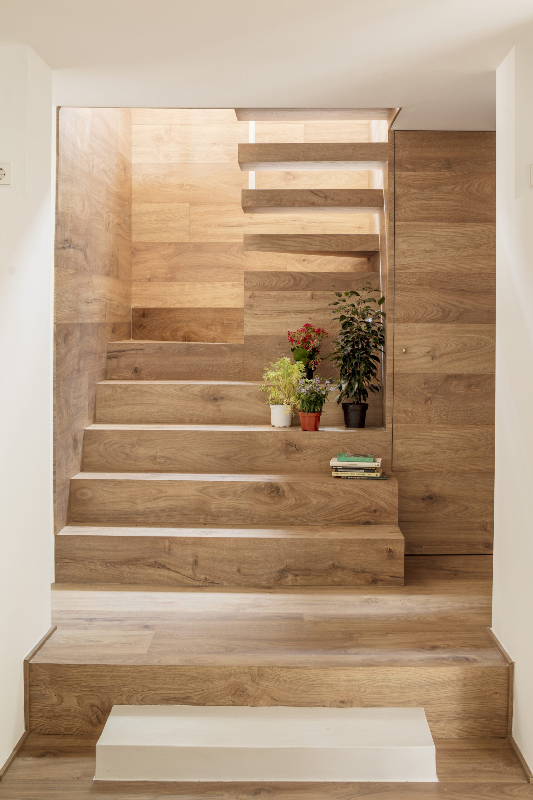 The original one-story house was completely excavated to achieve an underground floor that doubles its interior area, responding to the family needs of the owners. The three inner courtyards enabled to easily extract the soil while generating new inhabited abstract rooms, that provide light and ventilation to the basement bedrooms. The existent foundations, together with the load-bearing walls and perimeter re-taining walls, define the new underground floor layout. New partitions were built to establish a circulation area that crosses the space from the south-facing courtyards to the staircase, which captures the northern light and extends the oak pavement to the up-per floor. This central space with a changeable use of living room promotes cross ventilation and the incidence of natural light, while enhancing the visual depth of the dwelling. In addition to this, the energy efficiency improves with the use of soil thermal inertia, which regulates the indoor temperature in both summer and winter.