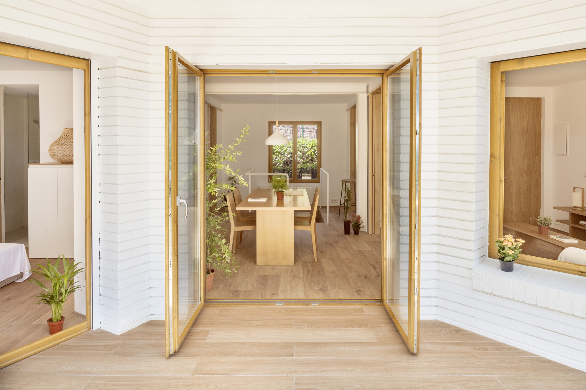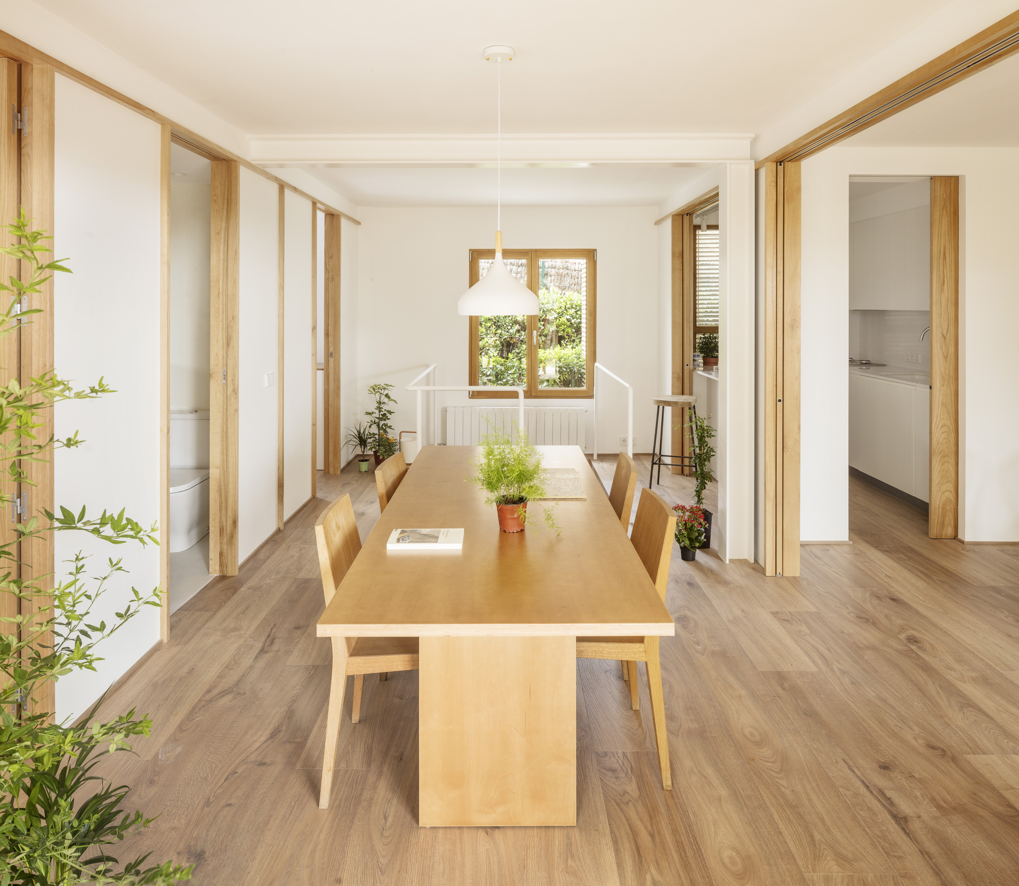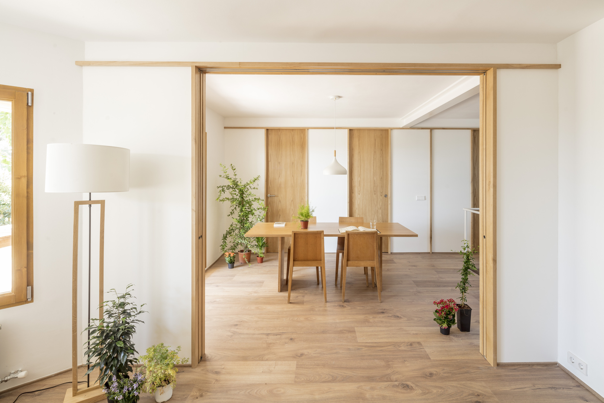 On the ground floor, a new opening was set up by a structural reinforcing beam in the load wall, con-necting the terrace and the back garden through the dining room and staircase. This intervention origi-nates a new interstitial space that allows the creation of two facing wooden modular partitions, unifying the different house units in a harmonious flexible spatial composition. The new interior visuals, high-lighted by timber frames, link the rooms to each other and the surrounding garden, while providing a greater perception of spatial depth. In one of the divisions, the sliding doors open the living room and kitchen bar, while in the other, doors open the private units such as the two bedrooms and toilet. The design strategy, construction system and aesthetics are inspired by the partitions of traditional Japanese houses, where fixed and mobile panels known as “fusuma” create an abstract landscape. A light timber framework supports the panels; the fixed ones are white lacquered wood boards while the mobile ones are made by natural chestnut wood. The presence of these mobile elements leads to changing boundary spaces that encourage na-ture and light to come inside the dwelling.