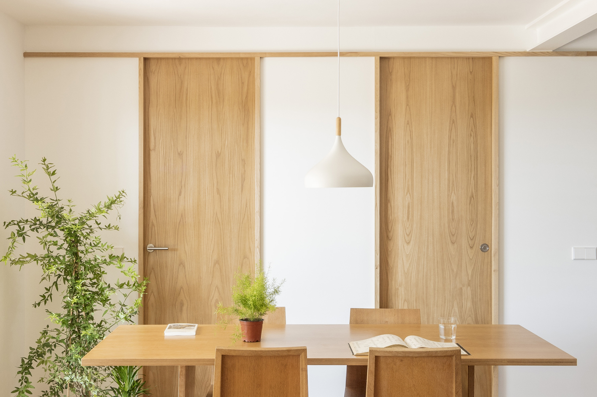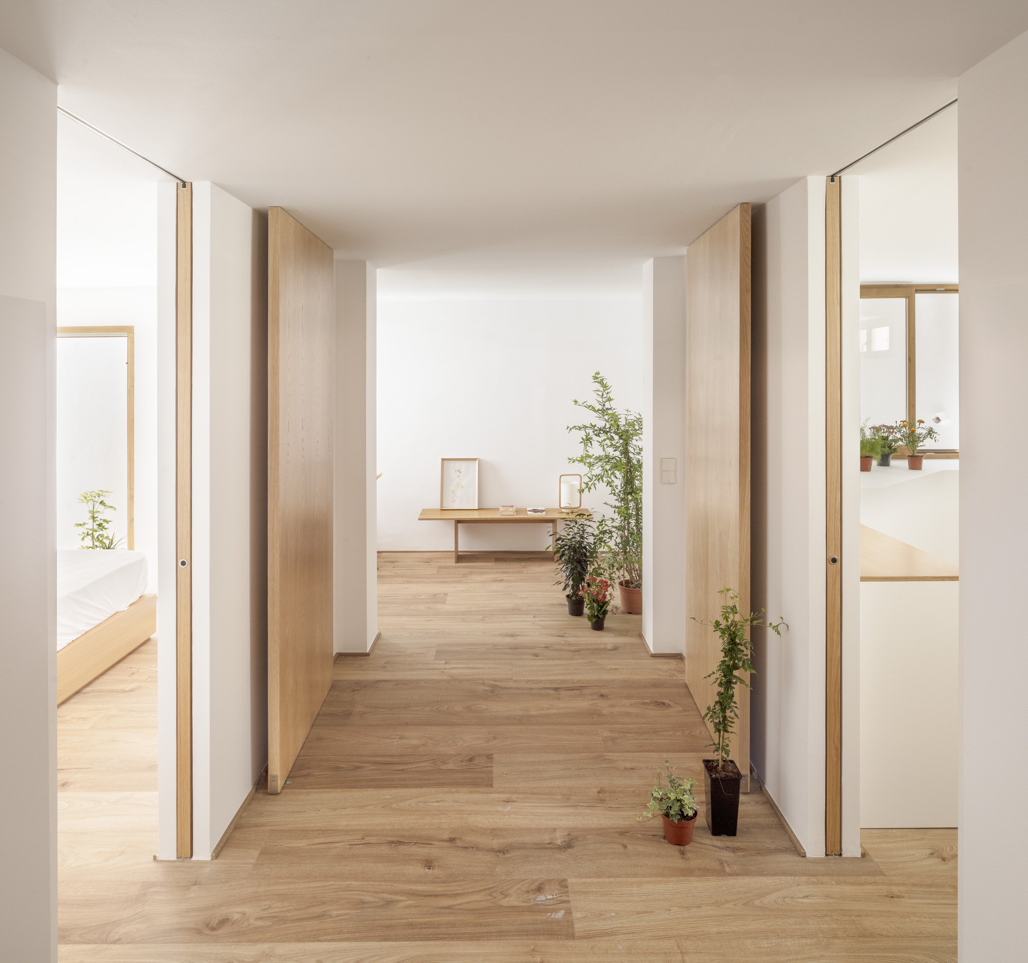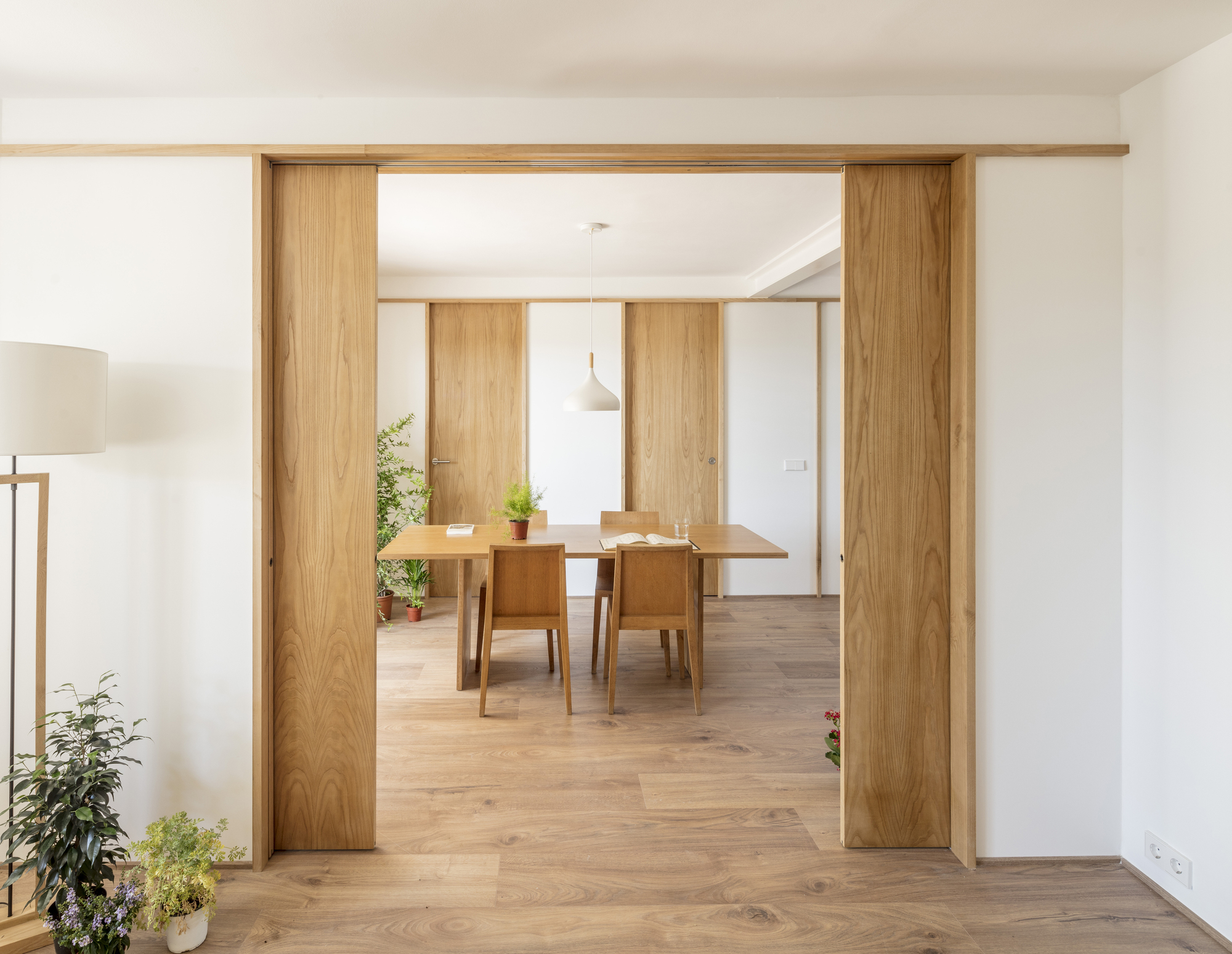 On the ground floor, a new opening was set up by a structural reinforcing beam in the load wall, con-necting the terrace and the back garden through the dining room and staircase. This intervention origi-nates a new interstitial space that allows the creation of two facing wooden modular partitions, unifying the different house units in a harmonious flexible spatial composition. The new interior visuals, high-lighted by timber frames, link the rooms to each other and the surrounding garden, while providing a greater perception of spatial depth. In one of the divisions, the sliding doors open the living room and kitchen bar, while in the other, doors open the private units such as the two bedrooms and toilet. The design strategy, construction system and aesthetics are inspired by the partitions of traditional Japanese houses, where fixed and mobile panels known as “fusuma” create an abstract landscape. A light timber framework supports the panels; the fixed ones are white lacquered wood boards while the mobile ones are made by natural chestnut wood. The presence of these mobile elements leads to changing boundary spaces that encourage na-ture and light to come inside the dwelling.