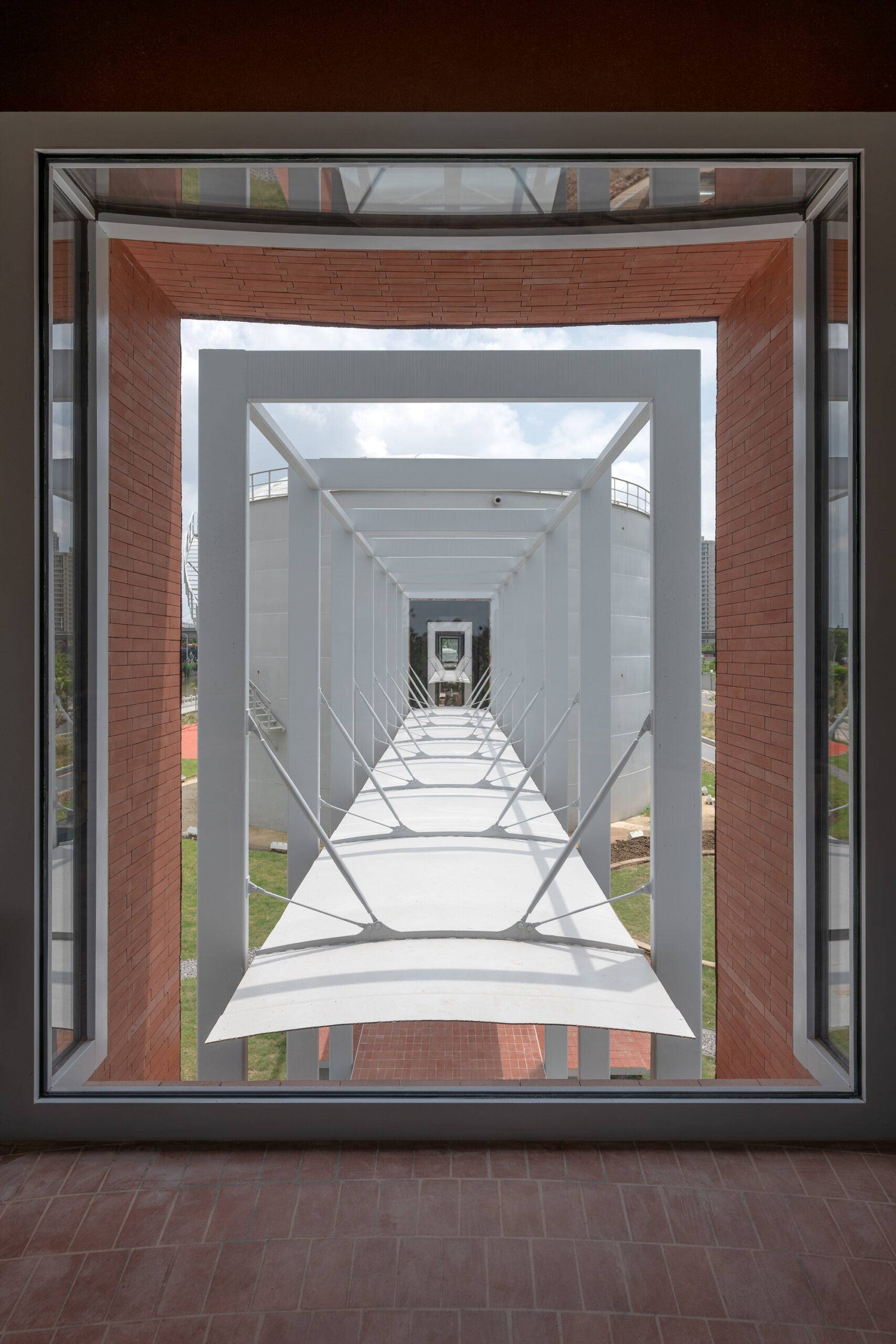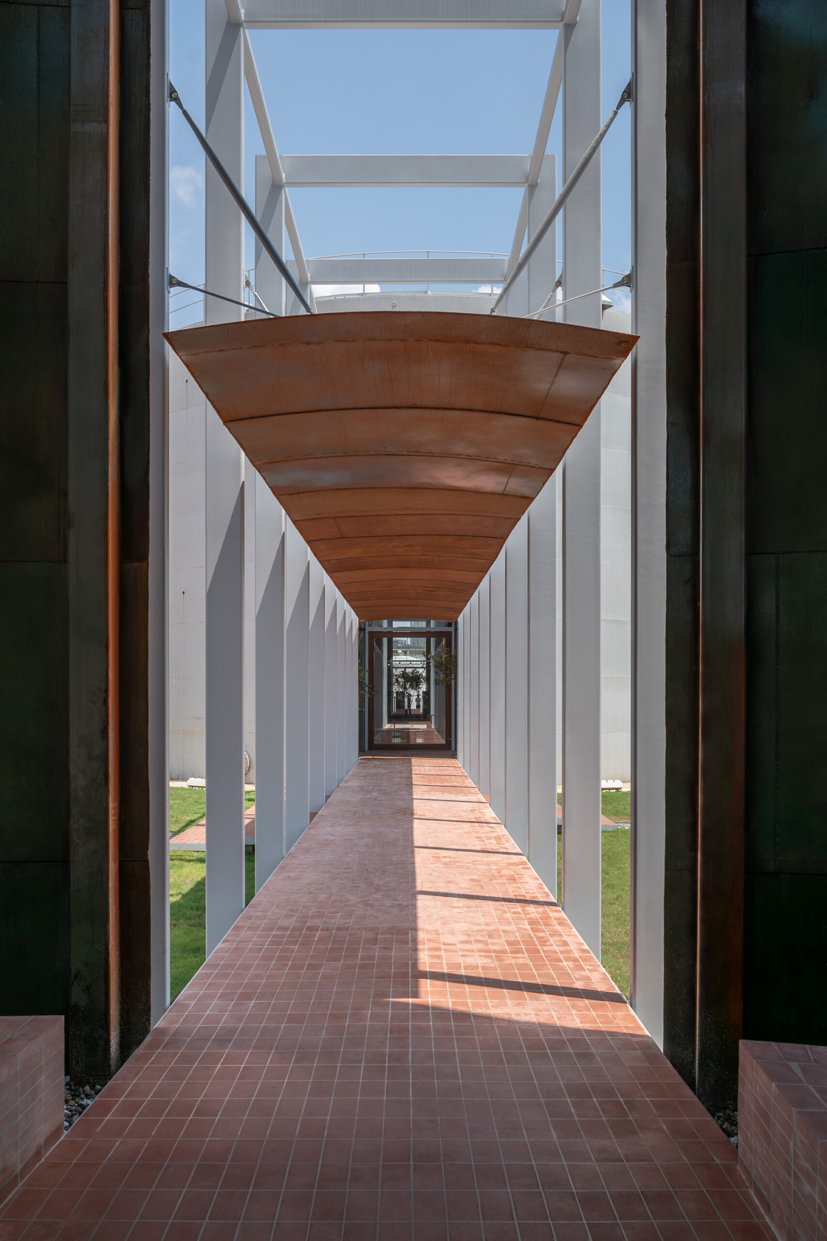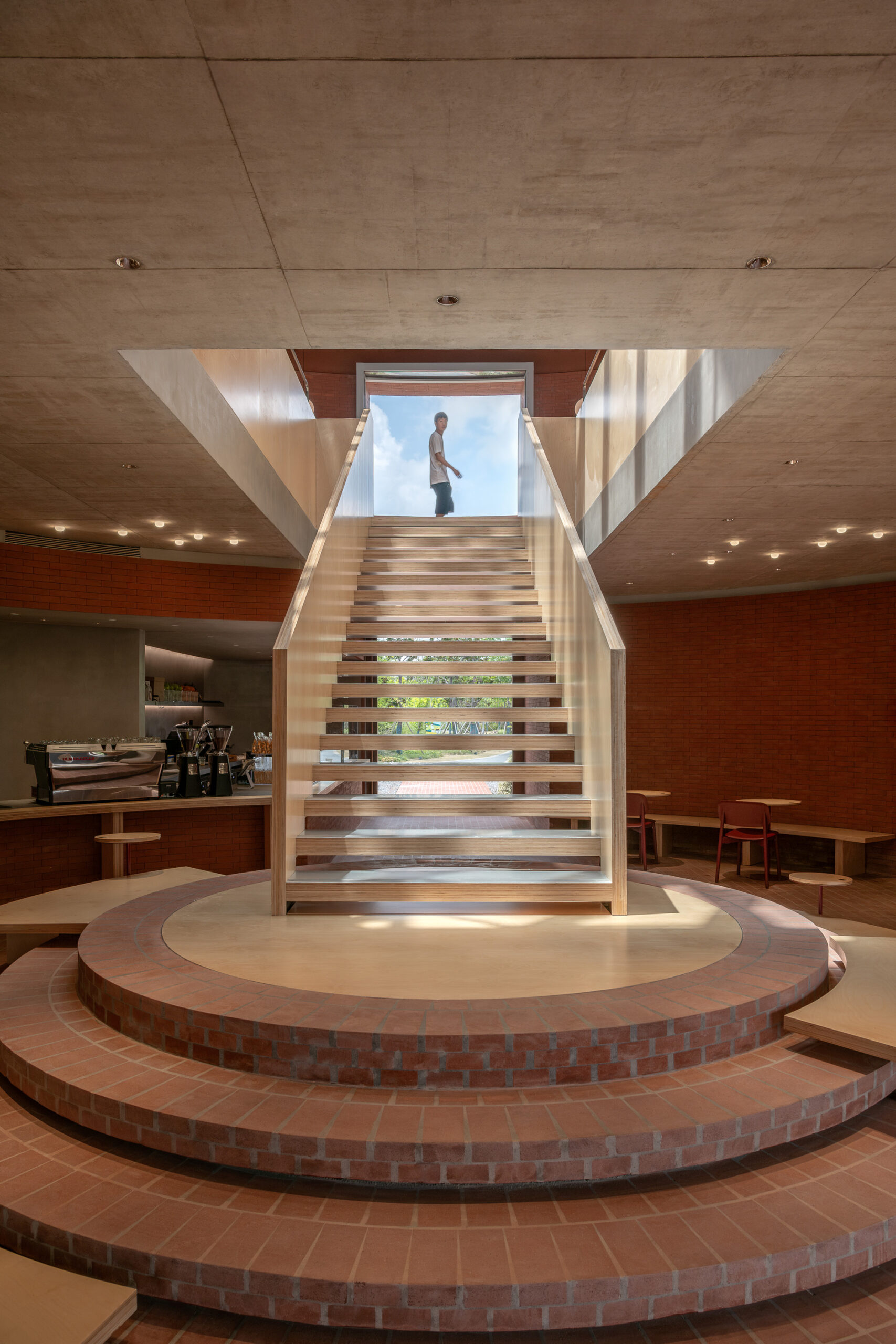 Next to the steel of the silos, we introduced one other material, inspired by the canal. This material pays homage to the steel barges that transport red bricks, supporting China’s burgeoning developments. Here, these bricks are employed in a straightforward stack, giving rise to a distinct inner realm within the restaurant silo. Adjacent to the curved inner walls, they form pathways for visitors to traverse, providing guidance and grounding the site within its surroundings.