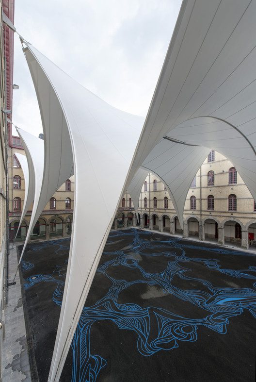 The design is to cover the largest open air courtyard in the city center with five large membrane vaults, which responds to the rhythm and arches of the buildings. If needed, the membranes can be completely removed without causing any harm to this historical building. This is done though the special structure that allows for fast and easy handling from the ground. The special structure that was designed also integrates all of the structural reinforcements in the thickness of the existing concrete structure.