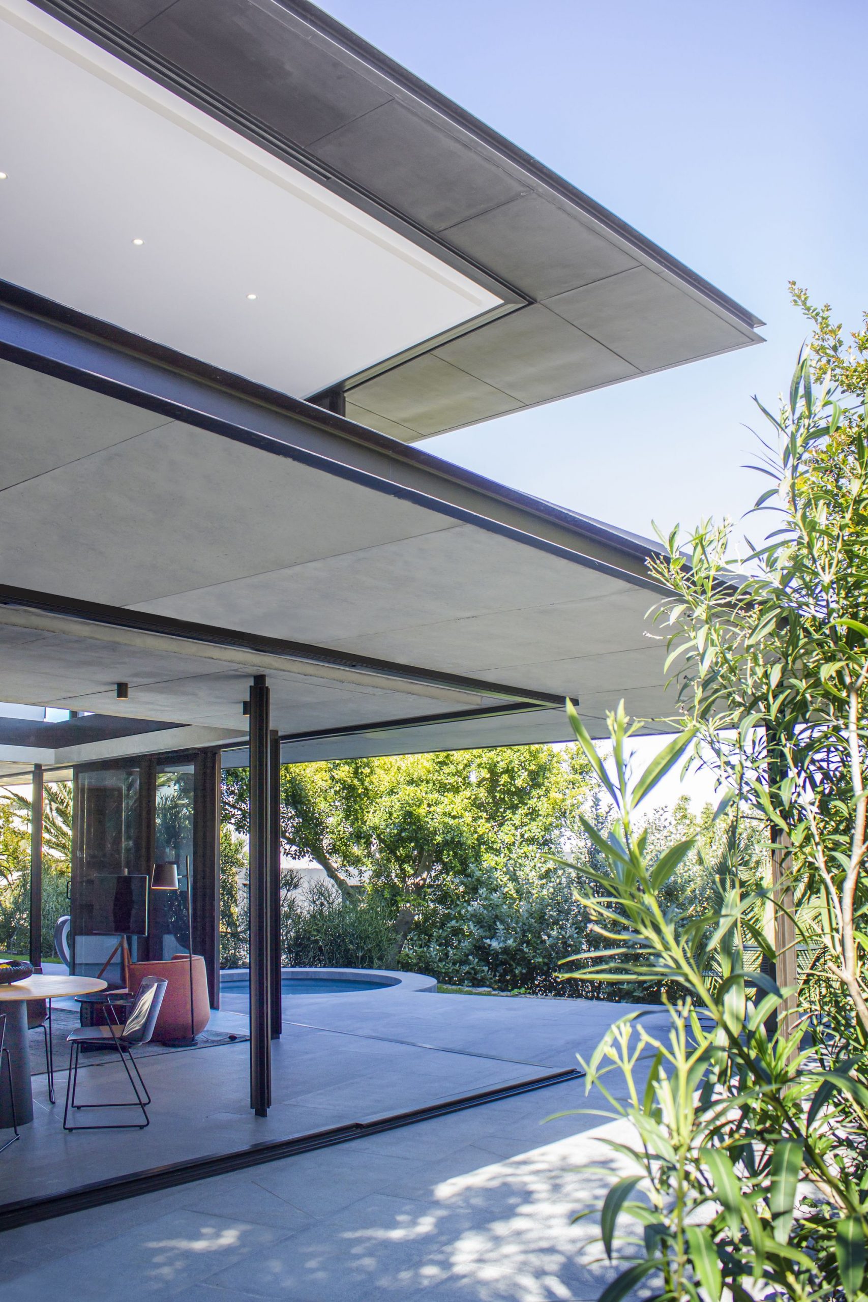 In keeping with the idea of a Pavilion, the threshold between interior and exterior gets blurred by means of large sliding aluminum doors that, when opened up, provide the sense of expanse into the external landscaped areas. Interior furnishings, form and selection of materials and colour are carefully orchestrated to work harmoniously together with the architecture complimenting the experience.