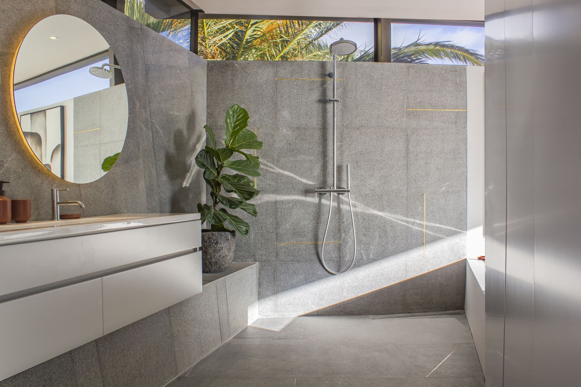 The choice of a dark palette in colour and materials is a reference to the main house with the earthy greys, black and bronze of the stone wall getting picked up throughout the building. The floor tiles subtly reinforce the geometries of the primary structural elements , whilst fragmenting the tiling pattern with the introduction of brass in-lays that extend vertically into the en-suite bathrooms that are accentuated by the late afternoon golden light.