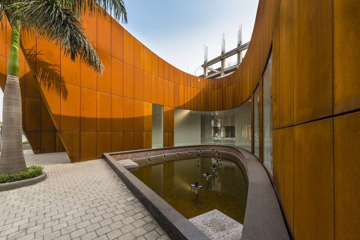 A curvilinear path along the courtyard links the office spaces while seamlessly integrating the internal circulation with a shallow pool of water within the courtyard. Built entirely in a steel frame structure with a metal roof and corten steel sheets forming the external walls, the entire office structure was completed within 3 months. The design creates an energy efficient building in response to the climate of the location and a distinct identity.