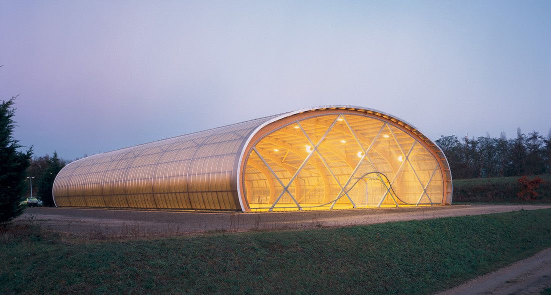 The multi-sport court of La Tourelle Secondary school was designed by Paris-based ECDM Architects in 2005. The court is included within a structure of successive arched cross-laminated timber frames and thin perpendicular ribs which intersect with the arches and hold them together. The entire structure is covered with a translucent material to diffuse the light without contrasting with the wood.
