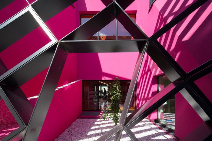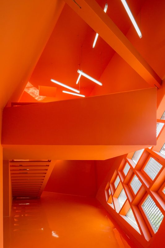 On the first floor, the building occupies the lot completely, but as the building rises, the form is ‘freed’ from the plot boundaries, twisting in reaction to the program within. The skewed volumes are like the energy that can hardly be contained, which translates itself on the interior of the building with similar shapes and a vibrant color palette.