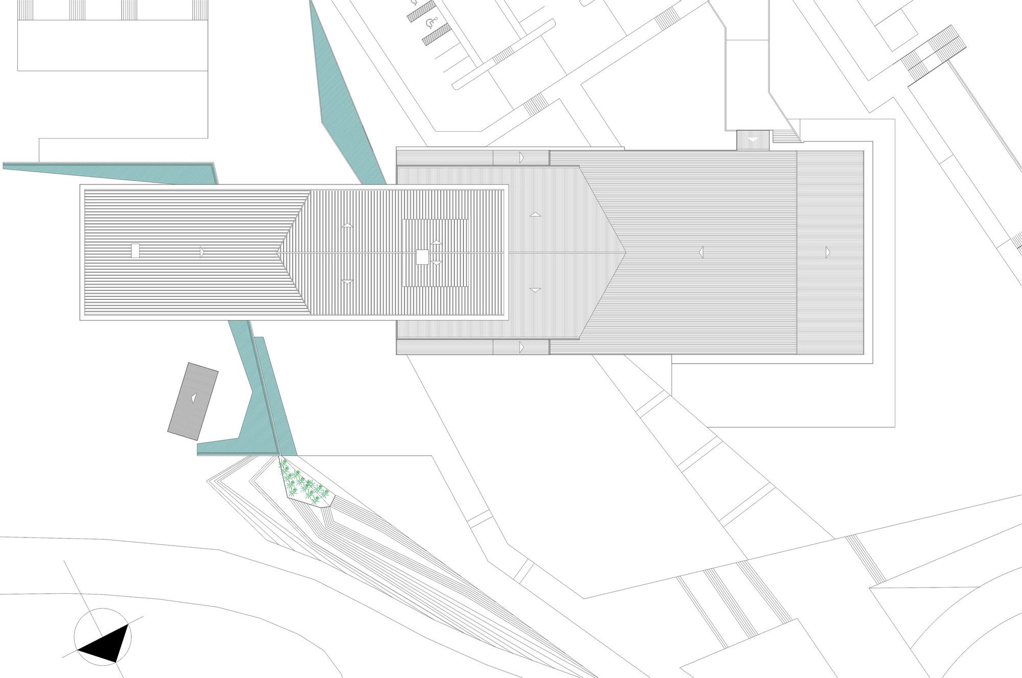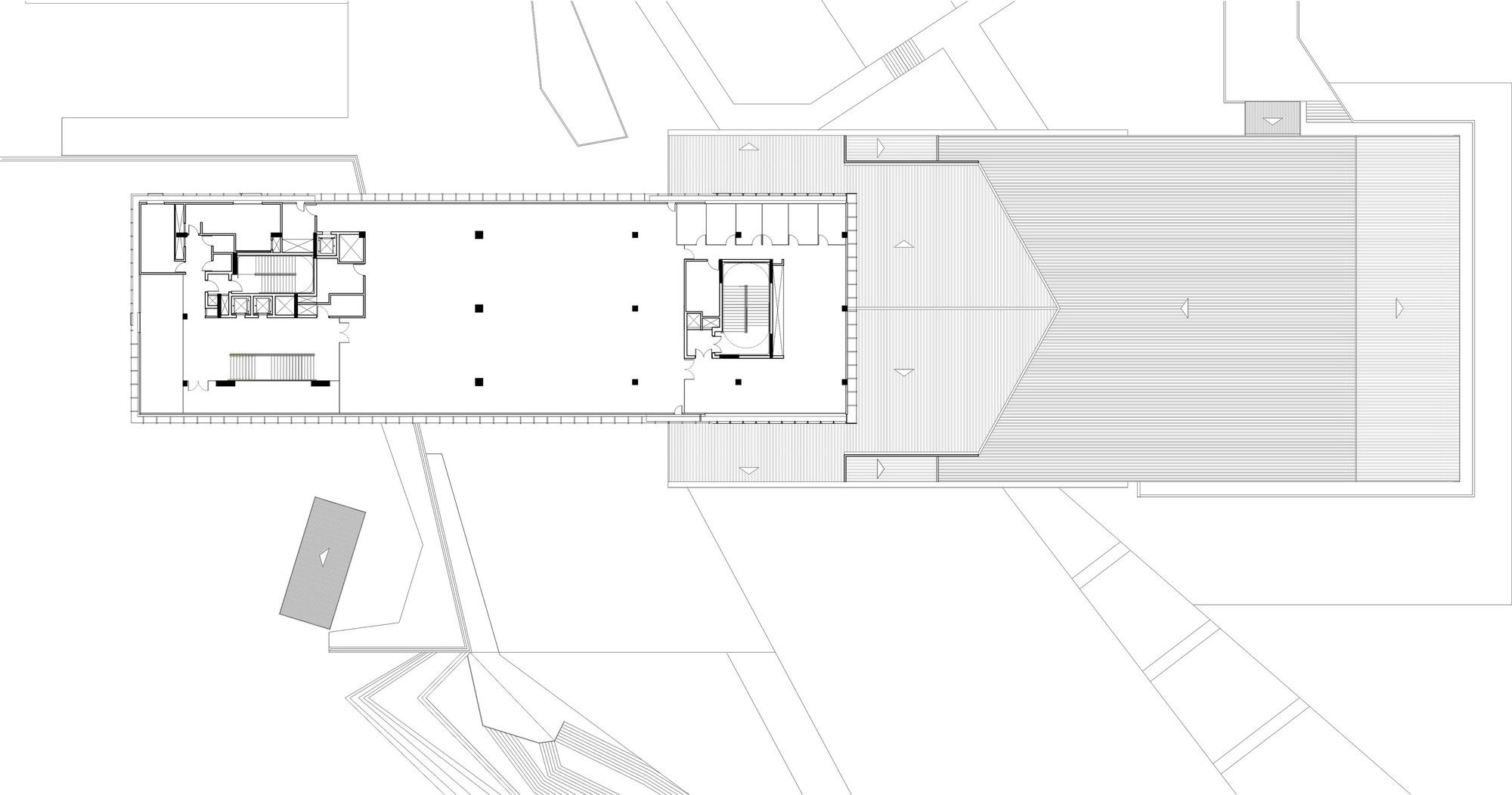 In the outer composition, the image with the greatest impact is the coated sheet metal box that houses the collection and is crossed beneath by the path that runs across. In this specific part, the box seems to float and protect. Its surroundings play a key role guiding the user to enter. Exciting outside, welcoming inside.