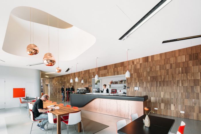 The foyer is the heart of the building, where the audience can meet one another and have post-show discussions. The space is animated by the dynamic positioning of the theatre in the building, especially with the warm glow of daylight bouncing on the wood surfaces throughout the day. The rounded form of the theatre is the first sight when entering the foyer. Its volume is disconnected from the floors and is emphasised further by the lofty void surrounding it.