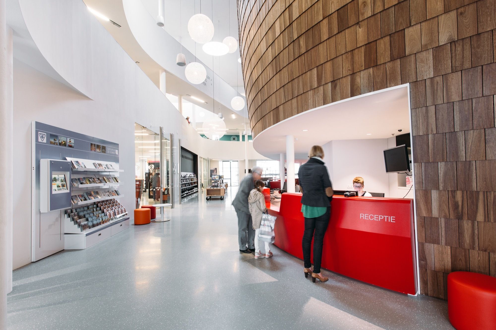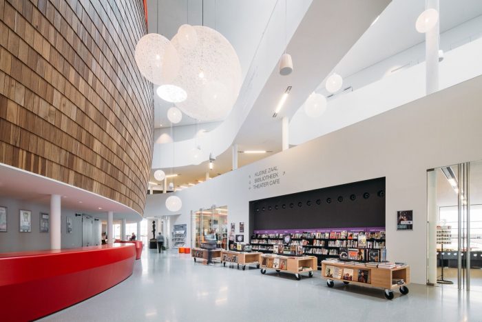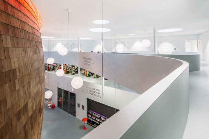 The Klinker Cultural Centre was given a lively exterior to reflect the expressive nature of its programs. Its central location in Winschoten makes it easily accessible to the residents who can enjoy the cultural offerings of the theatre, arts centre, radio studio and library, or savour a coffee in the theatre café. In this way, residents themselves actively contribute to their city’s cultural life.It functions as a juncture between the small-scale buildings of the historic inner city and the larger scale of post-war developments and renovations. The adjacent city centre is characterised by double-storey masonry houses made of local Groningen clay. The reduced scale is emphasised by the horizontal bands that split and join as they move around the building. Major characteristics of the building are its richly detailed vertical masonry and deep, sloping window recesses which lend the building a strong and bold appearance. Different types of bricks were specially designed for the project and produced in traditional orange Groningen clay. The technical zones in the plinth also reflect a connection to the surroundings. The raw, brown/orange ends of the building feature CorTen steel surfaces perforated with the contours of Groningen’s landscape.