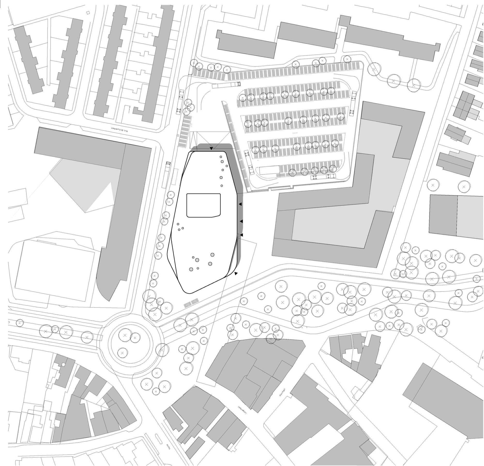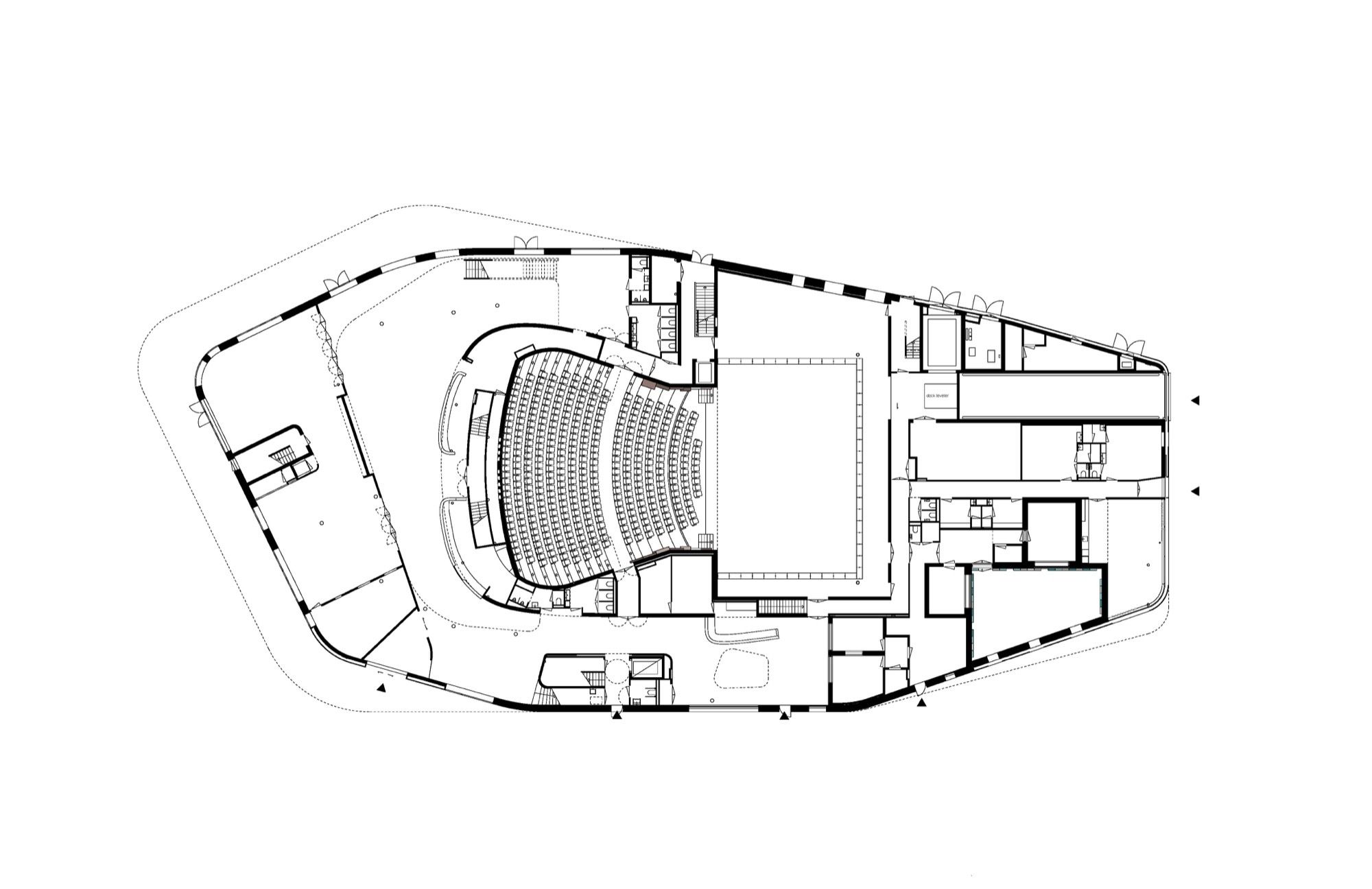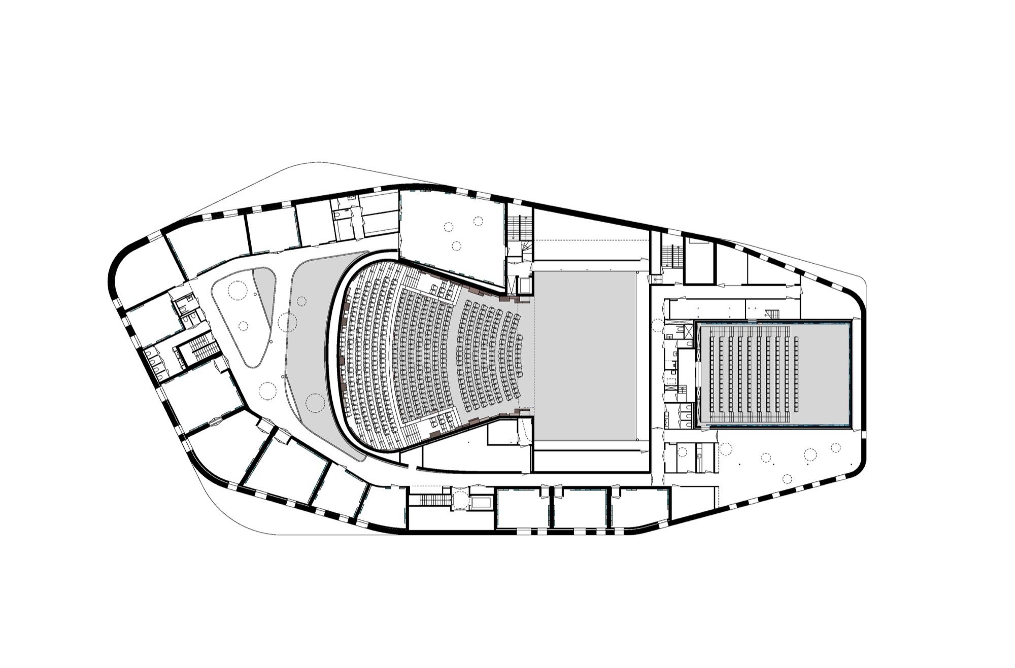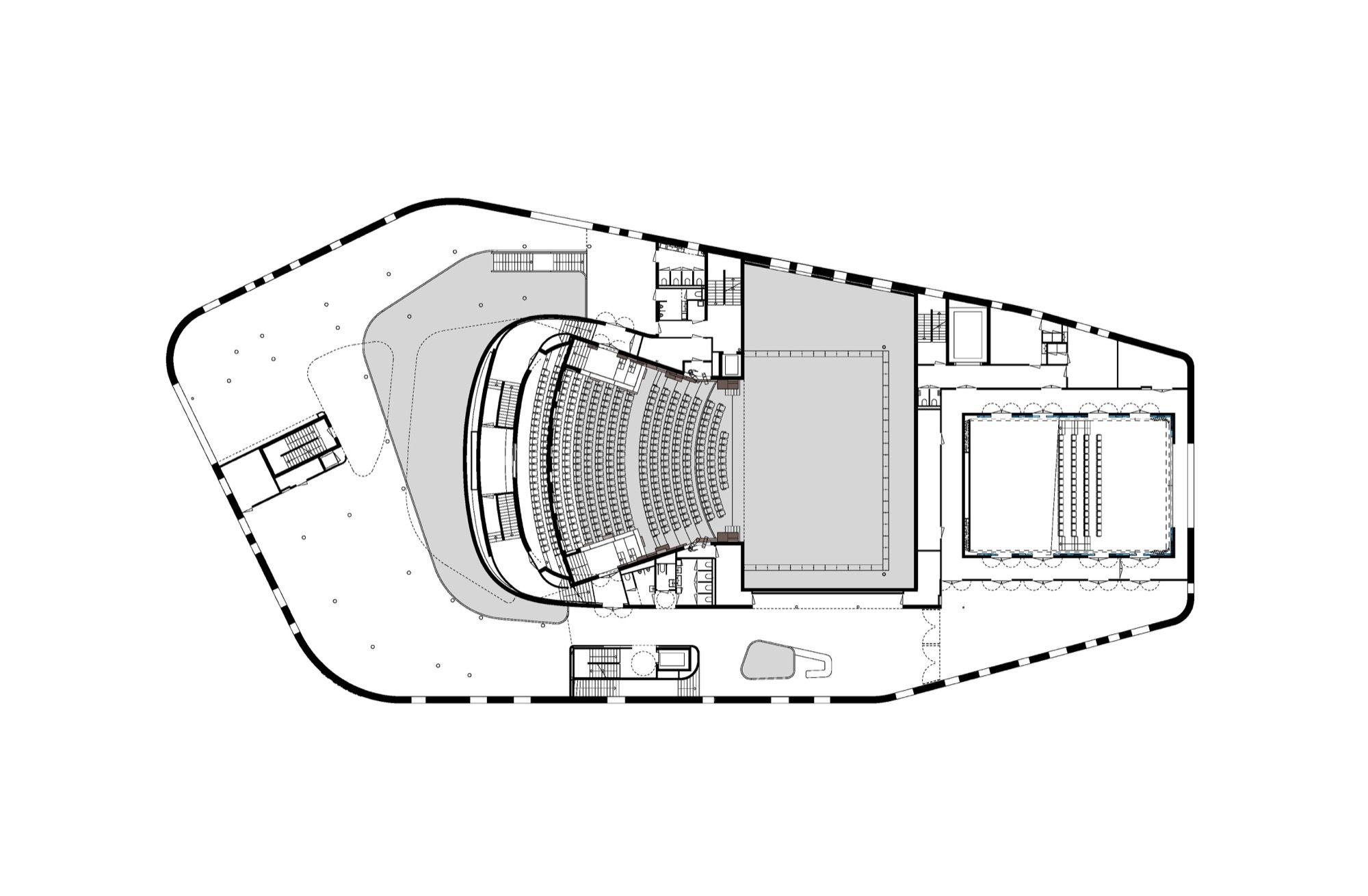 The central positioning of the theatre forms a natural division between the public and private zones. Backstage functions are grouped around the stages of the two theatres. The loading zone is designed with a simple screen that ensures privacy for the artists and technicians. Offices are also connected to the backstage zone. The goods lift is accessible externally and from the loading zone.