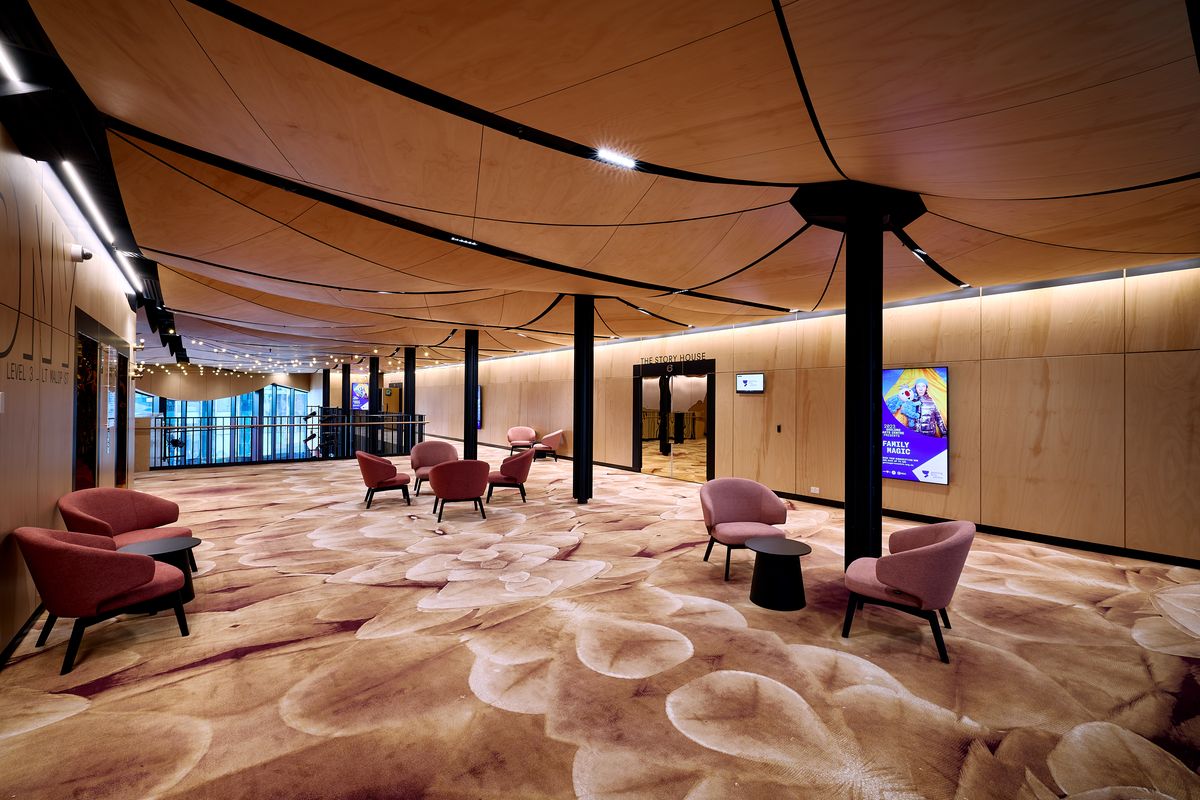 Tarryn Love’s art adorns the 550-seat theater, showcasing her focus on yoowak (the night) through timber wall panels. Tattoo artist Gerard Black’s creation, influenced by his upbringing in Wadawurrung Country, graces the ground-floor restaurant with an art piece depicting eels in motion through the water. Musician Mick Ryan contributed a soundscape that captures the essence of the Moonah forest, employing an array of instruments and natural elements. Textile artist Kait James’ works pay homage to souvenir Aboriginal tea towels from past decades, with her art digitally transferred onto metal panels adorning the building’s façade.