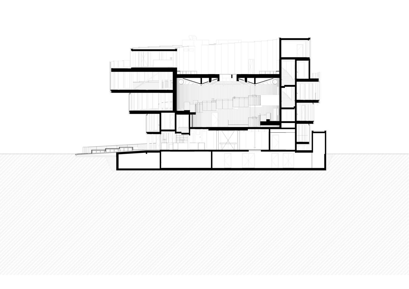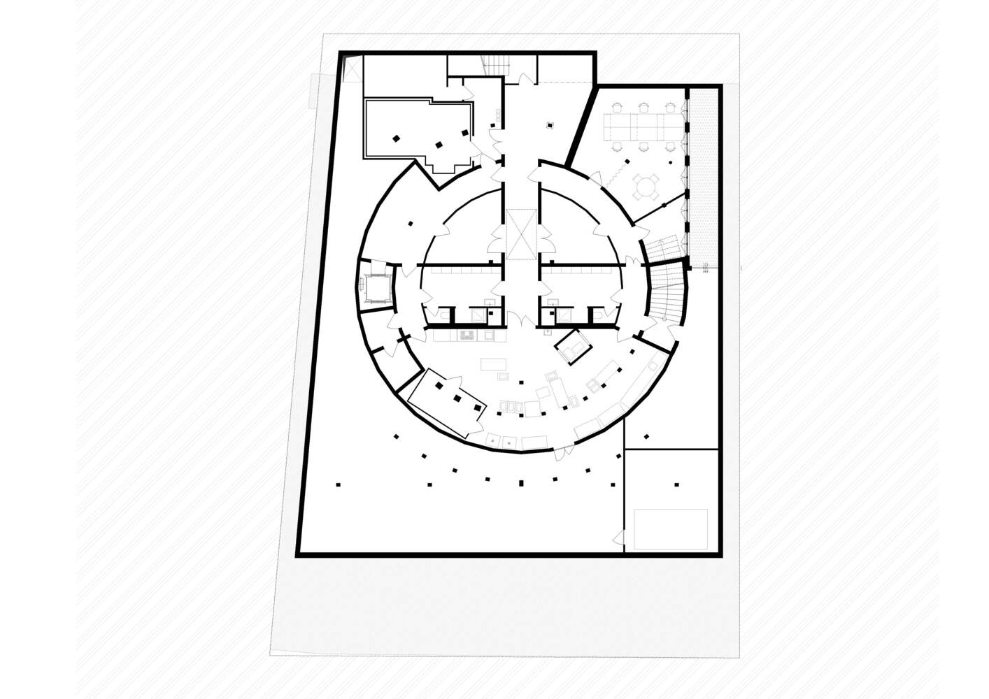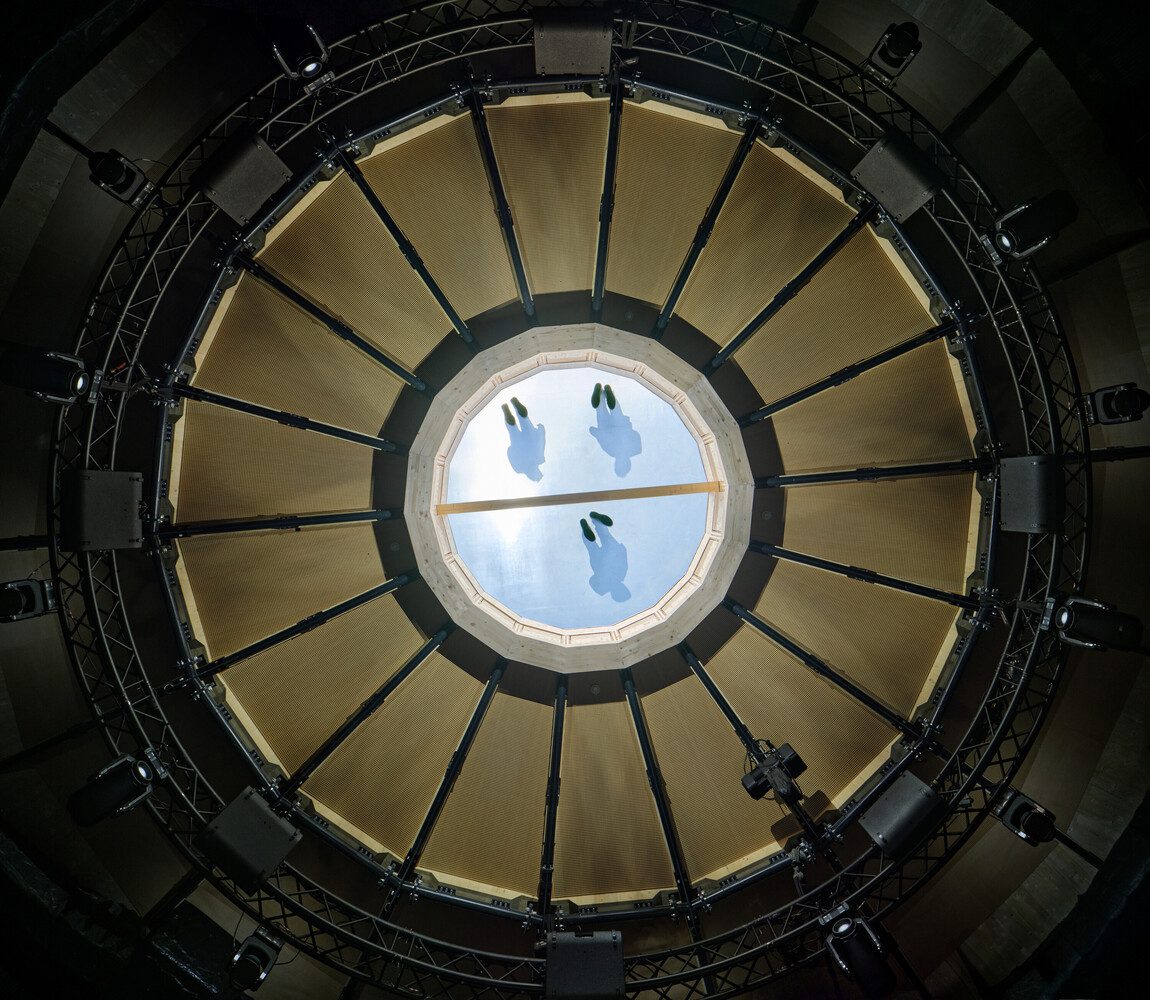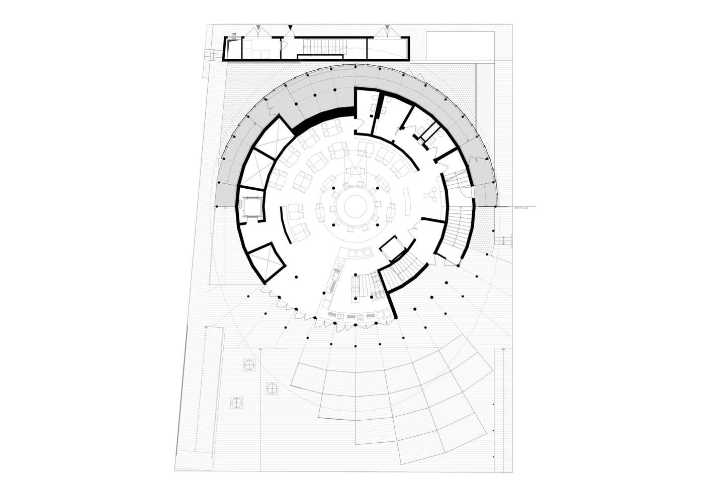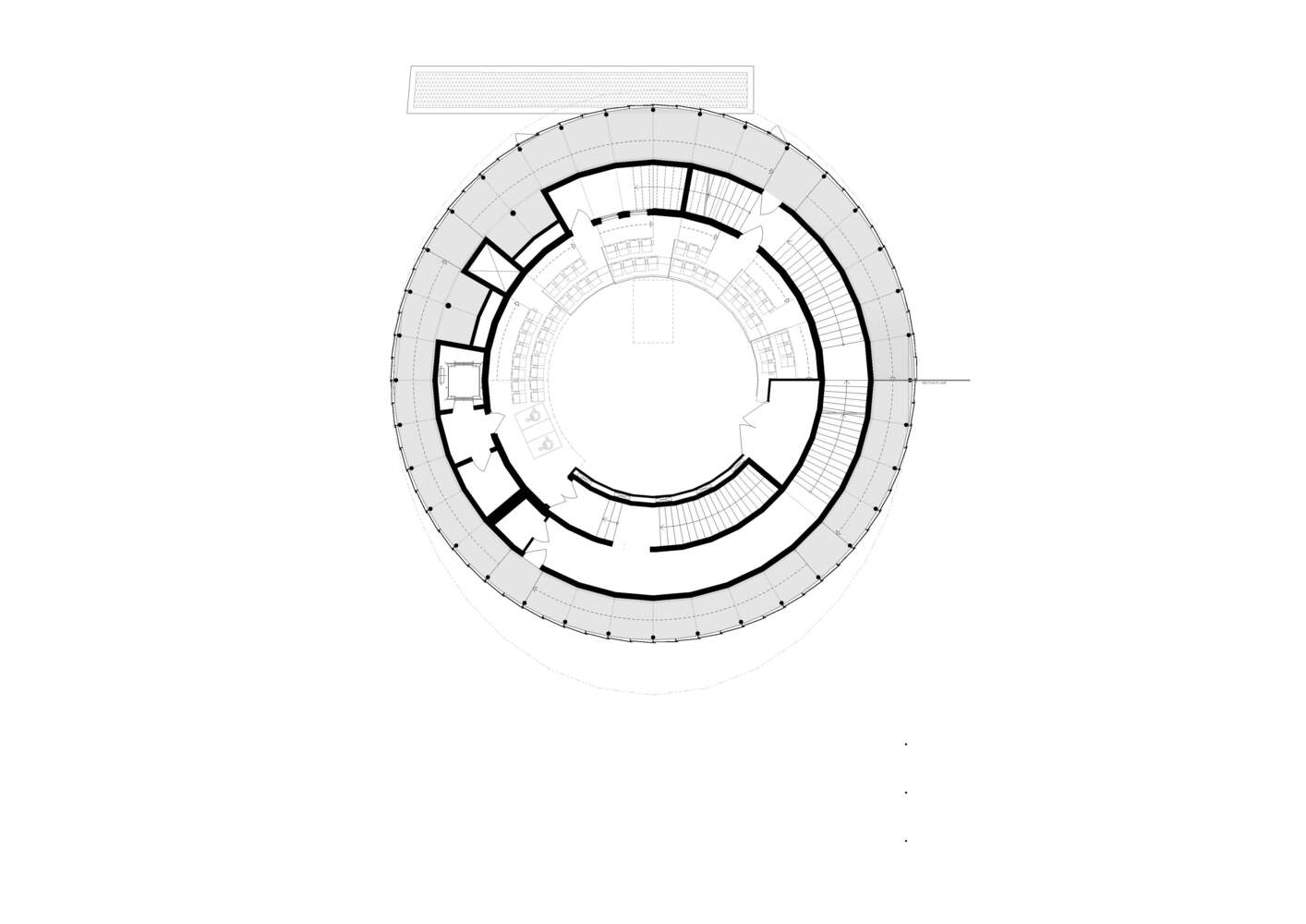 Together, they create a space that connects the movement of body and mind. At the very top, twelve metres above the ground, a ramp leads to a spacious observation deck. This ends in a distinctive rooftop “crown”, where the VIP Lounge is located. From here, not only does a panorama of the calm sea open up, but also a breathtaking view through the glass skylight directly down into the auditorium. The final chapter of the exhibition and the visitor’s imaginary journey through the pavilion is the staircase from the observation deck back down to the ground. It is set into the cavity of the double walls of the cylinder, which leads to the ground floor with a restaurant where people can enjoy Czech gastronomy. Next to the visitor staircase from the observation deck to the ground floor, a second staircase winds through the inner tube and serves as an auditorium. The staircase connects the auditorium stands, the restaurant on the ground floor, and the VIP lounge. The ingenious composition of the two staircases ensures a clear separation of the exhibition and multifunctional hall operations. Wheelchair access is provided by a lift in the western part of the building.