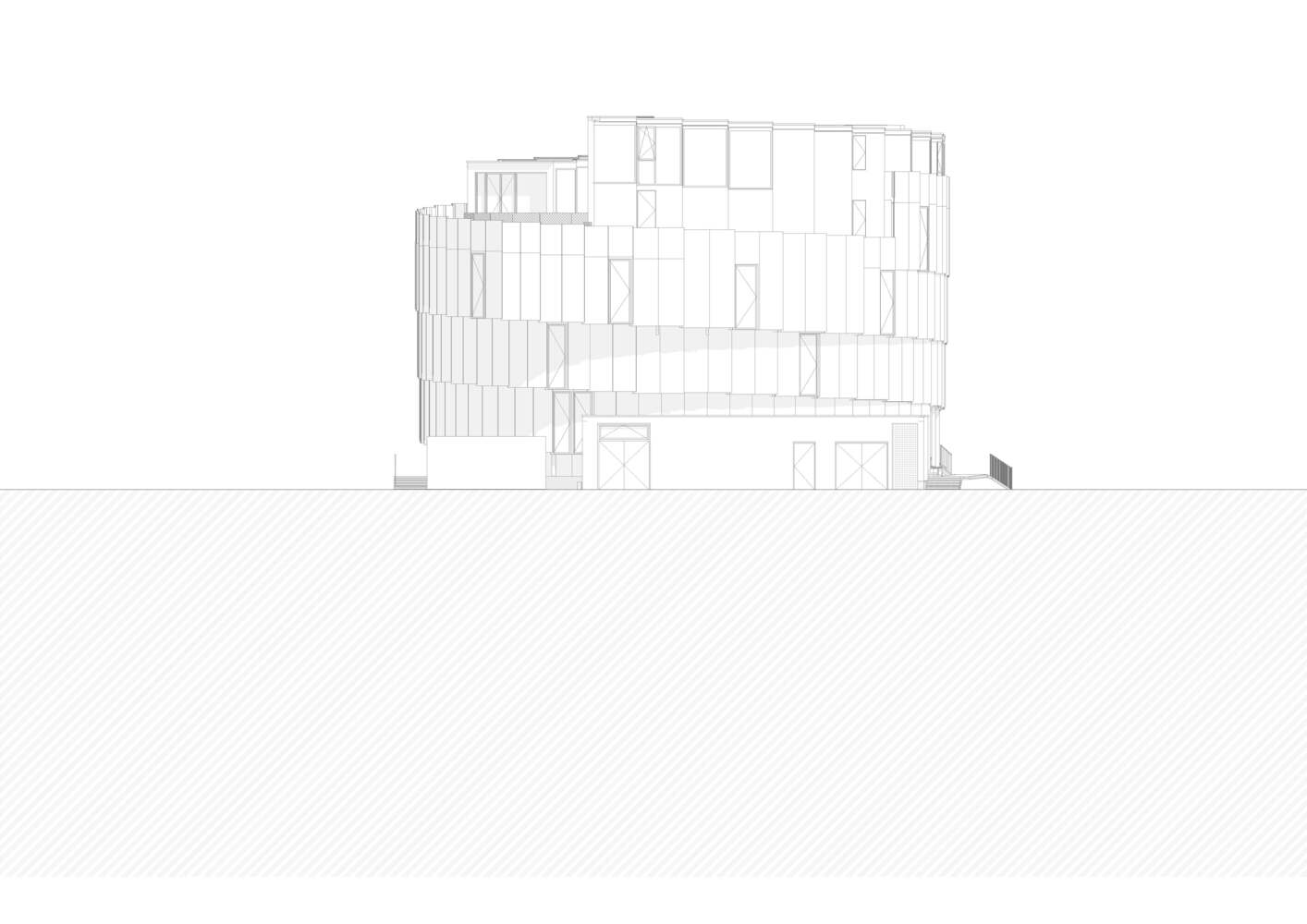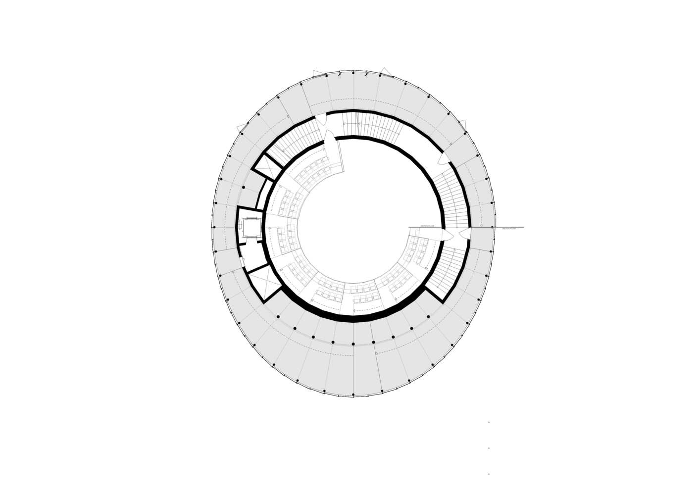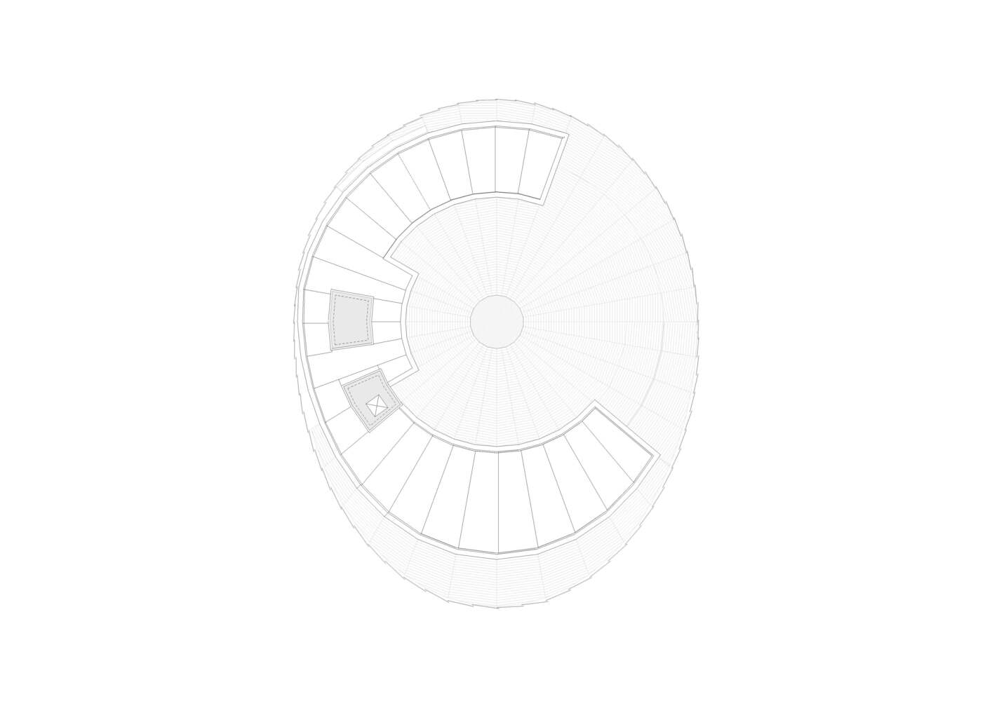 The spiral of the visitor path encircles the central tube of the multifunctional hall – the auditorium. This space at the heart of the pavilion, with an internal diameter of 15.5 metres, rises 12 metres above the ground and will be used for cultural performances, lectures, and other programmes. It is designed as a black box. A ramp with seats in the auditorium follows the perimeter of the visitor path, with the auditorium and gallery connected in several places. This allows these spaces to be variably separated or seamlessly connected according to current needs. The ceilings and exposed structures are left exposed in wood. The load-bearing structure consists of a system of cross-laminated spruce CLT panels that form a central auditorium truss with embedded staircases and an elevator. The core of the house is completed by horizontally laid slabs. They help to shape the exhibition spiral outwards and the balconies of the multifunctional hall inwards. The building reaches a height of 16 metres and is divided into 36 segments. The individual segments form a circle on the lower floors, on the higher floors they smoothly transition into an ellipse, defining the envelope and mass of the pavilion. The space in front of the pavilion is designed as a wooden deck with boxes where visitors and passers-by can sit and contemplate.
