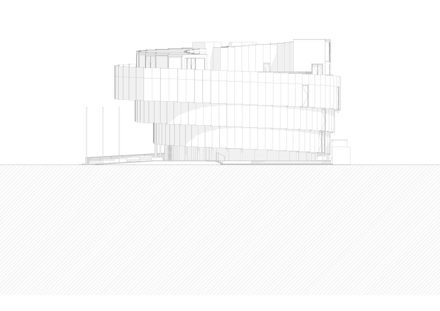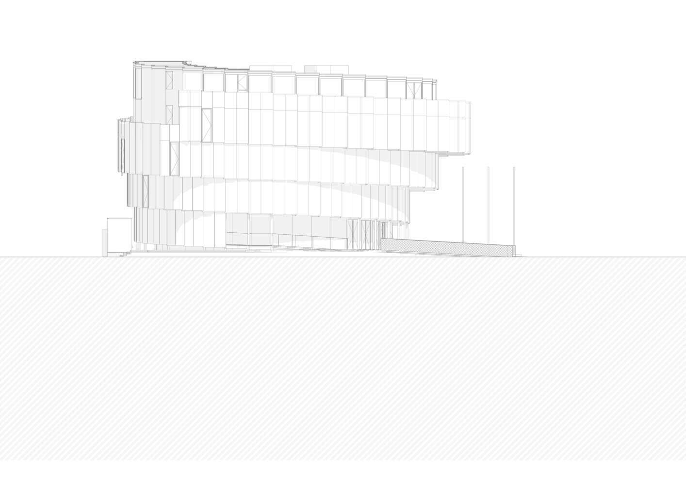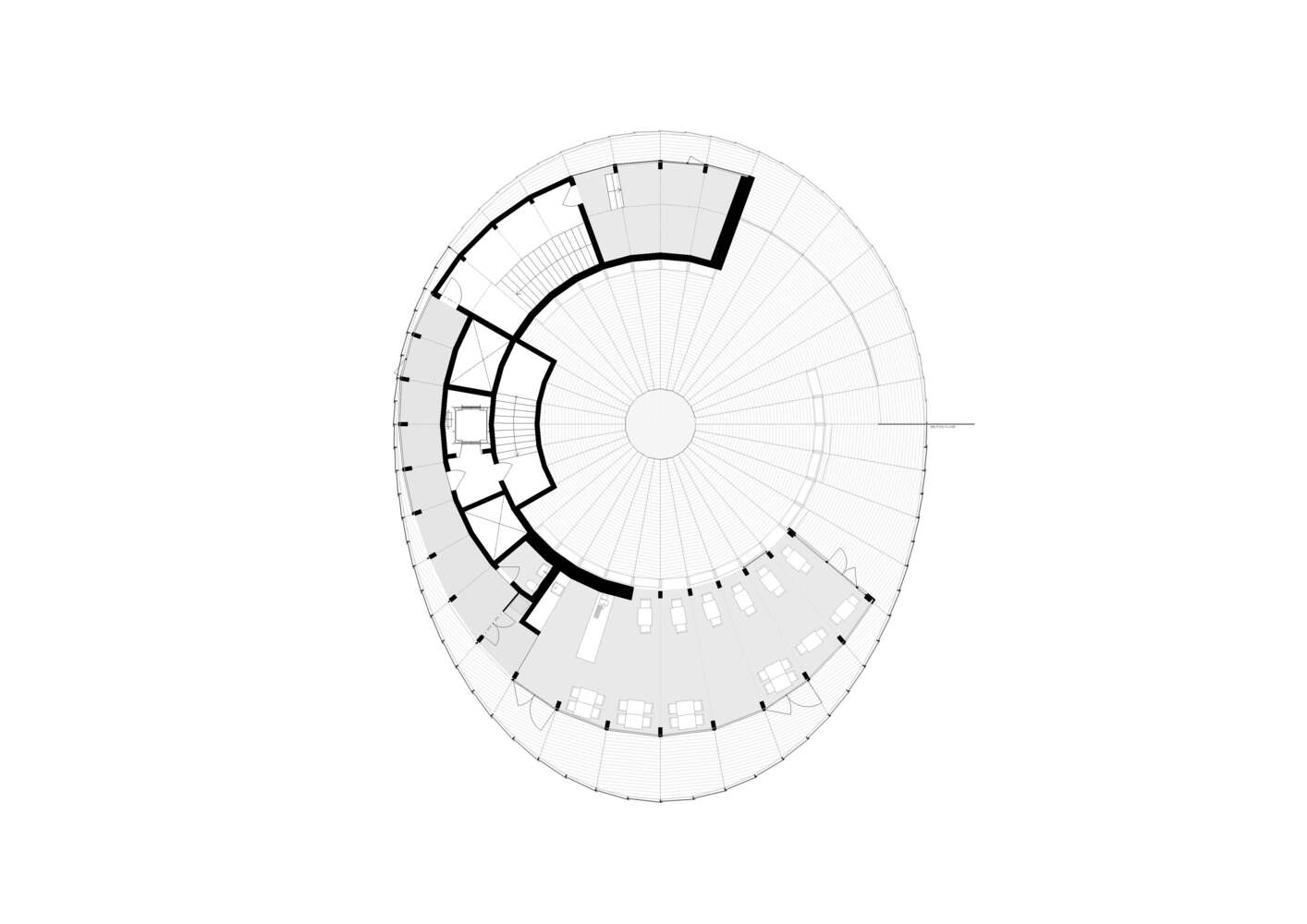 The spiral of the visitor path encircles the central tube of the multifunctional hall – the auditorium. This space at the heart of the pavilion, with an internal diameter of 15.5 metres, rises 12 metres above the ground and will be used for cultural performances, lectures, and other programmes. It is designed as a black box. A ramp with seats in the auditorium follows the perimeter of the visitor path, with the auditorium and gallery connected in several places. This allows these spaces to be variably separated or seamlessly connected according to current needs. The ceilings and exposed structures are left exposed in wood. The load-bearing structure consists of a system of cross-laminated spruce CLT panels that form a central auditorium truss with embedded staircases and an elevator. The core of the house is completed by horizontally laid slabs. They help to shape the exhibition spiral outwards and the balconies of the multifunctional hall inwards. The building reaches a height of 16 metres and is divided into 36 segments. The individual segments form a circle on the lower floors, on the higher floors they smoothly transition into an ellipse, defining the envelope and mass of the pavilion. The space in front of the pavilion is designed as a wooden deck with boxes where visitors and passers-by can sit and contemplate.